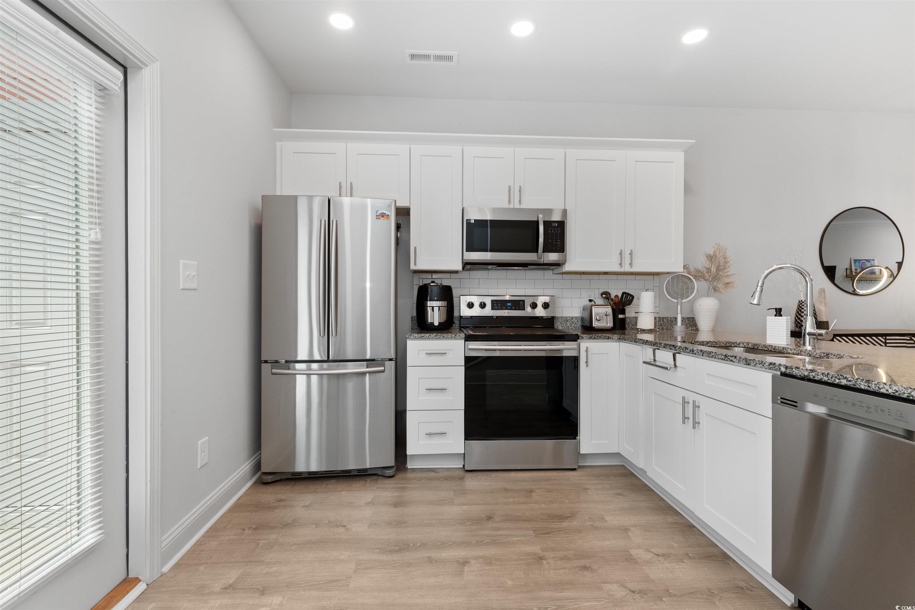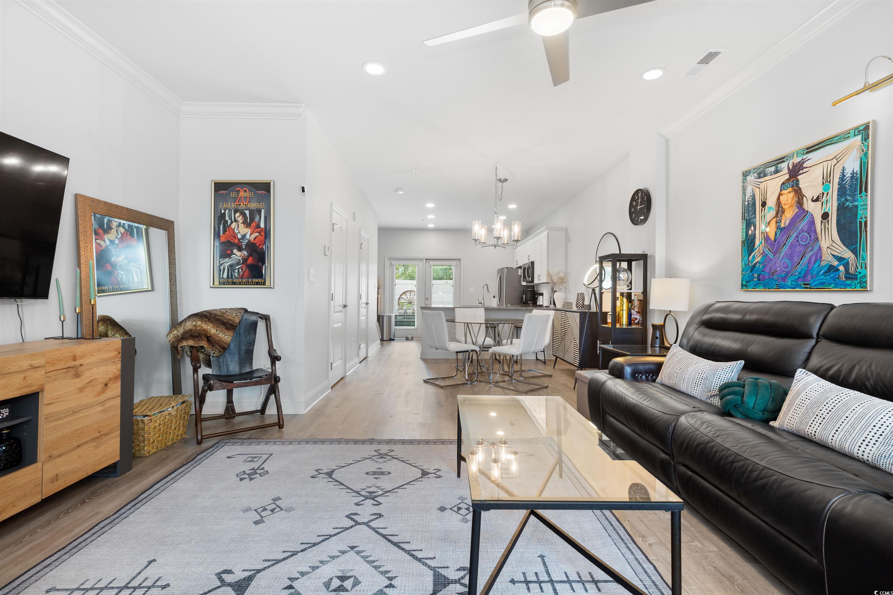 Welcome to 763 Moen Place, a thoughtfully designed 2 bedroom, 2.5 bathroom townhome in the desirable High Market community at Market Common. This move-in-ready residence combines style, comfort, and location, creating the ideal setting for anyone who values both convenience and connection. As you enter, you are greeted by an inviting open floor plan with tall ceilings, luxury vinyl plank flooring, and abundant natural light streaming through the windows. The living room flows into the dining area and kitchen, where youll find granite counters, soft close cabinetry, recessed lighting, and stainless steel appliances. A half bath on the first floor adds comfort for guests, while a private courtyard out back provides the perfect escape for morning coffee or evening relaxation. Unlike many other units in the community, this one offers a larger patio area, a rare find that gives you more space to relax or entertain. The additional storage space makes everyday living even easier. Upstairs, two private bedrooms each feature their own bathroom and dual closets. The primary suite feels especially spacious with its elevated ceiling and direct access to a private balcony, a rare find in this community. Both bathrooms include beautifully tiled showers, creating a sense of calm and retreat. Life at Market Common means more than just a home. Stroll to neighborhood shops, cafes, and restaurants, spend the afternoon at nearby parks and walking trails, or head to the beach just minutes away. Fitness centers, grocery stores, a dog park, and even educational opportunities at Horry Georgetown Tech and the Culinary Institute are all within reach. 763 Moen Place offers the best of coastal living with a lifestyle that is as vibrant as it is convenient. Come see for yourself why this townhome is the perfect place to call your own.