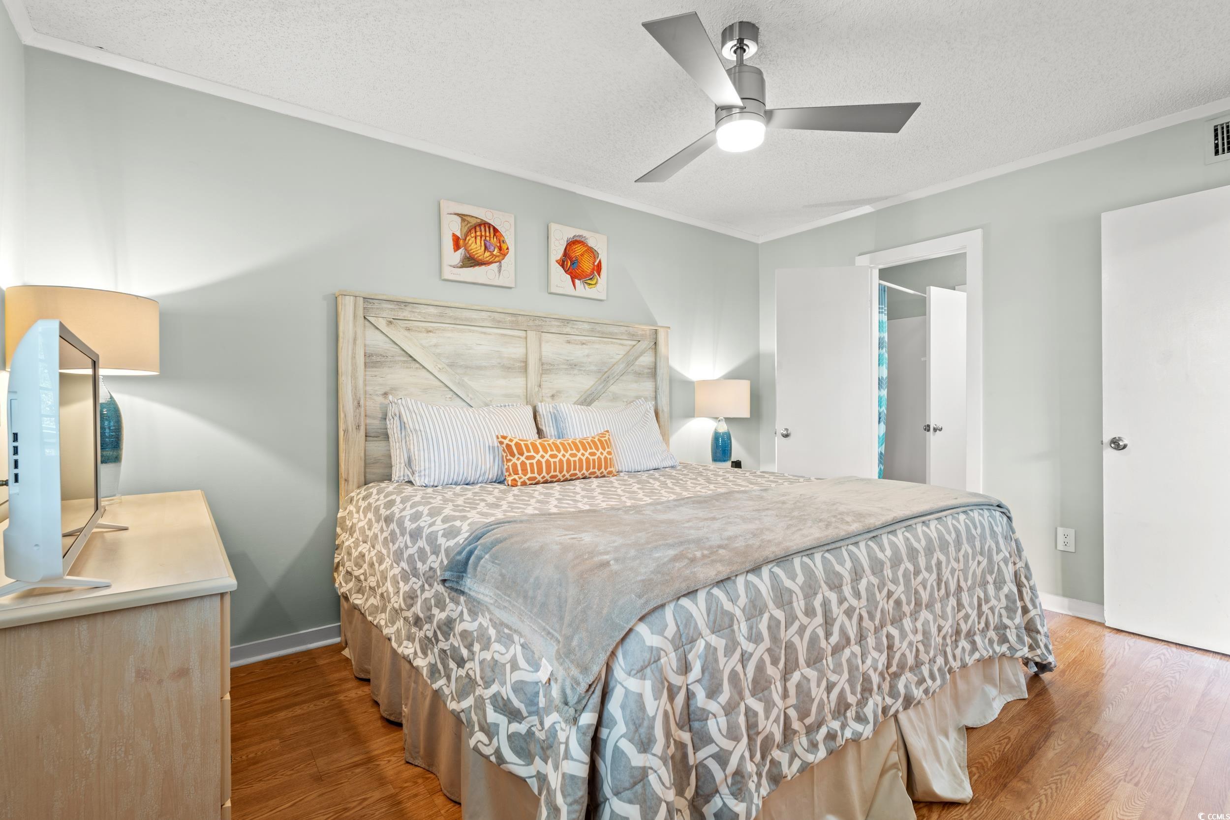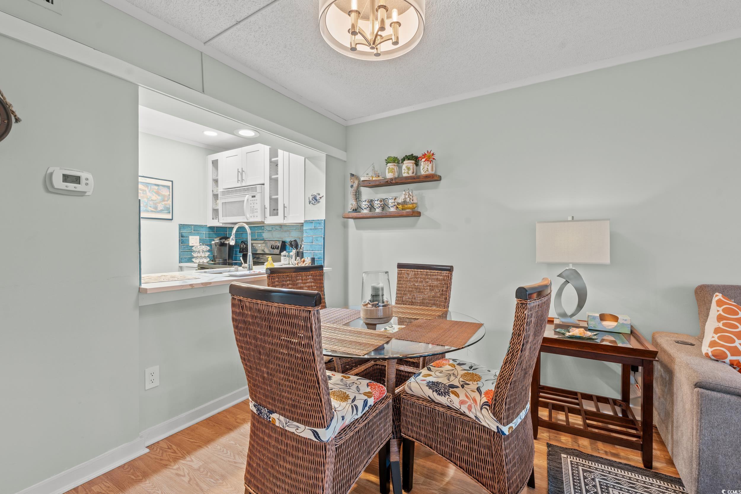 This is a lovely condo with an amazing location, sitting in the middle of a 57-acre oceanfront resort community. Located within steps of the Four Seasons restaurant, bar lounge, courtyard, outdoor pool, indoor pool and most especially the BEACH. This unit has some very nice upgrades, like plantation shutters in the bedroom and foyer, the kitchen has new shaker cabinets, with a beautiful blue subway tile backsplash, quartz countertops along with a new sink and faucet. The bathrooms have updated vanities, mirrors, lighting and faucets. LVT flooring runs throughout this units except for the baths and kitchen, which are a large ceramic gray tile. This unit overlooks the pool area, beautiful trees and landscaping. Ocean Creek has beautiful, manicured grounds, pools, tennis courts, a pickleball court, putting green, playground and an oceanfront beach club. The beachfront here is amazing and a ""must see!"" Ocean Creek is just a short walk away from the wonderful activities at Barefoot Landing, along with the other popular activities of Myrtle Beach. If peace and quiet is your desire, Ocean Creek offers that escape for you too. All figs and Sq ft are approximate