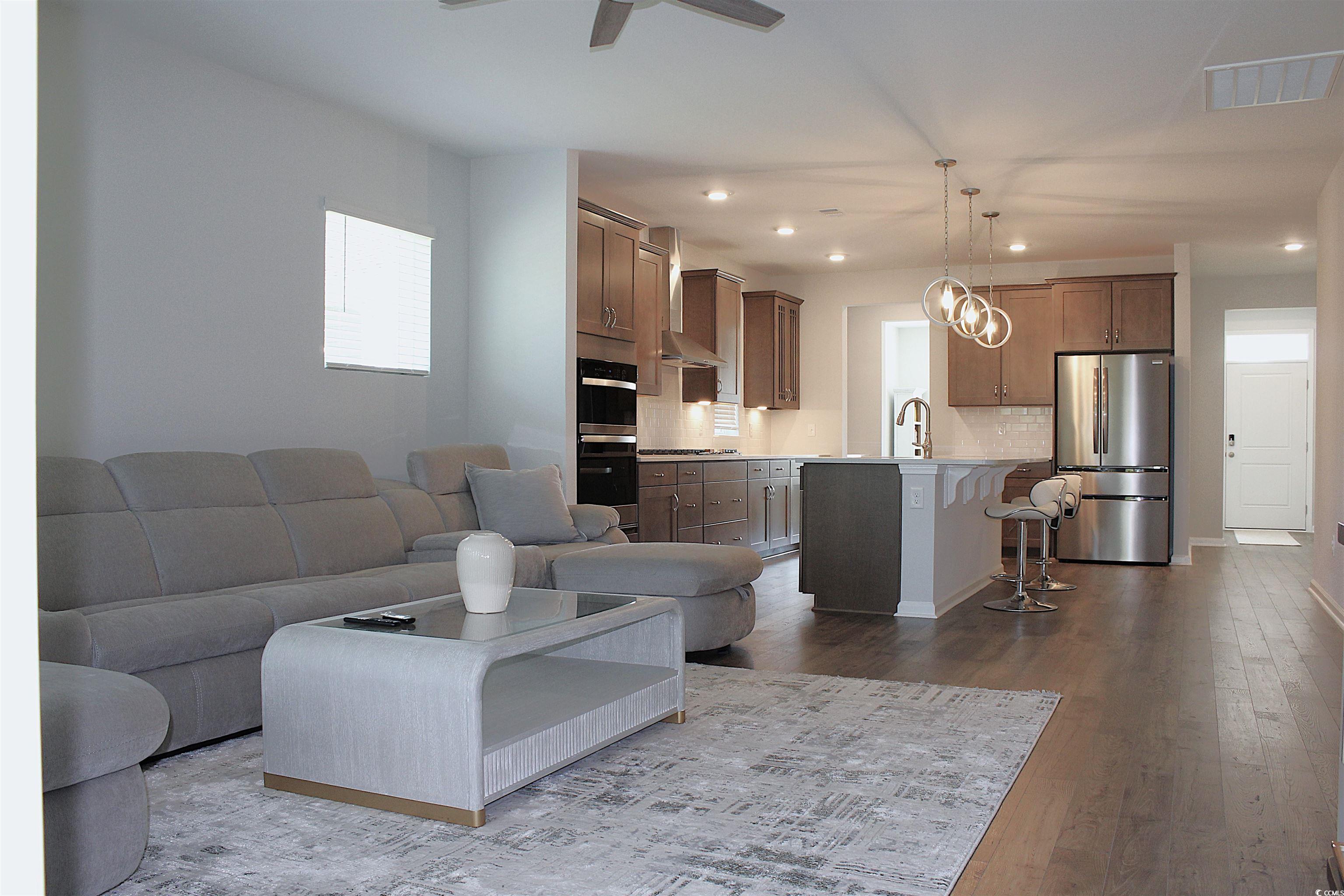 This popular Beazer's Hickory model (built in April 2025) features an open floor plan with 3 bedrooms and 2 full bathrooms, all on one level. Entrance through an open foyer with a tray ceiling.Family style dining room with easy access to thekitchen.The GourmetKitchen offers Golden Gate quartz counter tops, whitesubway backsplash, large island/breakfast bar with beautiful pendant lights, upgraded 42"" Maple Burlap soft closing cabinets with under cabinets lighting and roll-out drawers, gas cooking range topwith stainless steel exhausthood,and stainless steelappliances (Frigidaire refrigerator, Whirlpool appliances including 3 rack dishwasher, a built-in microwave and oven double-stacked). Walk-in Butler pantry with wooden shelves and beautifully engraved glass door. Enjoy a spacious living room with access to the rear screened porch. Private and quiet back yard backs up a wooded area and has a 17' x 11' patio. The luxurious master suite features a spacious bedroom, overlooking the private back yard and a large zero entry walk-in shower with dry-off bench, complete with a rain shower fixture, brushed nickel plumbing fixtures throughout, a water closet , double vanity, linen closet and walk-in closet with built-in shelves. Remote controlled ceiling fans! Plenty of closet space. 2 car garage with tankless water heater, garage door opener and""ready to go plumping"" for a sink. Mud room. Laundry room with a utility room/closet.Mohawk laminate hardwoodflooring (nutmeg chestnut color) in the main living areas, and tile in the baths & laundry.This Energy Star certified home will be saving you money for years to come. 9ft Ceilings! Harborview is a natural gas and gated community conveniently located near the Intracoastal Waterway, shopping, dining and 3.5 miles from the beach. Top rated Carolina Forest school district. The amenity center features a jr. Olympic sized pool and owners clubhouse.