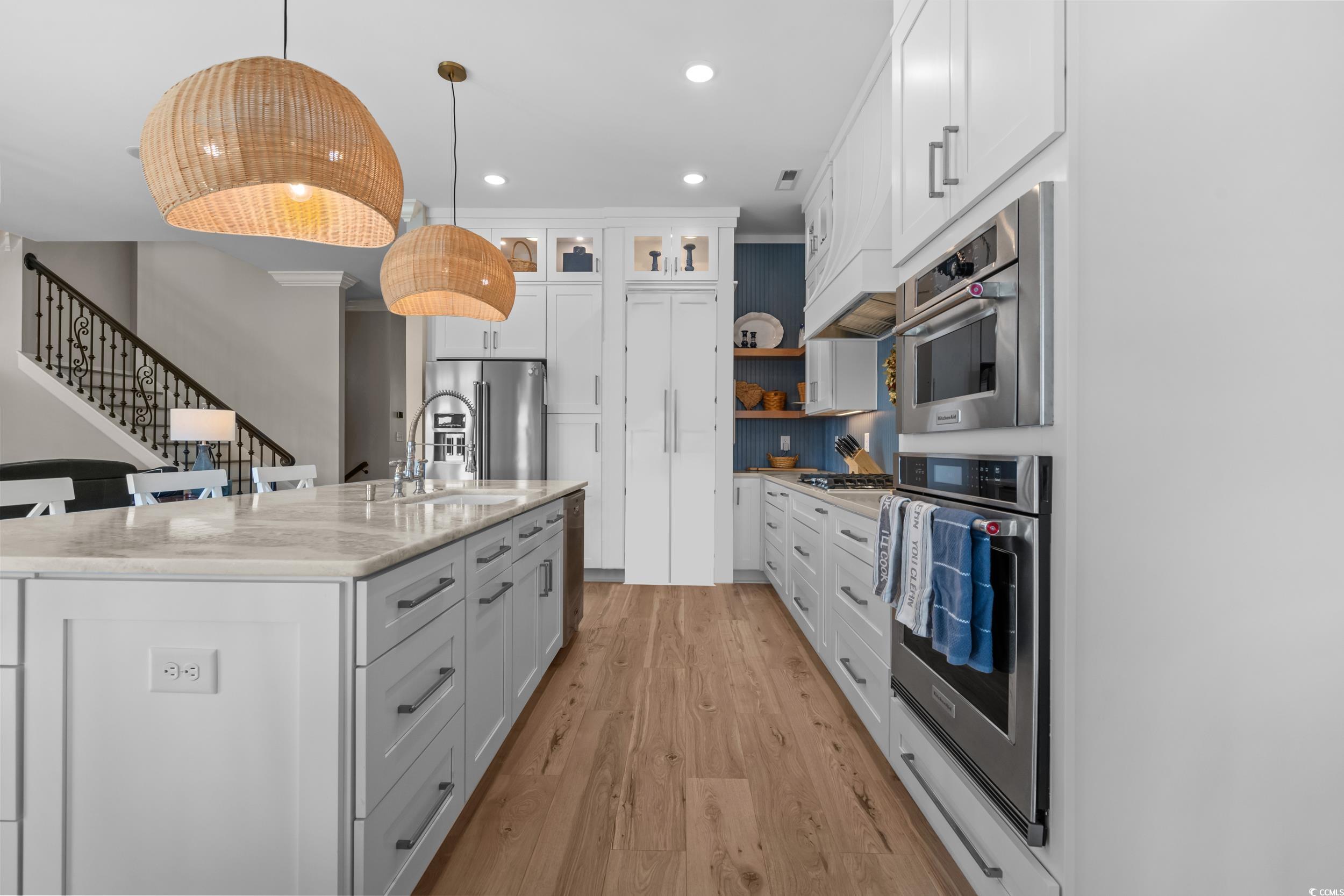 Discover waterfront luxury in this stunning 4-bedroom, 4-bathroom masterpiece nestled in the prestigious Waterway Palms community on the Intracoastal Waterway. This completely renovated home features a beautiful gourmet kitchen completed in July 2023 with premium KitchenAid appliances, stacked cabinetry, quartz and granite countertops, and a hidden butler's pantry with pot filler - perfect for both everyday living and entertaining. Luxury vinyl plank flooring flows seamlessly throughout the home, enhanced by soaring 9' to 10' ceilings and upgraded LED fixtures that create an open, airy atmosphere. Step outside to your private saltwater pool with cool deck and HVAC heater/cooler, ideal for year-round enjoyment. The newly constructed floating dock offers prime waterfront access with space for a future boat lift, making this a boater's dream. Premium features abound throughout this exceptional home, including a residential elevator for easy access between floors, built-in outdoor kitchen with Lion grill, Rinnai tankless water heater, spray foam insulation, and backup propane generator for peace of mind. The oversized 2.5-car garage includes a Tesla charger, while thoughtful touches like the direct vent propane fireplace with reclaimed railroad tie mantle, professional dog turf, and irrigation system complete this waterfront retreat. Experience the ultimate coastal lifestyle in this prestigious gated Intracoastal community featuring resort-style amenities including direct Intracoastal access, community pool, boat dock and ramp, tennis courts, and convenient access to hospitals, restaurants, Coastal Carolina Community College, and our lovely sandy beaches.