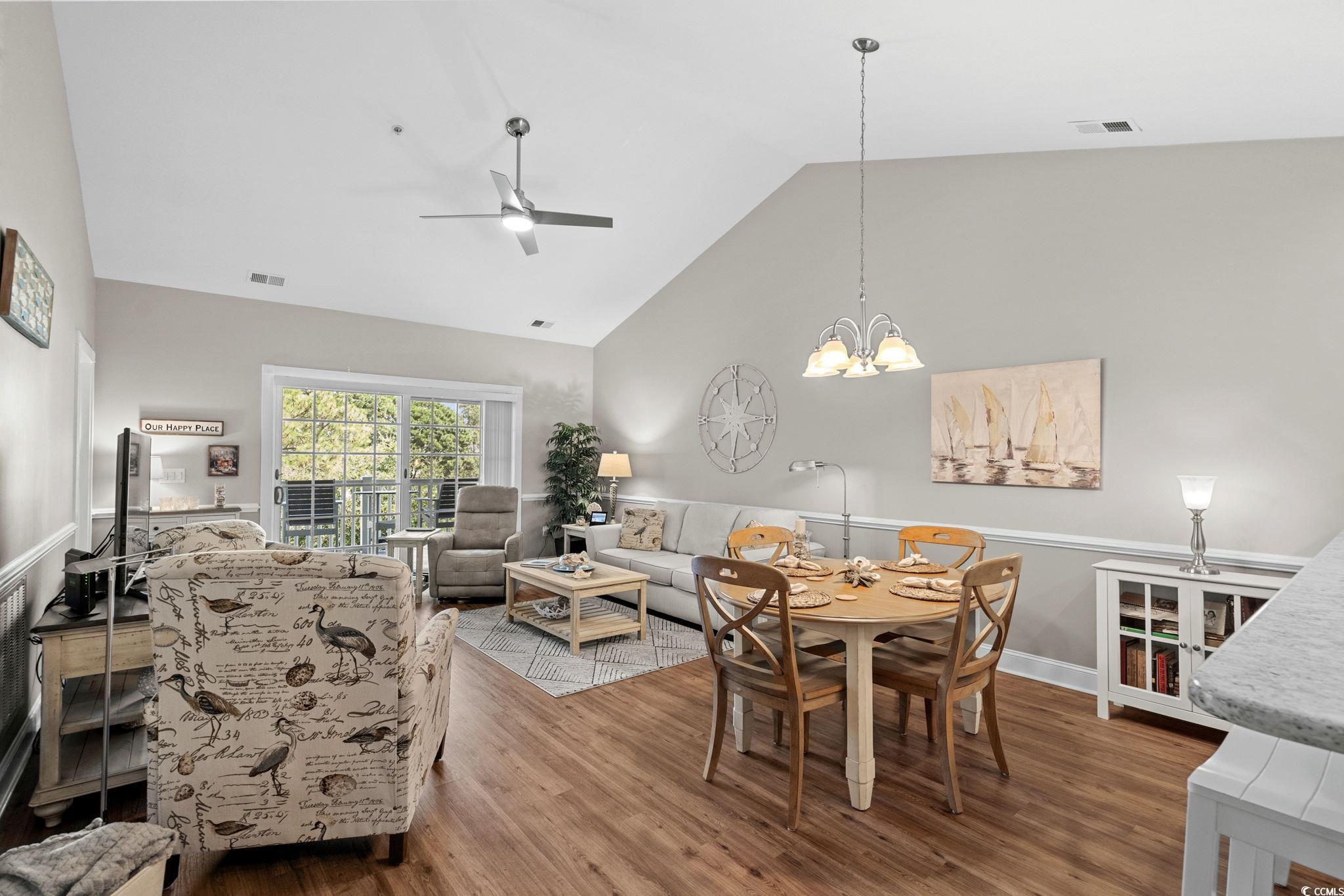 TOP FLOOR UNIT, ELEVATOR BUILDING, INCLUDED ONE CAR GARAGE, GOLF COURSE VIEWS!! Welcome to this updated 2 bedroom, 2 bathroom top-floor condo located in the highly desirable Magnolia Pointe community in Myrtle Beach. This inviting residence is the perfect combination of comfort, convenience, and coastal lifestyle, complete with the rare bonus of a private one-car garage. Inside, youll immediately notice the open and airy layout, enhanced by vaulted ceilings and abundant natural light and access to your private balcony. The kitchen is a true highlight, featuring crisp white cabinetry, elegant quartz countertops, stainless steel appliances, and a raised breakfast bar ideal for casual dining or entertaining. The kitchen flows seamlessly into the dining and living areas, where neutral tones and luxury vinyl plank flooring provide a modern and low-maintenance design. The living room opens to a private covered balcony overlooking the golf course, creating a peaceful retreat to enjoy your morning coffee or unwind in the evenings. The spacious primary suite is a relaxing escape with a vaulted ceiling, a charming bay window that provides space for a sitting area or desk, and an en-suite bathroom complete with a walk-in shower and updated vanity. The guest bedroom is equally inviting and located next to a second full bathroom with a sleek shower as well. Whether youre hosting guests, working from home, or enjoying quiet evenings, this condo provides the ideal layout and function. Step outside to enjoy Magnolia Pointes beautifully landscaped community, where residents have access to multiple swimming pools, grilling areas, walking paths, and serene lake and golf course views. This condos private one garage offers an additional layer of convenience and value, perfect for parking, golf cart storage, or extra space for your beach gear. Magnolia Pointe is known for its prime location in the heart of Myrtle Beach while still offering a quiet, tucked-away setting. Youll be just minutes from the ocean, Broadway at the Beach, shopping, dining, medical facilities, entertainment, and championship golf courses, making this home a perfect choice for a primary residence, vacation getaway, or investment property. Dont miss the opportunity to make this stunning property at Magnolia Pointe your own. Schedule your showing today and experience the perfect blend of comfort, style, and convenience in one of Myrtle Beachs most sought-after communities. Buyer is responsible for verification.