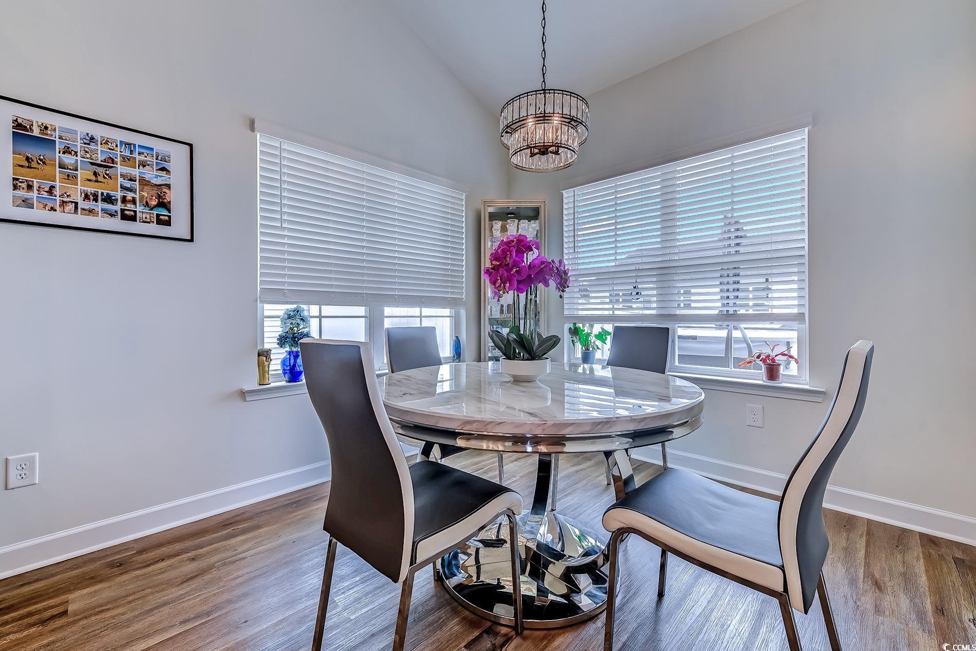 Better Than New! This lovely craftsman-style home features three bedrooms, two full baths and a 2-car garage. Located in Evans Park, a small community in the International Club, a golf course community in Murrells Inlet. Less than 4 years old, this single level home in this natural gas community is in mint condition. Attention to detail and pride of ownership are immediately apparent. The tone is set from the moment you drive up to this home with its attractive blue siding with white trim and masonry accent, manicured lawn, palm trees and covered front entry. This home features arched entryways, luxury vinyl plank flooring in living areas, ceramic tile in baths and neutral carpet that adds warmth to the bedrooms. Open floor plan with 12' ceilings in the family room and kitchen and 10 ft ceilings in the primary bedroom make this home feel open and airy while smooth ceilings, crown molding and the neutral colors of the walls will make you feel right at home! Natural gas heat, Rinnai on demand hot water heater, outdoor fireplace and gas range Enter the home into a spacious foyer with chair rail, shadow box molding, hall tree, large closet and arched entry open to the family room and kitchen. Spacious family room with vaulted ceiling with fan, recessed lights, window and slider to the enclosed porch. The family room opens to the chefs kitchen, perfect for entertaining or enjoying meals. The kitchen features stone gray shaker style cabinets with white quartz countertops, gas range, tiled backsplash, stainless steel appliances including a French door refrigerator, staggered height cabinets with crown molding, and a large island with newer sink and faucet and pendant lights. Bright and cheery breakfast nook with windows bringing in lots of natural light and door to the enclosed porch. Split bedroom plan with the primary bedroom suite located in the rear of the home. Features include a vaulted ceiling with fan, walk-in closet with custom cabinets and a primary bath with vanity with marble top, two sinks, tiled 5 walk-in shower with seat and transom window, linen closet and tile floor. Friends and family who are visiting will enjoy the privacy of the two good-sized guest bedrooms at the front of the home and full bathroom with tub/shower and tile floor. A Slider from the family room leads to the enclosed porch with E-Z Breeze vinyl windows, a corner stone natural gas outdoor fireplace, ceiling fan, LVP flooring and windows overlooking the patio and fenced backyard. This 3-season room will be the ideal place to read an enjoyable book, watch your favorite TV show or enjoy the fireplace on a chilly Carolina evening. Or better yet, head out to the oversized patio. What a great spot to start your day with your favorite morning beverage or relax at the end of the day. The owners have made this area a private oasis with fire table and even a detached 10x12 storage shed for the lawn mower, tools and all those extra items. Entertaining comes naturally here! What a great spot for grilling, entertaining and building memories with family and friends. Separate Laundry room with custom shelving. Attached 2 car garage. Since the owners purchased the home less than four years ago, they enclosed the covered porch and added E-Z Breeze windows, LVP flooring and ceiling fan, expanded the patio and fenced the backyard, added a storage shed and fire table. Other features of the home include an irrigation system, blinds throughout, window casing around all windows in the house and termite protection. HOA fee includes basic cable TV and trash pickup. Excellent location, just minutes to golf courses, food stores including Publix and Lowes Foods, restaurants, Brookgreen Gardens, shopping, hospital, MarshWalk, Huntington Beach State Park and the beautiful blue Atlantic. Truly a lovely home you will want to see! Measurements and square footage are approximate and not guaranteed. Buyer is responsible for verification.