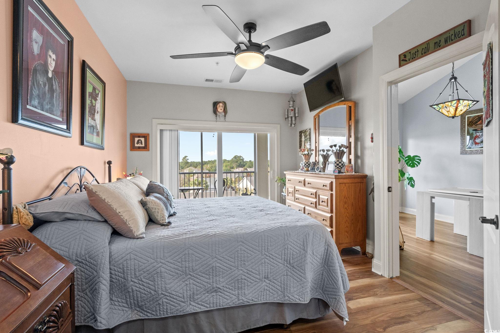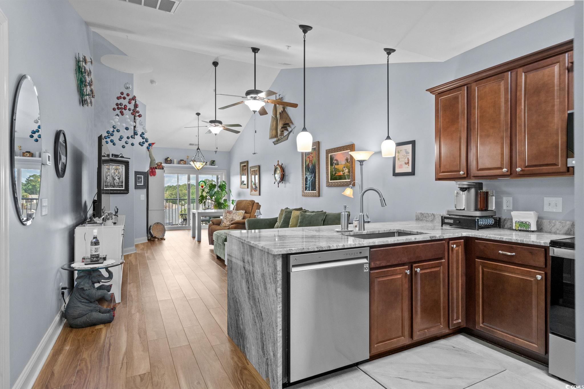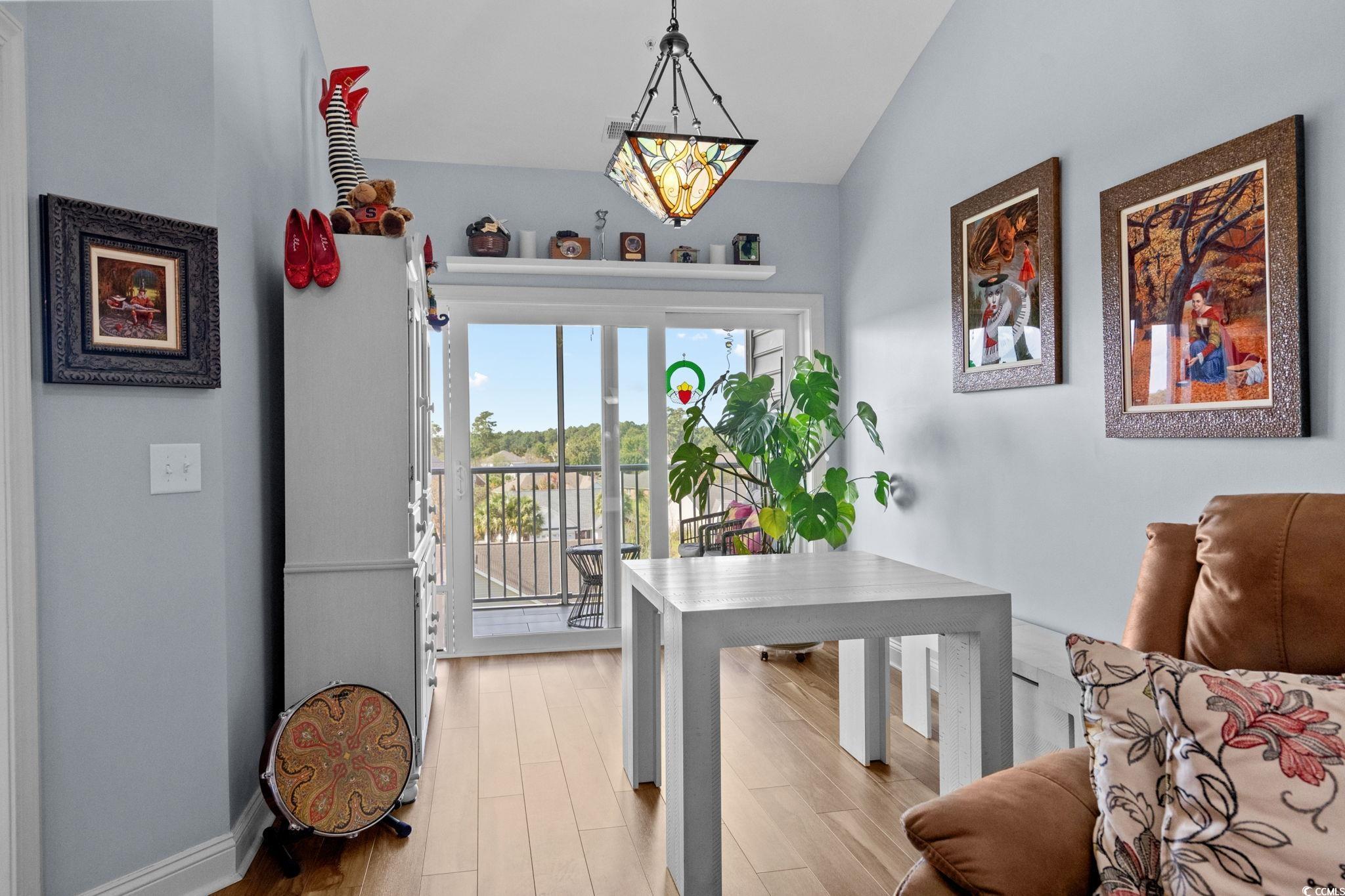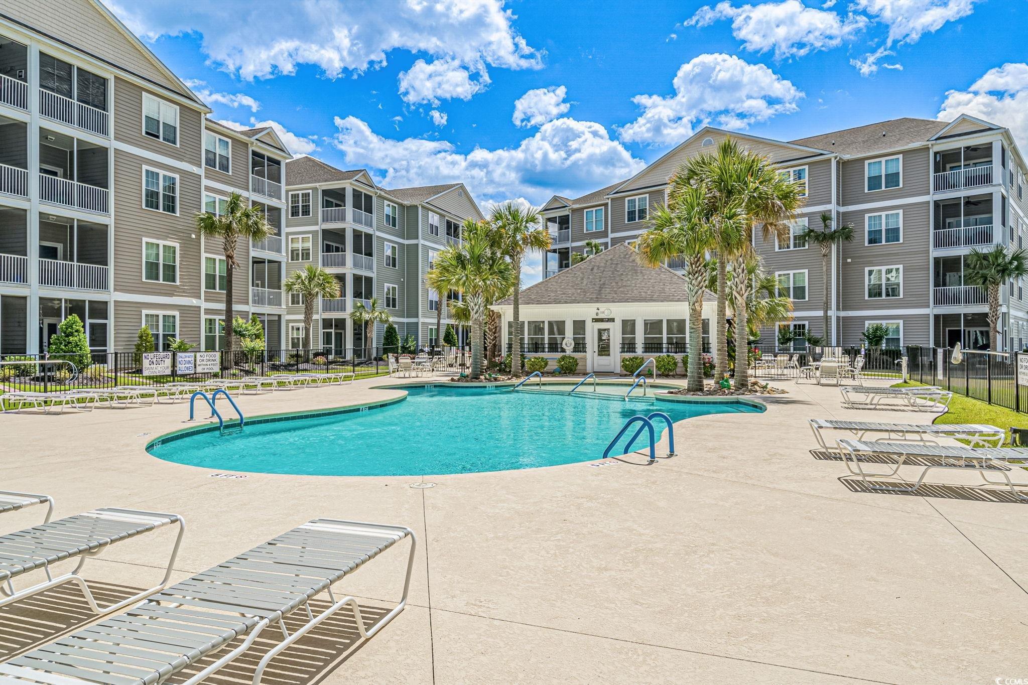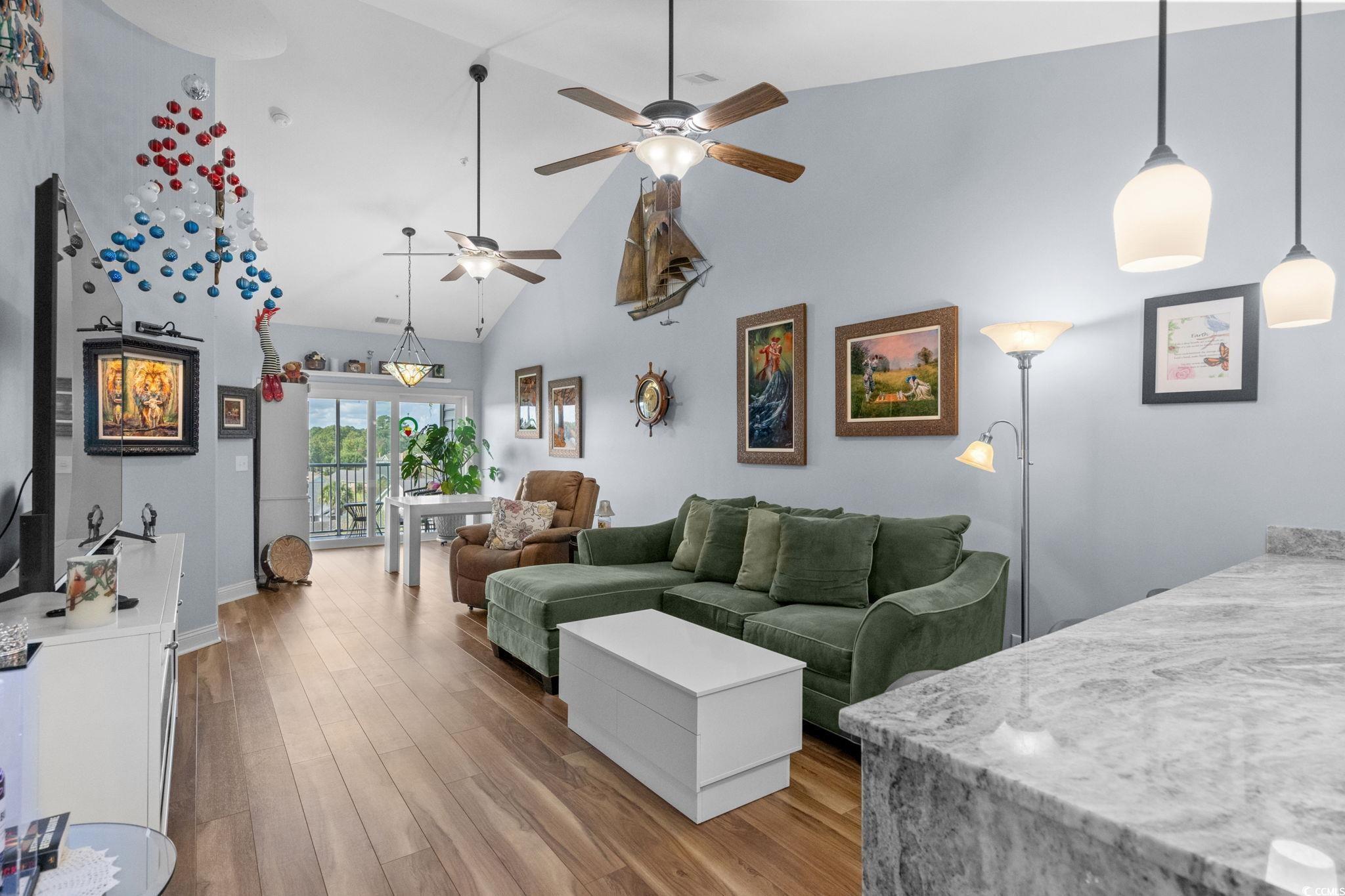 Welcome to The Village at Queens Harbour! This 4th-floor, 2bedroom-2bath condo isnt just updated. Its one of the communitys rare gems. Out of 11 buildings, only 5 units boast both vaulted ceilings and a double balcony and this condo is one of them. Inside, youll immediately feel the warmth and light that make this space so inviting. The open layout is complemented by cherry cabinets, durable quartzite countertops and a complete set of brand-new 2024 appliances, including refrigerator, range, microwave, dishwasher, and a washer/dryer combo which conveys. Both bathrooms have been refreshed with new toilets, medicine cabinets, and flooring. The laundry room has also been upgraded with added cabinets to maximize space. VCT new flooring runs throughout the entire unit enhancing the fresh and updated feel. Modern lighting, updated fans, tiled balcony floors, and remote-control shades complete the polished look. The unit is in immaculate condition, move-in ready. Additional perks include a private storage unit right across the hall and the convenience of an exterior elevator. The Village at Queens Harbour offers a pool, clubhouse, picnic areas, and community activities and one of the best parts is the location, located less than a mile from Market Common, close to shopping, dining, dog parks, and just a short drive to the beach. This rare property combines comfort, style, convenience and much more! Schedule your showing today!