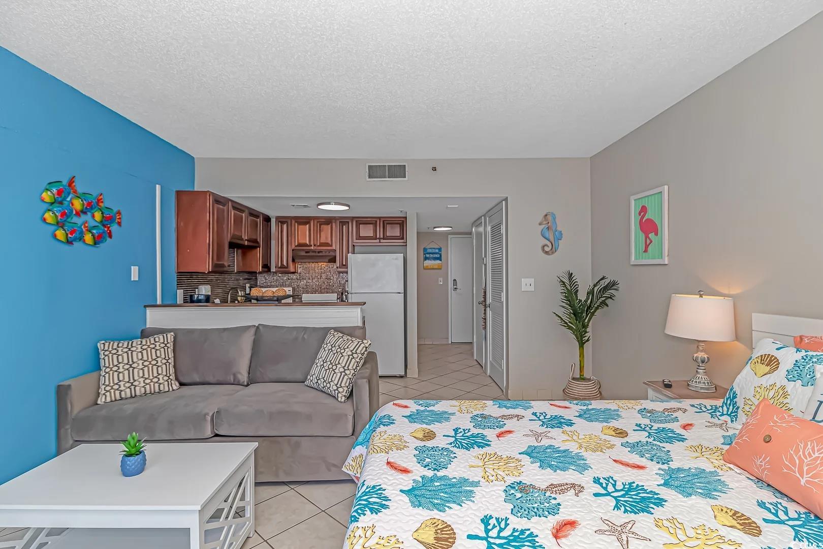 Oceanfront Studio - Palace Resort #1001 Enjoy direct oceanfront views from this spacious 10th-floor studio at The Palace Resort. Unlike most studios, this unit offers an oversized full kitchen with full-size appliances, and plenty of storage. The open layout features a queen bed, sleeper sofa, and a dining nookall designed to maximize comfort and space. Step onto the private balcony for breathtaking sunrise views and dolphin sightings. The Palace Resort offers on-site pools, hot tubs, beach access, and a prime location close to the airport, shopping, dining, and entertainment. Fully furnished and rental-readyan excellent opportunity for a personal getaway or investment property.