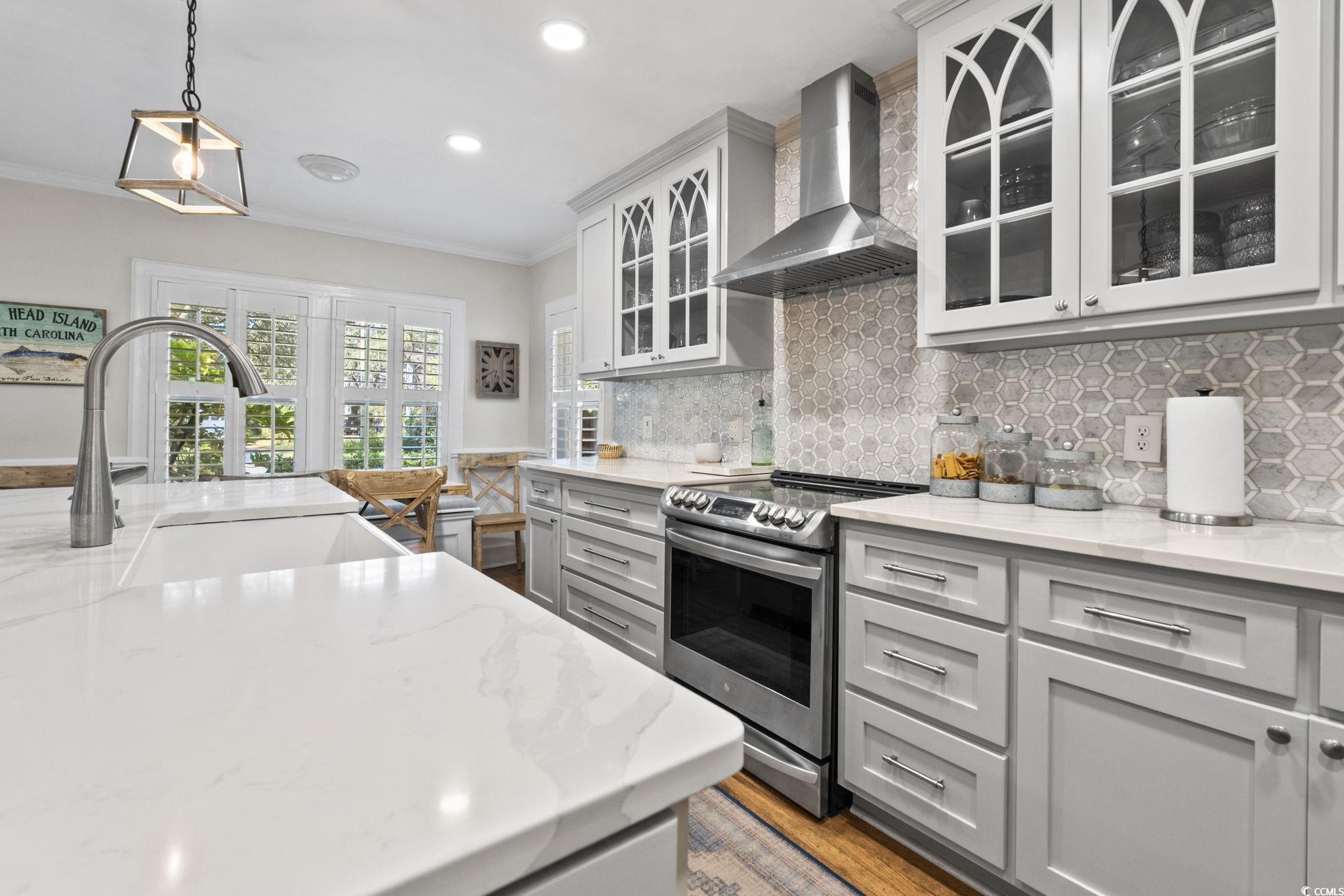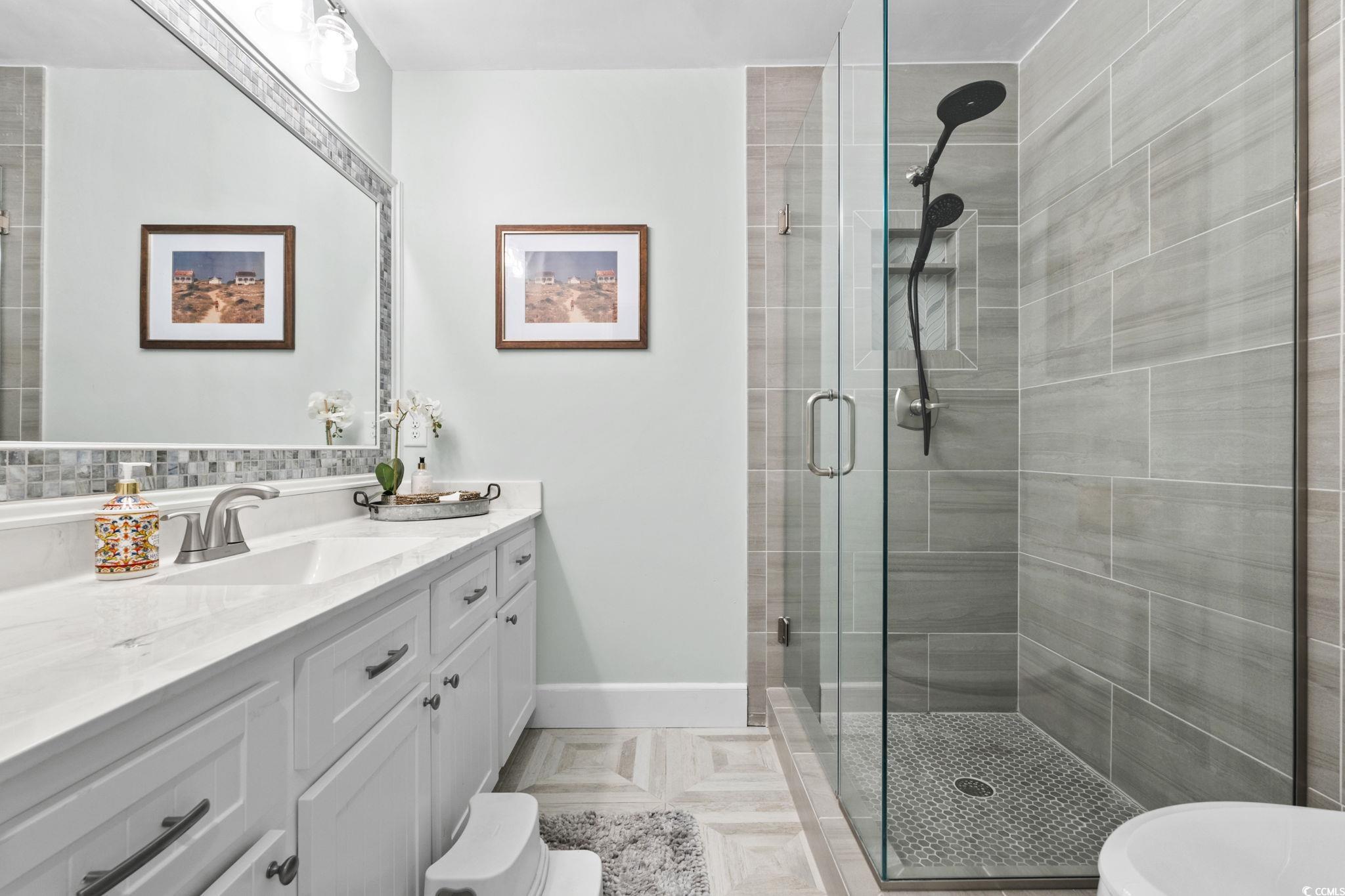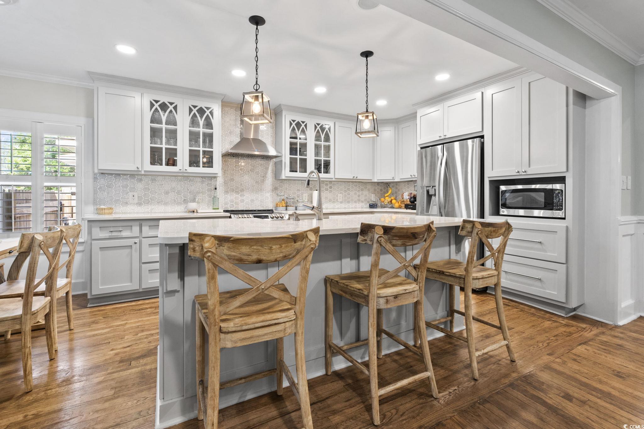 OPEN HOUSE - NOV 8, 12-3pm. Here is the one youve been searching for! Oceanside of Hwy 17 Business in Myrtle Beach, totally renovated, mother-in-law suite, screened porch, oak trees, and a short flip flop walk to the beach. This nostalgic yet modernized 4-bedroom, 4-bath property (which includes a newly added 1-bedroom, 1-bath mother-in-law suite) perfectly blends timeless charm with todays comforts. Originally built in 1946 and fully renovated from the ground up in 2019, the home offers peace of mind with extensive updates including all-new plumbing, electrical, sewer/electrical mains to the street, premium-grade shingles with structural roof reinforcements, Low-E impact-rated windows, updated insulation in both attic and crawlspace, and a high-efficiency 18 SEER HVAC system with variable speed air handler. Interior finishes showcase quartz and marble details, refinished original hardwood floors, plantation shutters, crown molding, wainscoting, and custom architectural woodworking that honor the homes history while delivering modern luxury. Additional upgrades include a natural gas tankless water heater, whole-home water filtration with booster pump, circular driveway, 8-zone irrigation, and custom fencing with gated golf cart access. In 2021, a rear building was added featuring spray foam insulation, impact-rated windows and doors, Cat 6 internet, generator transfer switch, mini-split HVAC, and its own tankless water heaterdesigned to serve as a hurricane-ready lifeboat or versatile bonus space. Outside, the fenced yard includes Astroturf play areas, pet/child-friendly zones, and a movable golf cart deck. Perfectly located just minutes from the beach, shopping, restaurants, and entertainment, this property offers not only a beautiful home but also a lifestyle in the heart of Myrtle Beach. Dont miss your chance to make this rare find your own!