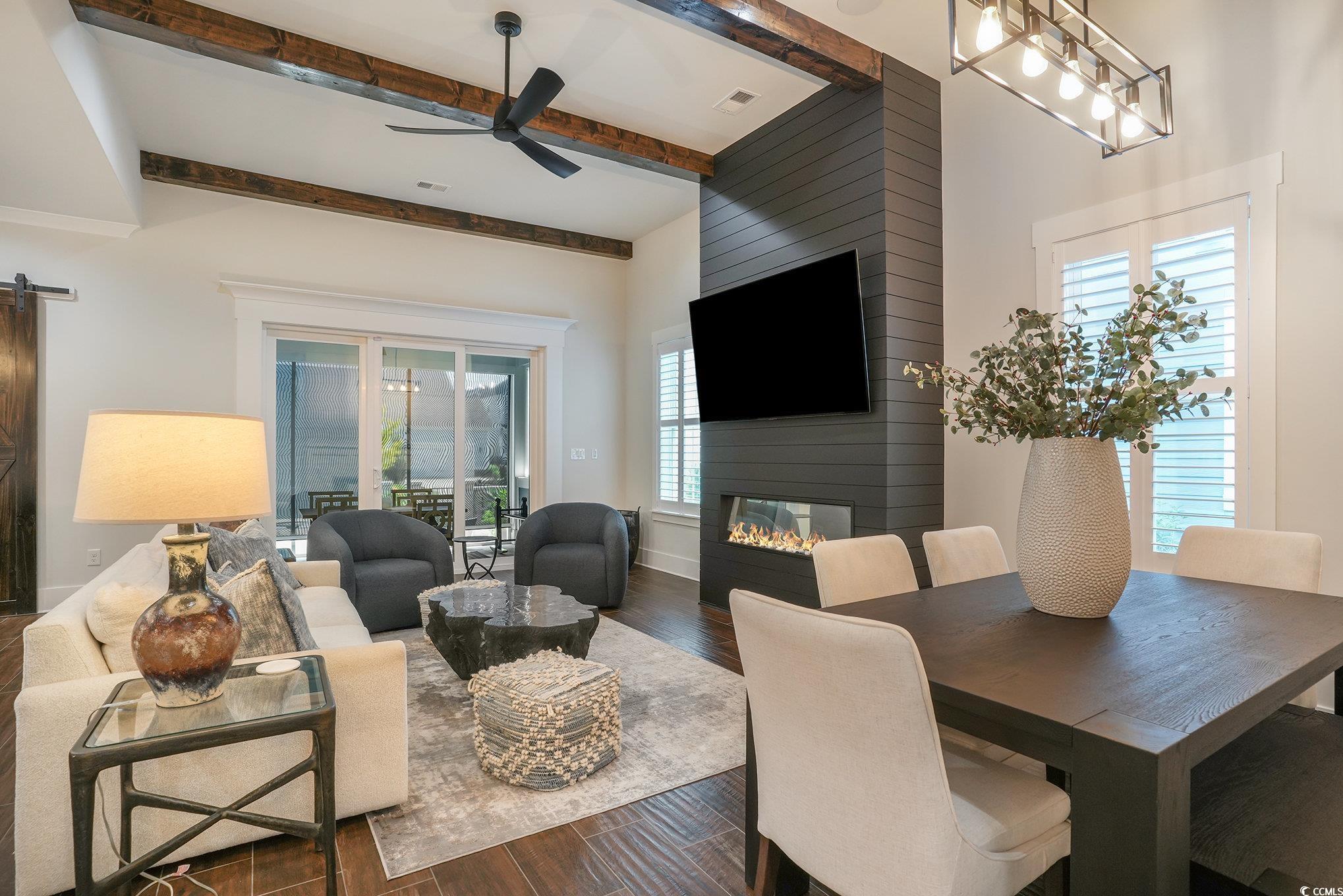 Welcome to this stunning Charleston-style, designer-built home in the prestigious gated community of Waterway Palms Plantation. This elegant residence combines timeless Southern charm with modern luxury, offering a perfect balance of indoor comfort and outdoor living. From the moment you arrive, youll be drawn to the homes double front porches, coastal blue Hardie Plank siding, and inviting arched double-door entry. The lush landscaping with palms and magnolia trees frames the property beautifully, setting the tone for the refined living experience inside. The heart of this home is a bright, open-concept living and kitchen area that seamlessly blends style, warmth, and functionality. Anchored by a dramatic shiplap fireplace with a sleek linear flame. The living room features exposed wood beams, wide-plank flooring, and an abundance of natural light that pours in through windows and glass doors, leading to a private screened-in porch. Its an inviting space designed for both everyday relaxation and entertaining guests. The adjoining chefs kitchen is a true showpiece, featuring a massive island with seating for four, custom cabinetry, and designer lighting. Culinary enthusiasts will appreciate the JennAir appliances, the professional 10-burner gas range with dual ovens, warming drawer, custom vent hood, and convenient pot filler, while the built-in wine fridge and Chick-Fil-A style nugget ice maker elevate hosting. Enjoy pristine, refreshing water throughout the home with a whole-house water filtration system, complemented by a reverse osmosis purification system that supplies the nugget ice machine and water fountain tap. The kitchen flows effortlessly into the dining area, highlighted by elegant millwork, modern lighting, and room for family gatherings. Every detail of this space has been carefully curated. The luxurious first-floor primary suite is a true retreat, blending comfort and sophistication with thoughtful details throughout. The spacious bedroom is bathed in natural light from the large windows and elegantly finished with plantation blinds for privacy. A modern fireplace adds warmth and elegance, creating a cozy spot to unwind at the end of the day. The soft neutral palette, wood-look tile flooring, and stylish pendant lighting on each side of the bed provide a serene and upscale atmosphere. The en-suite bathroom is designed with spa-like finishes, including a double sink vanity with striking black countertops, contemporary mirrors, and designer fixtures. The oversized walk-in steam shower showcases floor-to-ceiling custom tilework, multiple showerheads, and built-in shelving for a sleek yet functional experience. Completing the suite is a generous walk-in closet system with custom shelving, drawers, and abundant hanging space, offering both organization and style. Beyond the primary suite, this home offers thoughtfully designed secondary bedrooms and versatile spaces that adapt to your familys lifestyle. Each additional bedroom features neutral color palettes, creating welcoming retreats for family and visitors. Each bedroom also features their own bathrooms allowing privacy for family or guests. At the top of the stairs, the open loft serves as a game room and second living area, complete with access to the upper balcony. With room for a pool table, lounge seating, or media setup, its an entertainers dream. Tucked just off the loft, a flexible space is currently set up as a home gym, complete with large windows, durable flooring, and room for equipment or transform the space to your needs. Outdoor living shines with a retractable phantom-screened porch, full summer kitchen with Green Egg platform, and a gas-fed fire pit courtyard, all wrapped in classic southern charm with covered porches and a balcony. Waterway Palms Plantation is a coveted gated community on the Intracoastal Waterway offering resort-style amenities from a clubhouse and pool to tennis, playground, and private boat launch.