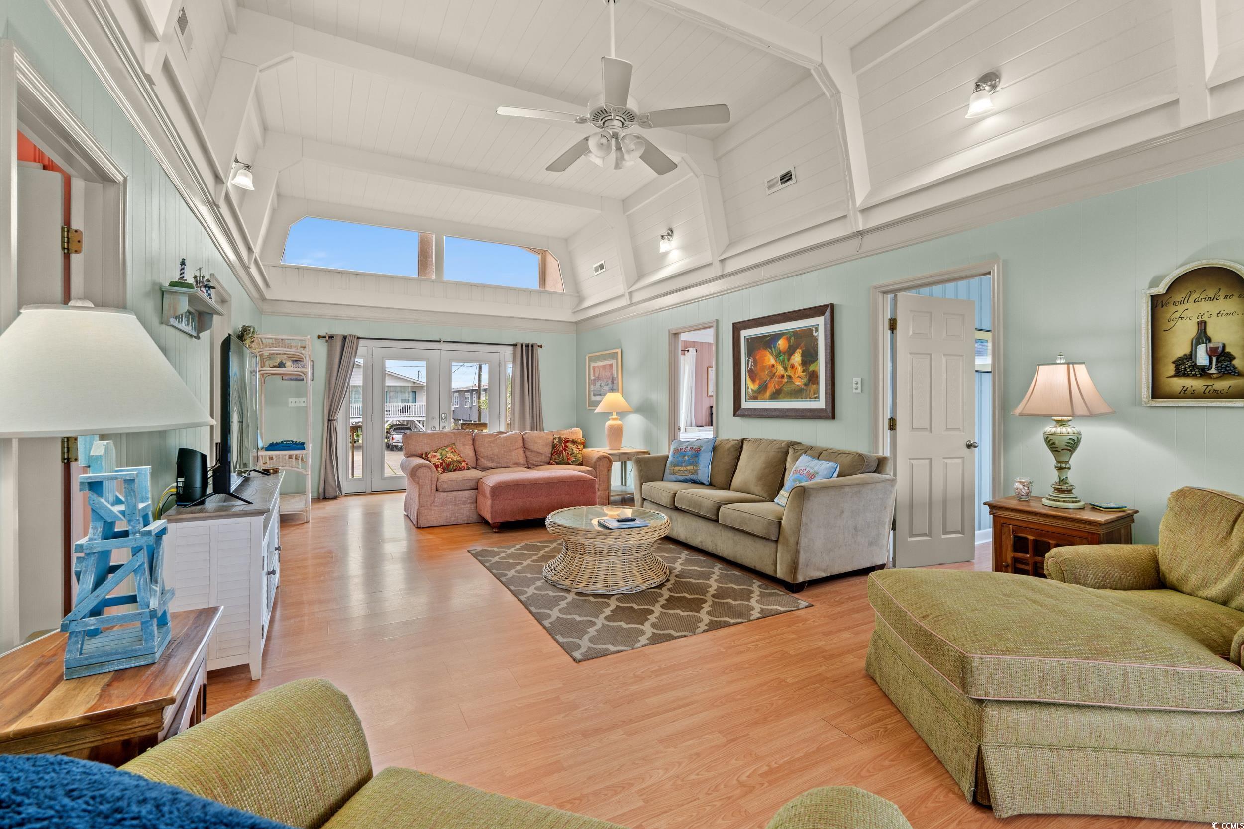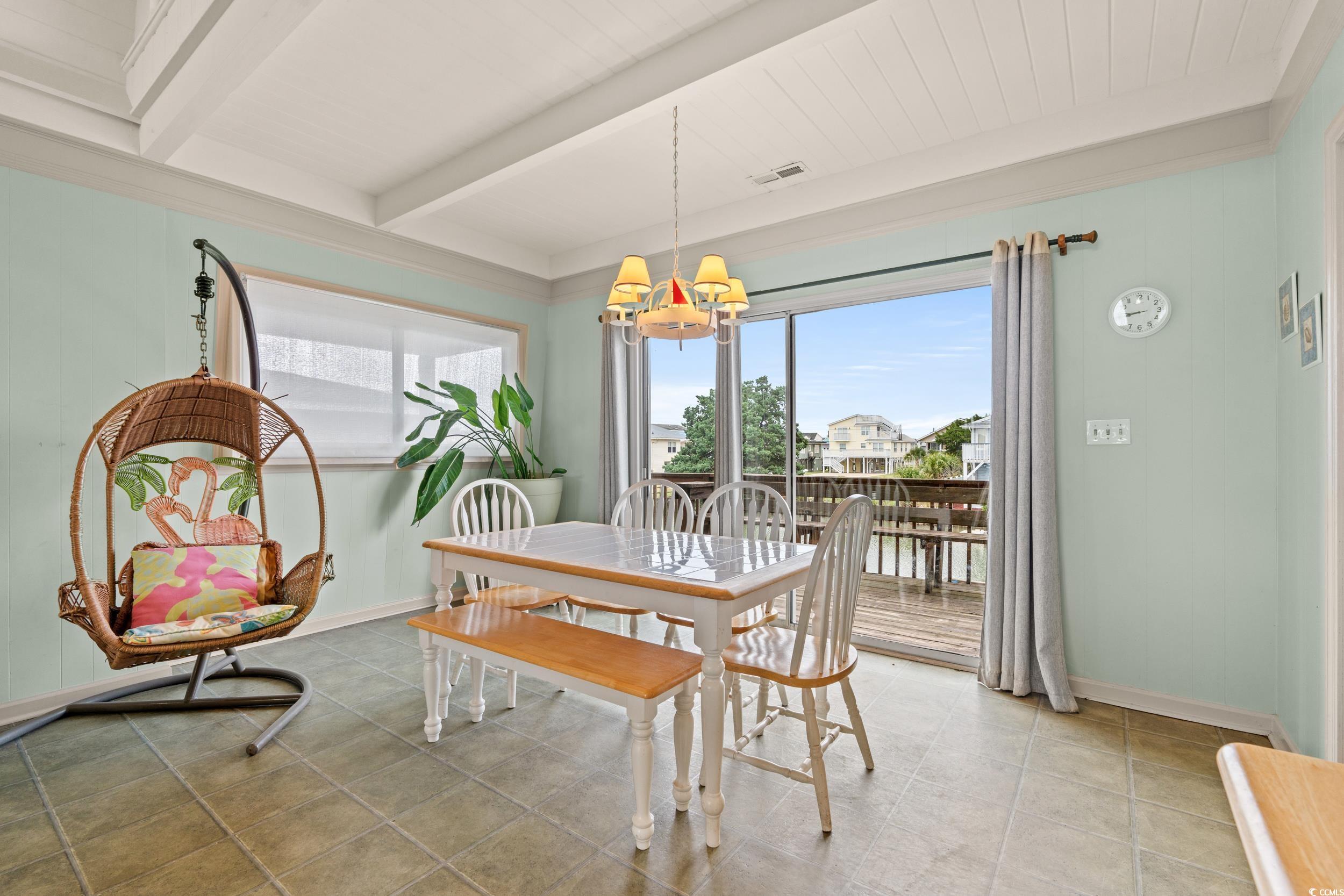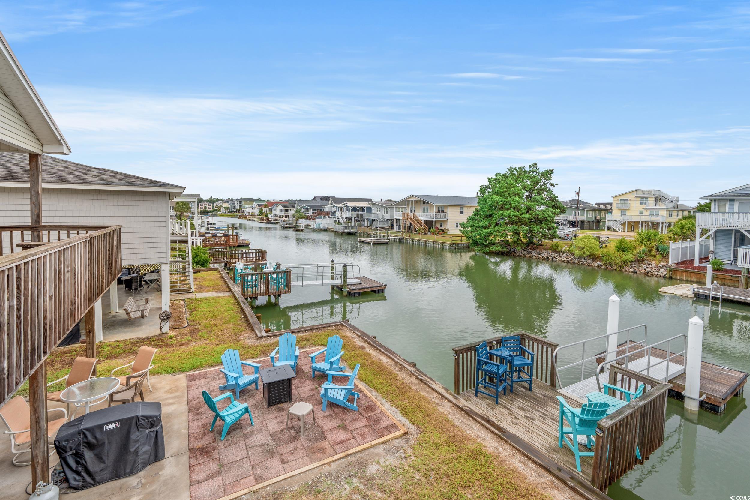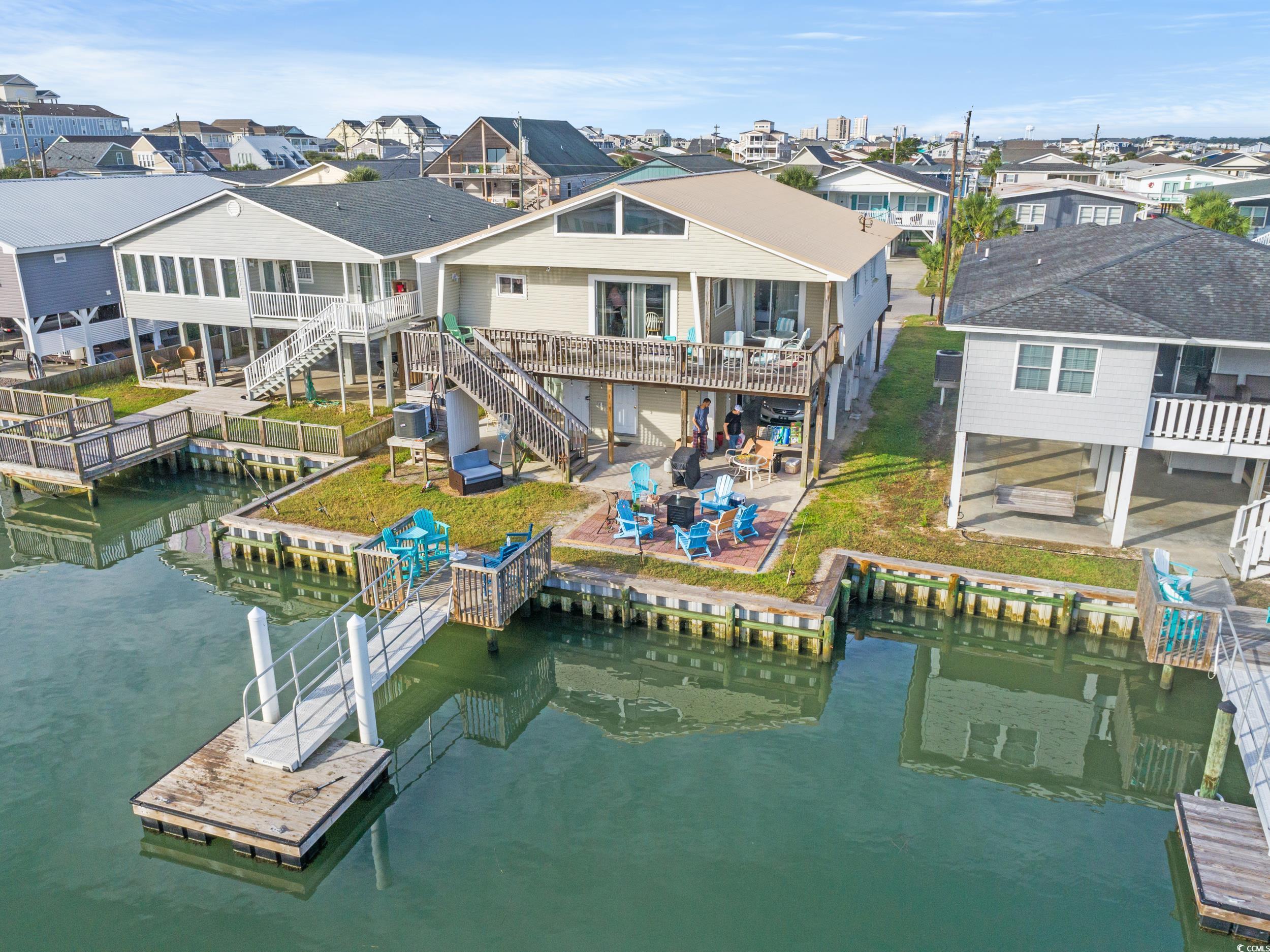 Welcome to your ideal channel-front getaway! This fully furnished, charming 6-bedroom, 3-bathroom raised beach home perfectly blends classic coastal comfort with a prime channel location, offering ample space and amenities for a memorable vacation. The exterior front stairs lead you to the main level, where an inviting open-concept living area, kitchen, and dining area awaits. Bathed in natural light, the spacious open concept living room features vaulted ceilings, comfortable furnishings, and is perfect for unwinding after a day at the beach. This upper level also includes a four bedrooms and two full bathrooms each designed with coastal themes and maximum sleeping capacity for guests. From up here, you can open the sliding glass doors onto the spacious private deck with picturesque views of the channel and marsh. Down those stairs you'll discover a separate and equally charming mother-in-law suite on the ground level that features its own living area and full kitchen, along with two more bedrooms and a full bathroom. The exterior of this home is designed for maximizing your channel-front experience. The large, covered area beneath the house provides ample parking and a cool, shaded retreat. A dedicated dock offers direct access to the water, perfect for fishing, crabbing, or simply enjoying the serene views. Just off the house, a spacious patio area features comfortable Adirondack chairs and a fire pit, creating an ideal spot for relaxation. Additional outdoor seating, on the upper and lower levels, and a grill complete the setup for hosting and enjoying. All guests can utilize the storage/laundry room and outdoor shower on the ground level as well.This home offers the perfect blend of indoor comfort and outdoor enjoyment, making it an exceptional choice for large families or groups seeking an unforgettable North Myrtle Beach vacation!