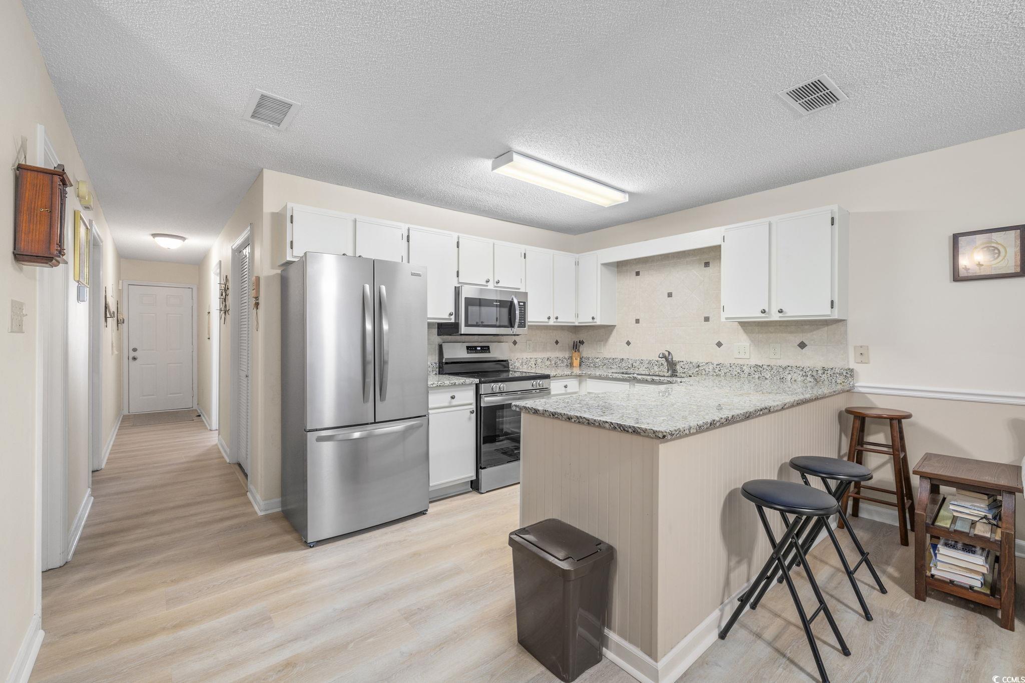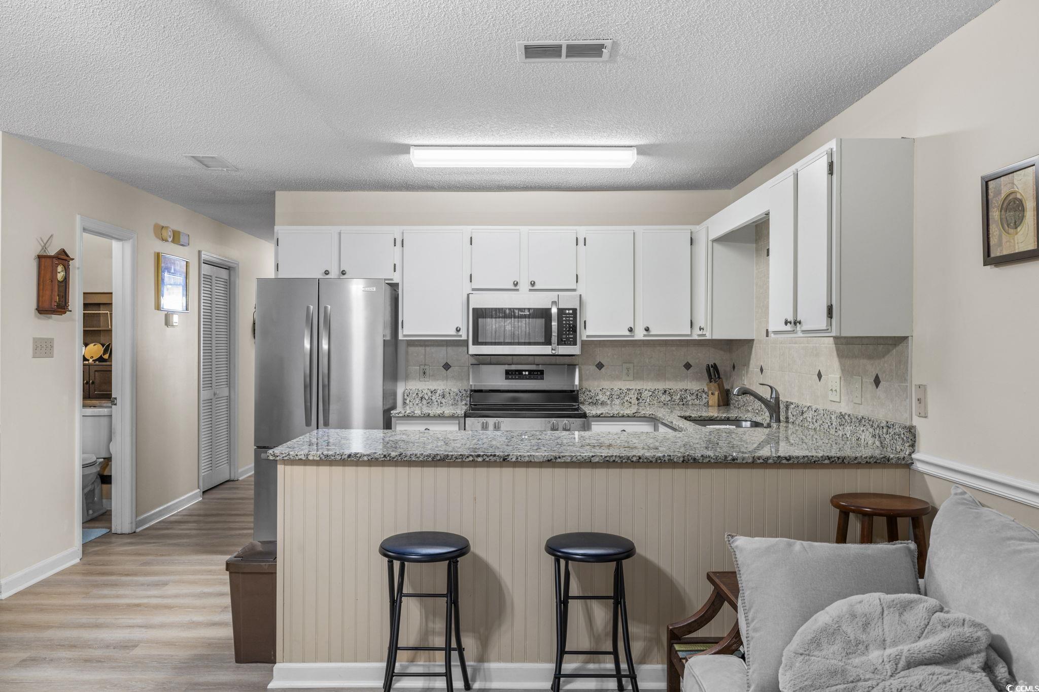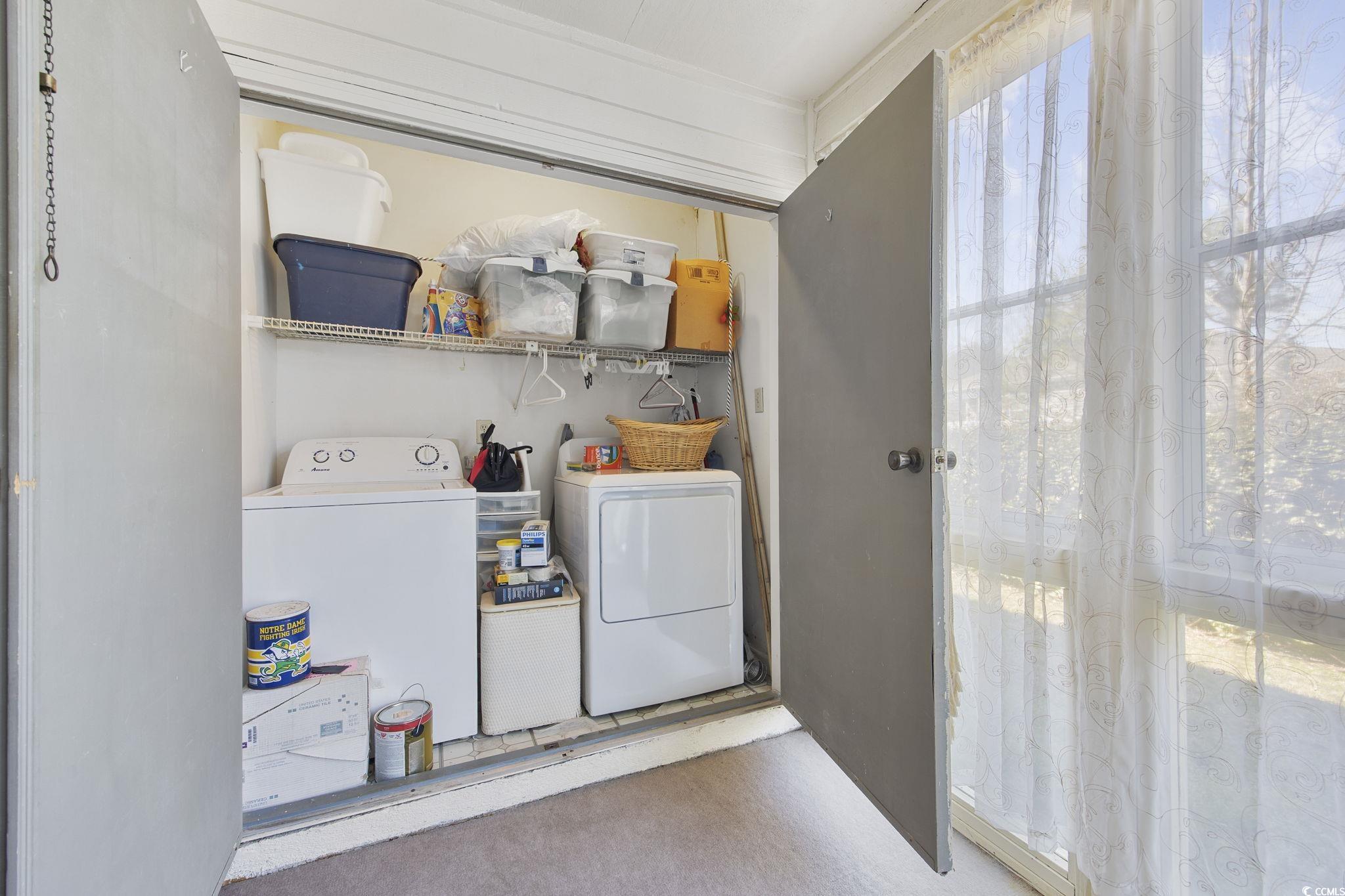 Charming updated 1-Bedroom, 1.5-Bathroom First-Floor Condo with Carolina Room in quiet Myrtle Beach Community. Nestled in a peaceful and well-maintained complex, this cozy 1-bedroom, 1.5-bathroom condo offers a serene living experience just 20 minutes from the sandy shores of Myrtle Beach. Perfectly located on the first floor, this home features a newly updated well-appointed kitchen with brand new stainless steel appliances, ample refreshed cabinetry and beautiful, expansive granite counter space, making meal prep a breeze. A custom pantry closet has been added and convenient half-bath is located just off the living area for guests ease. Theres a bright and airy Carolina room, perfect for relaxing or enjoying your morning coffee. This unit features brand new kitchen Stainless Steel Appliances (ready for new owners to register warranty), refreshed cabinetry in kitchen & half bath, new LVP flooring and new toilet in the half bath, new HVAC and dryer, like new washer, HWH 3 years old. The spacious living area flows seamlessly into the dining space, creating an open and inviting atmosphere. The master bedroom is generously sized with a large closet w/designer doors, offering plenty of storage. The custom layout offers a full private master bathroom with relaxing tub and shower combination and linen closet. Enjoy additional outdoor space in the Carolina room, perfect for lounging or using as a home office. Washer & Dryer are conveniently located in a large closet in the Carolina room. Step outside to access the complexs pool, ideal for cooling off during the warmer months. This condo is located in a quiet community that offers both tranquility and convenience. With Myrtle Beach just a short 20-minute drive away, youll have easy access to all the attractions, dining, and entertainment the area has to offer, while still being able to return home to a peaceful retreat. This unit is sold As-Is. Seller has been advised entry road is being repaired. Don't miss the opportunity to own this delightful condo - schedule a tour today!
