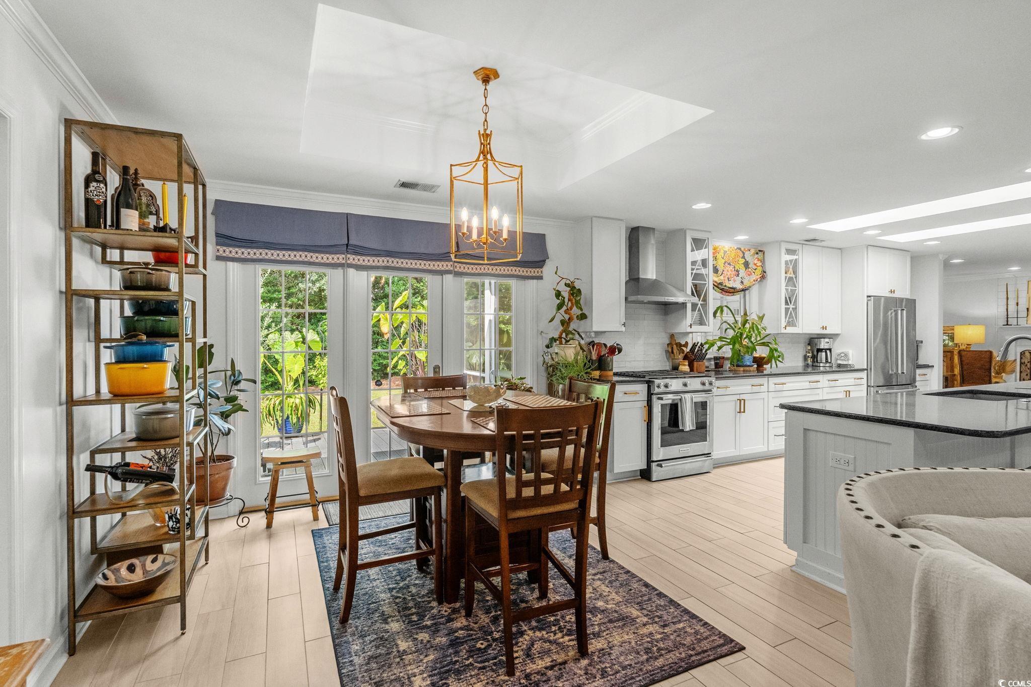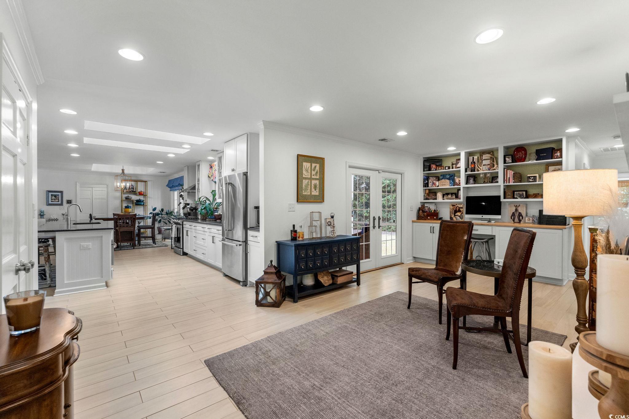 Welcome to a true gem in the heart of The Dunes Clubone of Myrtle Beachs most coveted and sought-after communities. Perfectly positioned on a private half-acre homesite at the end of a quiet cul-de-sac, this residence makes a striking first impression with its majestic oak, mature landscaping, and timeless curb appeal. Step inside to find a light-filled open floor plan designed for both comfort and style. Thoughtful details abound, including crown moulding, recessed lighting, skylights, custom built-ins, and split bedrooms for privacyall on one convenient level. This 4-bedroom, 2.5-bath home has already been revived with a substantial 2016 renovation by a previous owner bringing modern elements such as new windows and doors, roof, electrical, plumbing, appliances, and encapsulated crawl space. Additional enhancements in 2021 and beyond have continued to elevate both interior and exterior appointments. At the heart of the home, the beautifully appointed granite kitchen shines with abundant cabinetry, generous counter space, and a massive center island with bountiful seatingperfect for everyday living and entertaining. The kitchen flows seamlessly into the surrounding living areas, complemented by flexible spaces like a den/study or dining room, a welcoming foyer, and a practical mudroom with a drop zone and laundry. Outdoor living is equally inviting with a screened porch and spacious deck overlooking the private backyard. With plenty of room to create your dream retreat, this lot offers exceptional potential for an in-ground pool and/or outdoor oasis. An oversized side-load garage with sink and storage adds both convenience and function. Currently fueled by propane for the kitchen range/oven and fireplace, natural gas is also available and ready for connection by the new owner. Dont miss this chance to own this exceptional Myrtle Beach address and embrace the coastal lifestyle The Dunes Club has to offerjust a short walk or golf cart ride to the beach and currenty home to the OneFlight Myrtle Beach Classic Golf Tournament.