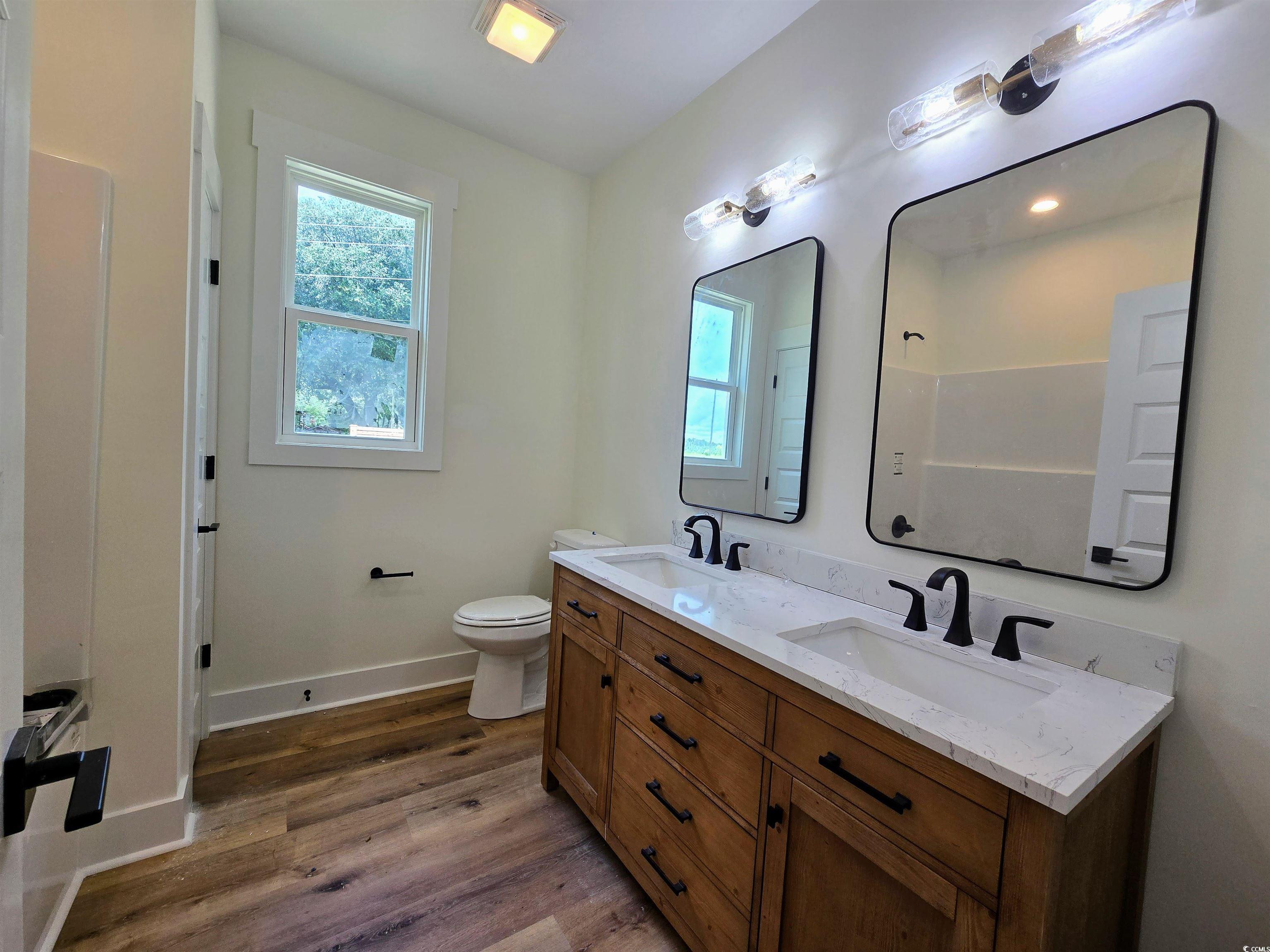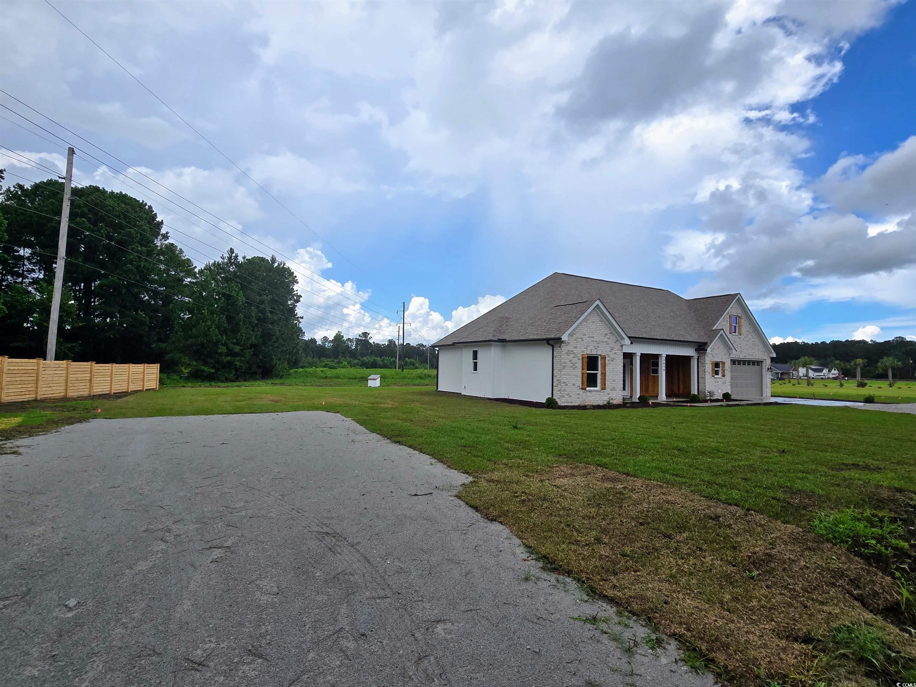 THIS IS IT!! No HOA, almost an acre, new construction semi-custom home with special upgrades - this is no cookie cutter. This is country living at its finest! More than enough space to add a pool or workshop. A second driveway entrance with extra parking pad was added for an RV, boat, trailer, or for extra guest parking. This farmhouse style ranch home is beautifully appointed with brick and cedar accents, shutters, gutters and special soffit lighting which looks beautiful at night. Outdoor living is easy on this spacious screened in porch overlooking your large backyard with additional access from primary bedroom. The relaxing low country front porch has tongue & groove ceiling, cedar siding and ceiling fans just waiting for your rocking chairs. Interior features include quality wide-plank LVP floors throughout the home, a stunning open concept living space showcasing ceiling beams, shiplap accents, gas log fireplace, and custom built-ins. The kitchen is equipped with shaker style soft-close cabinets, granite countertops, large kitchen island, marble hexagon backsplash, custom range hood, and upscale appliance package including a microwave drawer, gas stove, dishwasher, and refrigerator. This home also has a central vac system! Other amazing features include a large butler's pantry / laundry room just off the kitchen with more cabinets and butcher block countertop close to the garage entry equipped with a custom mud bench area. The primary bedroom has a gorgeous ensuite with large custom tile walk-in shower with bench and rain head shower fixture, premium double sink vanity with stone countertops, custom butcher block vanity area with lighted mirror, and a large walk-in closet. Hard to find new construction homes with this many custom features included. 2-car garage includes pull down stairs to attic. Home has a gas Rinnai tankless hot water heater, septic tank and a 295 ft deep water well for huge utility savings. Conveniently located off Hwy 701 North very close to the Hwy 22 interchange making it easy to get anywhere up and down the beach and is only 10 minutes to Conway. This one won't last long! Backyard grass is virtually staged in picture (I don't have an updated photo.) Owner is a SC licensed real estate agent.
