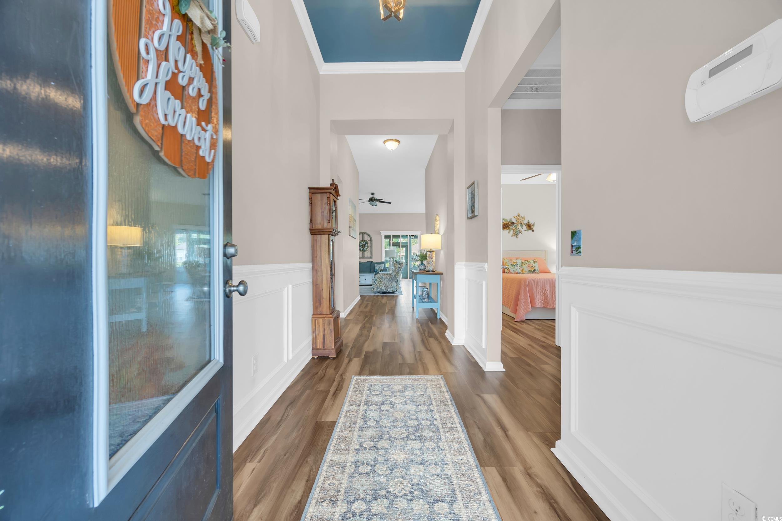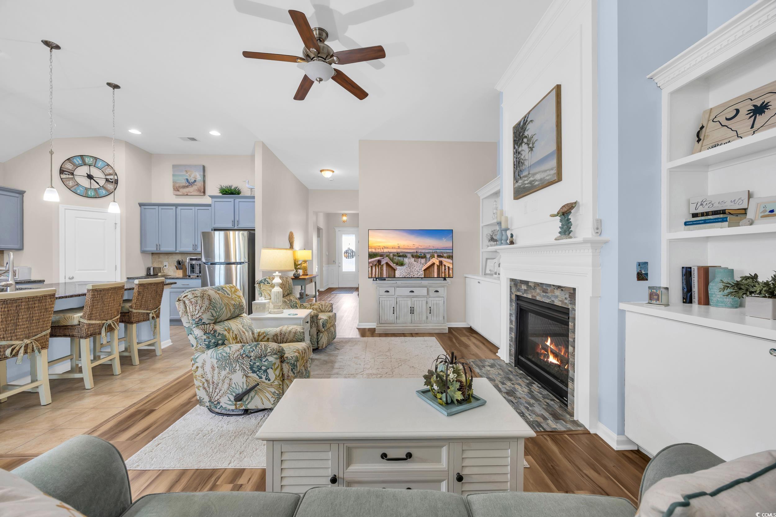This meticulously maintained ranch-style home in the desirable Tuscany subdivision is located in Myrtle Beach! This stunning home, located on a premium water lot, offers four bedrooms, two bathrooms, and a heated square footage of 2,258. The recently updated all-season sunroom, complete with its own heating and cooling system and new windows, provides a comfortable retreat year-round. The fenced backyard offers privacy and is perfect for outdoor activities. Inside, the kitchen is a chef's dream with stainless steel appliances, granite countertops, and a whole-home water purification system. The living area features a gorgeous fireplace surrounded by custom bookshelves, creating a warm and inviting focal point. Located less than 7 miles from the ocean, this home is also conveniently situated near restaurants, shopping, and popular entertainment attractions. The Tuscany community boasts resort-style amenities, including two outdoor pools, a lazy river, hot tub, fitness center, game room, tennis courts, and nature trails. The property also includes an irrigation system, ensuring your yard stays lush and vibrant. Don't miss your chance to experience luxury living in this exceptional home and community!