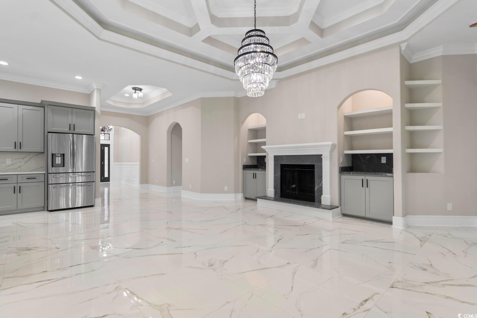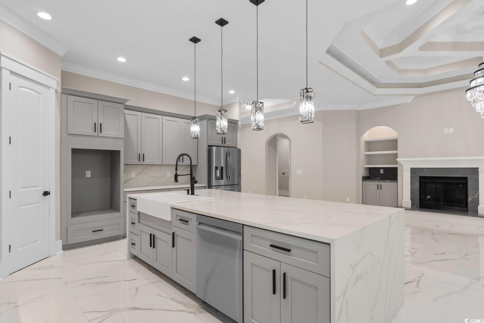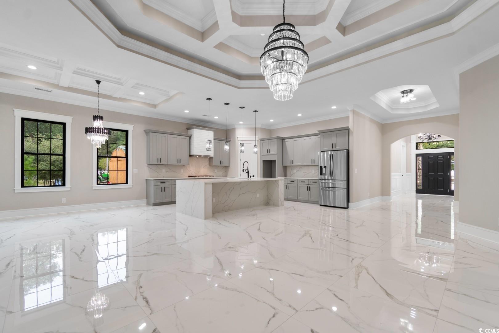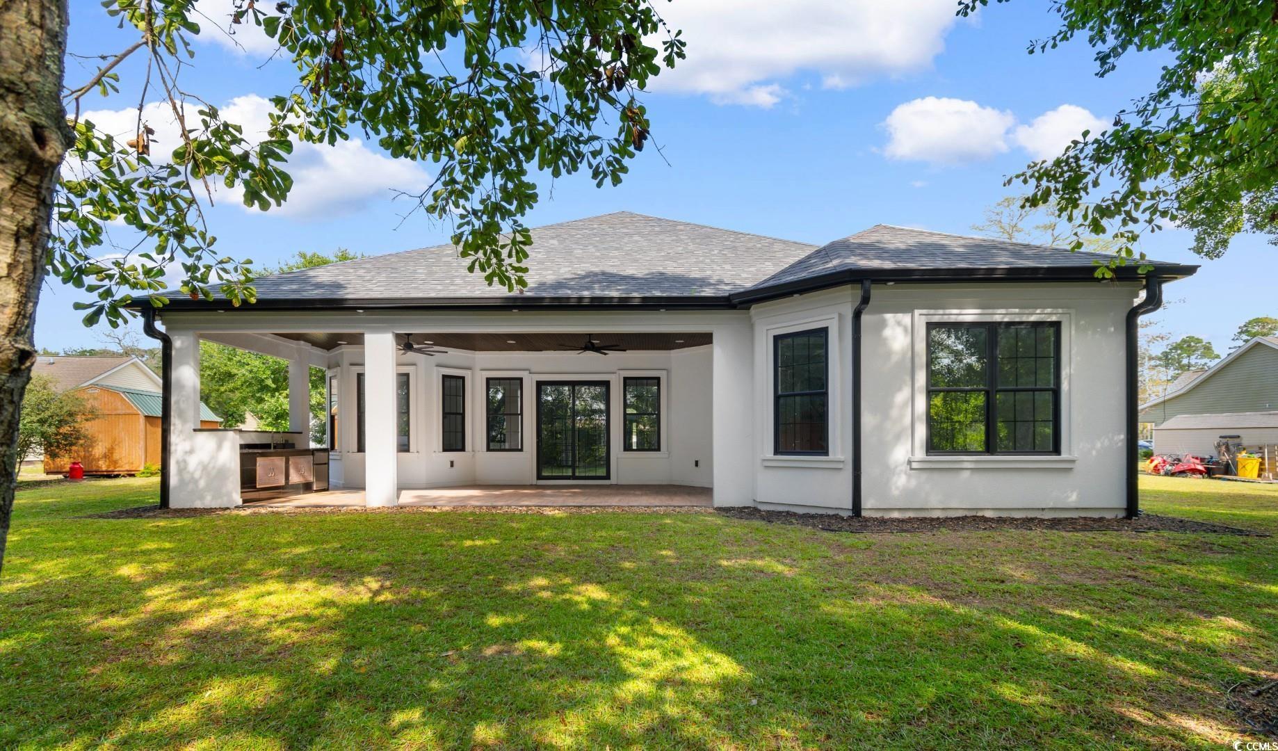 Welcome to this stunning Mediterranean style newly built 4 bedroom, 3 bathroom home in the heart of Little River, blending modern style, everyday comfort, and thoughtful design. From the moment you walk in, you're greeted by a spacious foyer that welcomes you to the open-concept living area featuring 12-foot ceilings, a cozy fireplace with built in , porcelain tile through, and custom tray & coffered ceilings that elevate the space with a touch of luxury. This expansive chef's kitchen showcases, custom cabinetry, stunning quartz countertops with a full-height backsplash that matches the countertops, a large waterfall island , high-end stainless steel appliances, and a generous pantry. Designed perfectly for everyday function with upscale style for effortless entertaining. Retreat to the spacious master suite, boasting elegant tray ceilings, two walk-in closets with custom shelving, and a spa-inspired bathroom with an oversized slab walk-in shower, double vanities, and a relaxing jetted tub. Two of the additional bedrooms are joined by a Jack-and-Jill bathroom with a double vanity, tray ceilings, and large custom closets. The fourth bedroom has an en-suite bathroom which is perfect for guests or a home office. The roomy laundry room has plenty of cabinets for storage, counterspace for laundry days and a sink. Step outside to the spacious covered back porch, which features an outdoor kitchen area with granite countertops and a built-in stainless steel refrigerator sets the stage for unforgettable gatherings and weekend cookouts! This home features a spacious three-car side garage with epoxied flooring. Additionally, this breathtaking home offers all high end chandeliers, the guest bedroom ceilings fans have speakers and multicolor lights, LED vanity mirrors, built in exterior light surround the home and so much more! Located within a short to the beach and all that the Grand Strand has to offer! Don't miss out on this exceptional property, schedule your showing today!