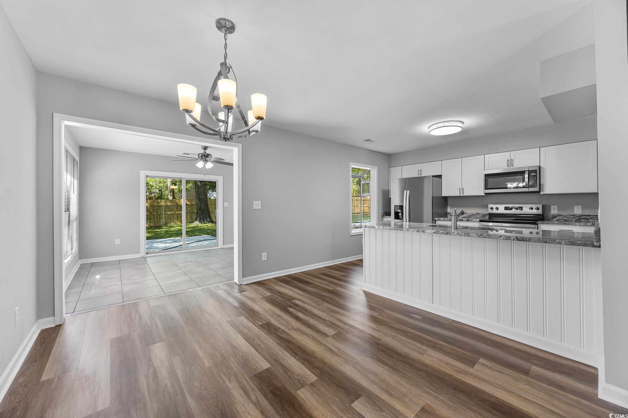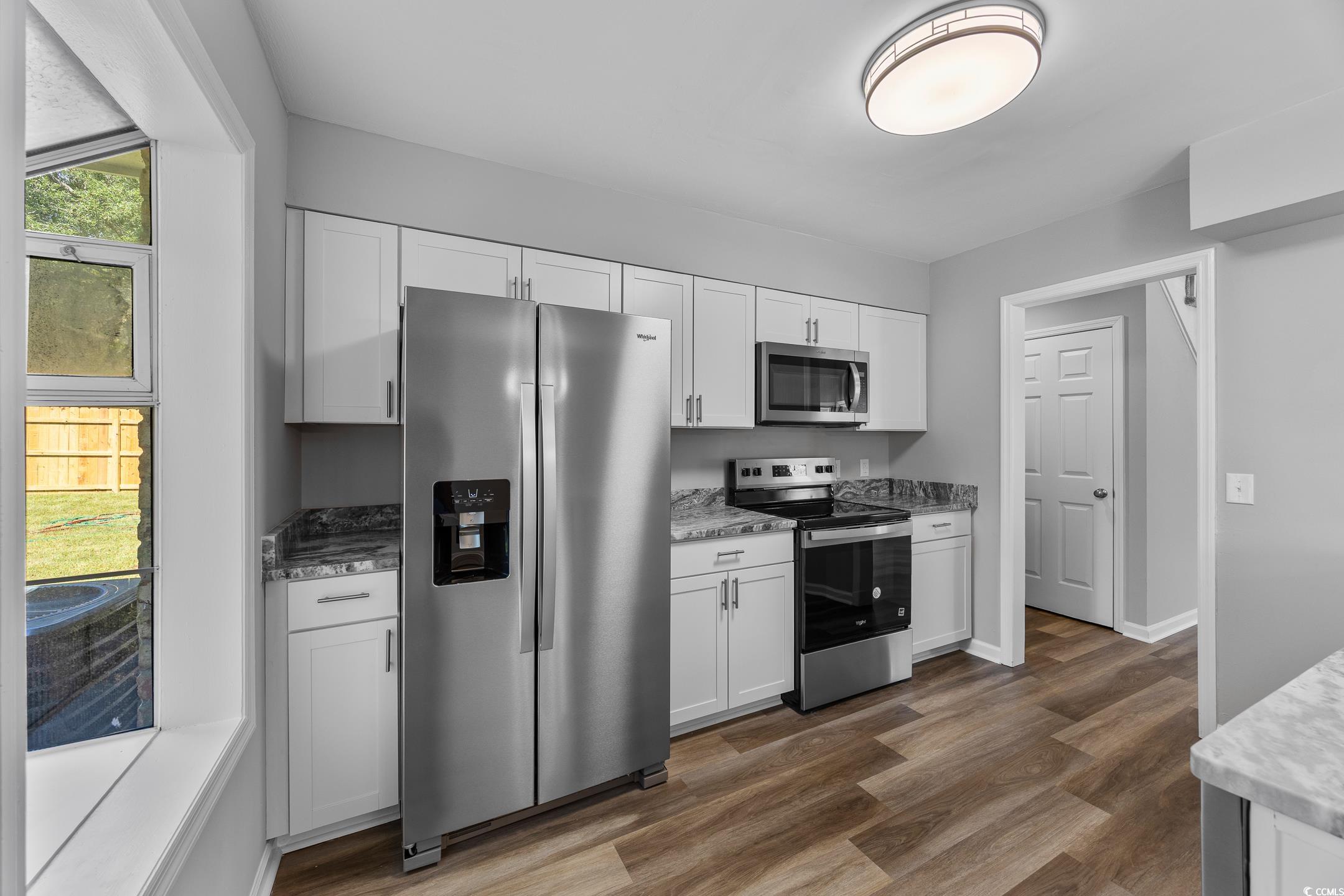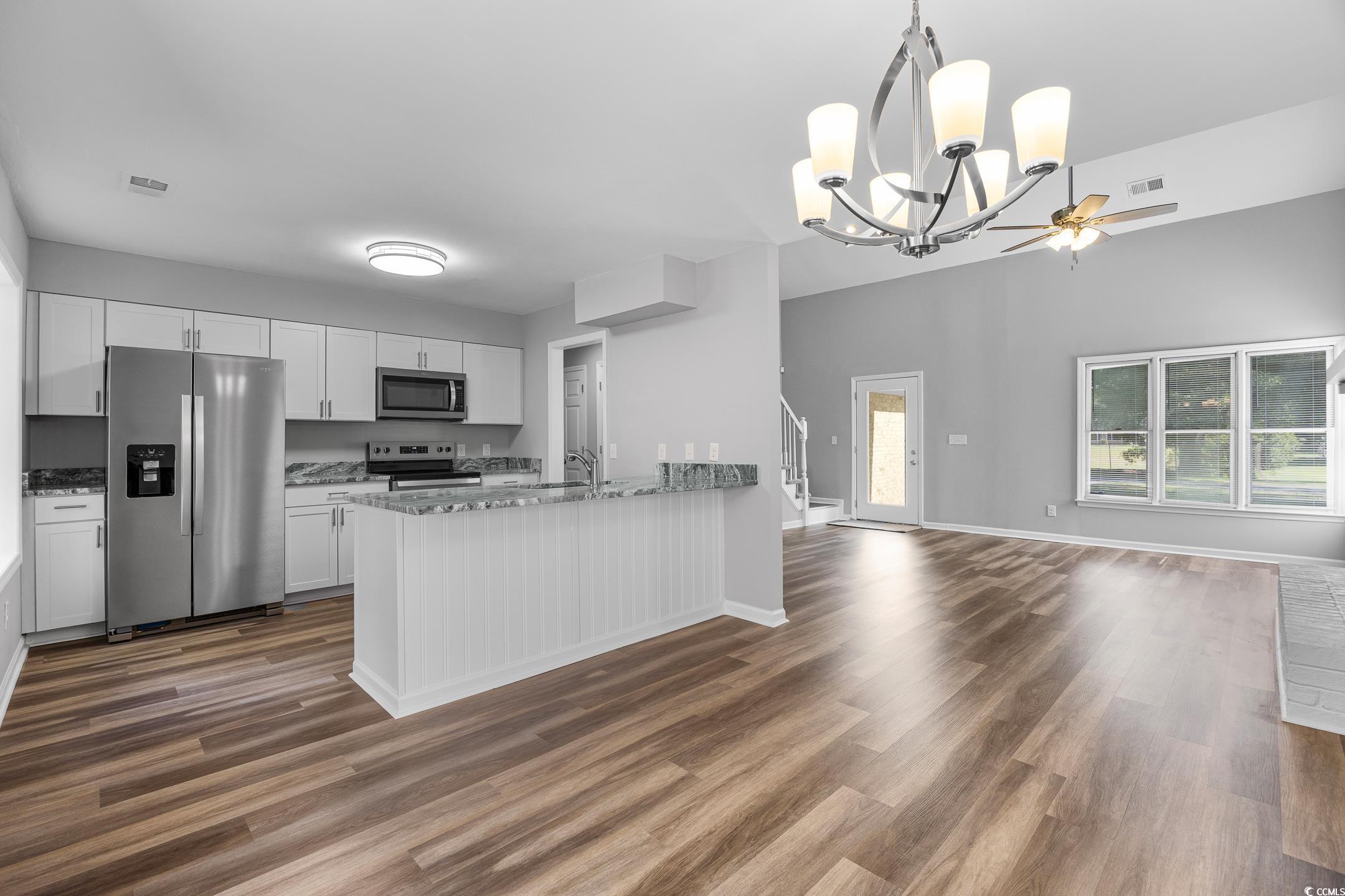 This charming all-brick 3-bedroom, 2-bath home, located east of Highway 17 in the heart of Little River on a .29 acre lot with no HOA fees, offers modern upgrades and a spacious layout perfect for comfortable living. The home features a large front porch, fresh paint, and new luxury vinyl plank flooring throughout the first floor, complemented by a spacious family room with a floor-to-ceiling brick fireplace, vaulted ceilings, and a new ceiling fan. The newly renovated kitchen boasts new cabinets, granite countertops, new fixtures, and stainless steel appliances, while the Carolina room opens to a large backyard with a spacious patio and a 6ft privacy fence. The owners suite includes a built-in sitting room/study, a walk-in closet, and a luxurious bathroom with a new vanity, dual sinks with granite countertops, and a tiled walk-in shower. Upstairs, two guest bedrooms with new carpeting share a full bath with updated vanity, granite countertops, and fixtures, plus a large storage closet. With a new roof and water heater installed in September 2025, this home is just a short walk or golf cart ride from local marinas, dining, and the Intracoastal Waterway, making it an ideal coastal retreat. Some photos in this listing have been virtually staged. Owner is SC licensed Broker/Agent.