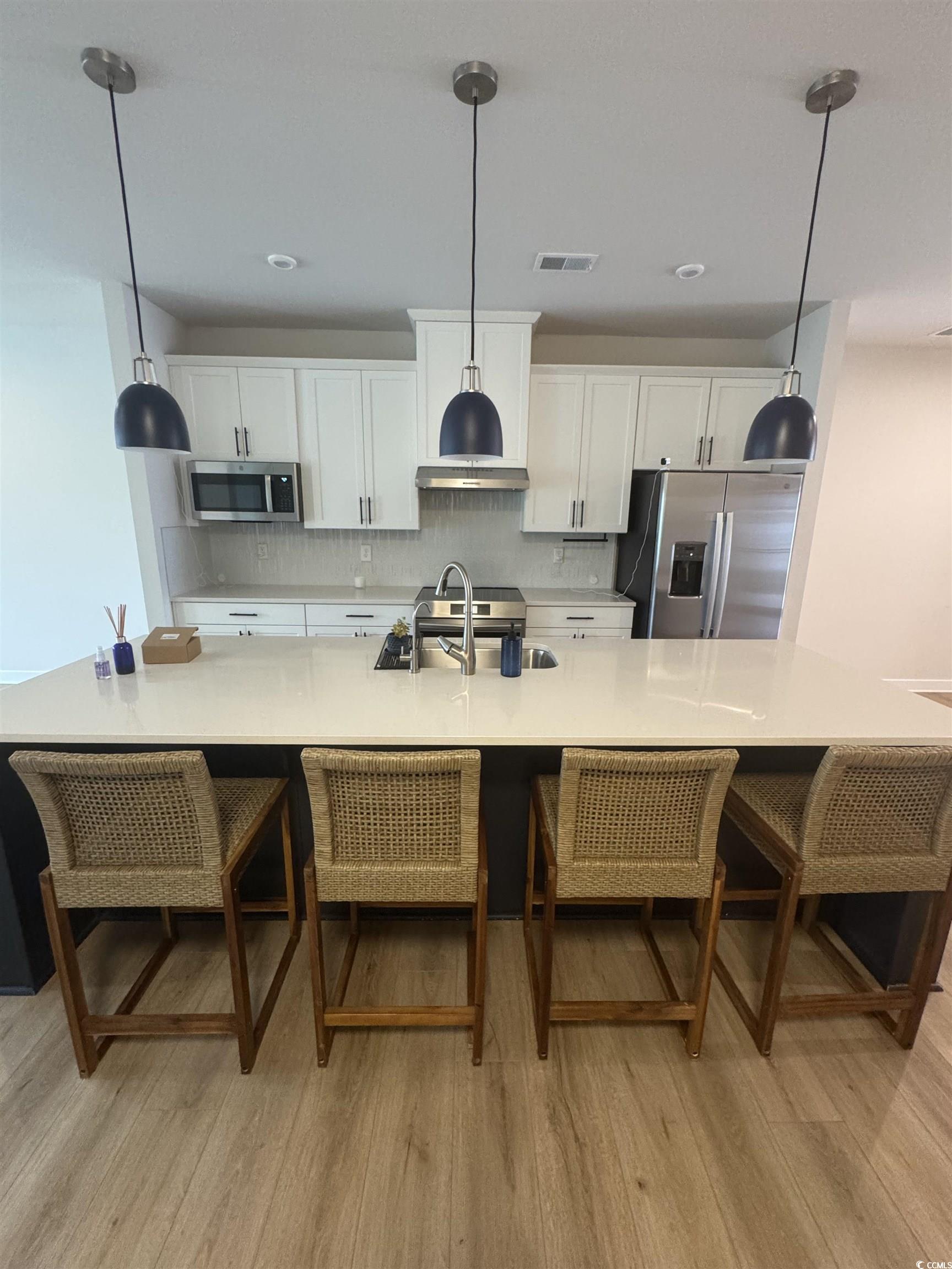 This STUNNING townhome is only 2.5 years old, making it practically brand new and turn-key ready. NUMEROUS NON-BUILDER UPGRADES, including light fixtures, ceiling fans, pantry shelving, kitchen sink water filter, and gutters, just to name a few. Plantation shutters throughout, mud room, large utility room, and primary bedroom on the 1st floor. Unique, built in vintage storage closet, perfect for wine enthusiasts. 2 bedrooms upstairs with an additional space that could be used as a 4th room or office. So much natural lighting! Picturesque views of the water and extended patio-appealing for entertaining. Convenient access to Hwy 31, Coastal Grand Mall, dining, shopping and the Myrtle Beach International Airport, make this property a must see!