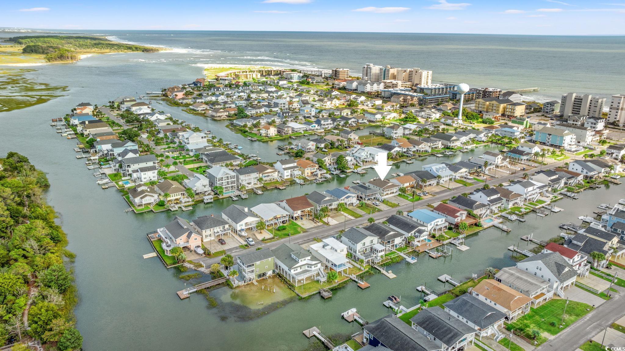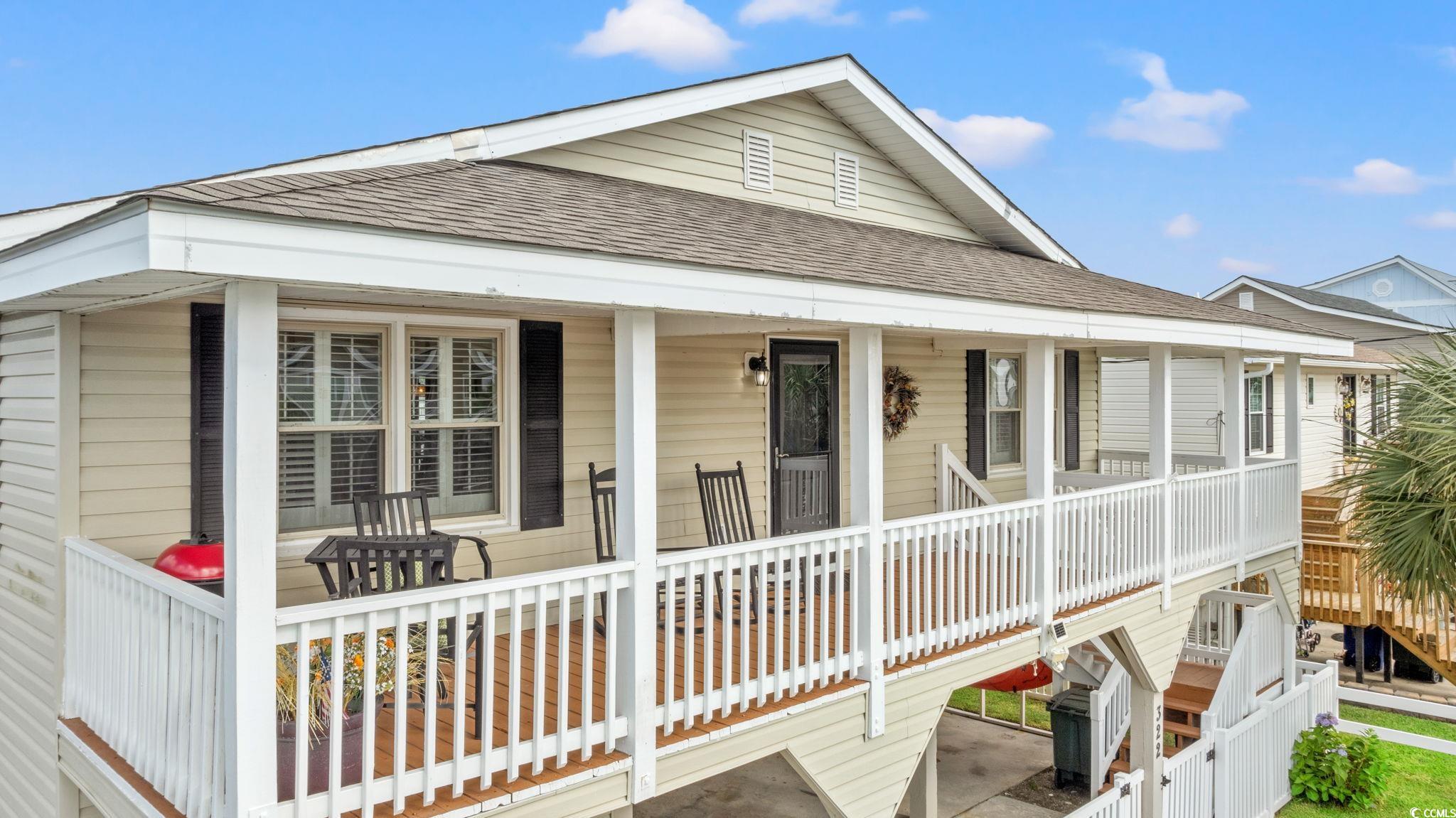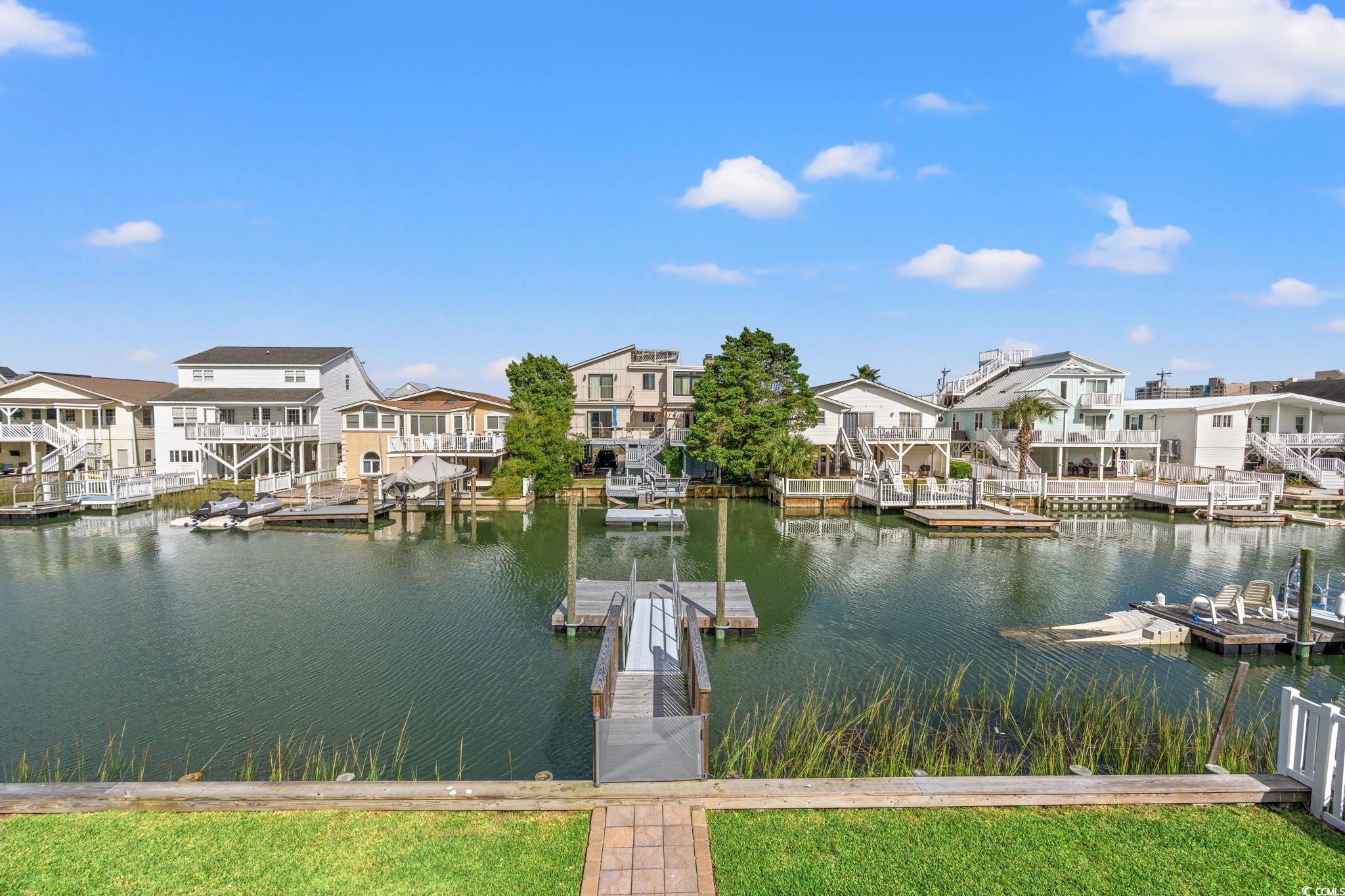 CHANNEL LOT! Here's your chance to own a charming beach house two blocks from the ocean,on the ""inside of Cherry Grove"", near a bird sanctuary! This elevated beach house is a single level floorplanthat lives largewith 4 bedrooms , 2 baths, eat-in kitchen, two decks and a large entertaining patio and ""extended back yard"". The living and dining area are the heart of the home withglass doors creating an indoor/outdoor living space opening onto a walkout deck with views!Lots of upgrades to see! Gorgeous, maintenance-free wood-looking tile floors throughout the home,new seawall and boat dock built in 2024, paver walkway to dock, two new gas tankless water heaters, and a gas line for gas grill connection. Well-manicured yard and covered patio entertaining area are fully fenced in and the ground level storage area has tons of storage featuring enclosed golf cart parking, a handy half bath, laundry area, and outdoor shower. This home has no HOA and plenty of parking for a boator RV. Potential rental projections included in documents. Don't delay on this incredible opportunity!