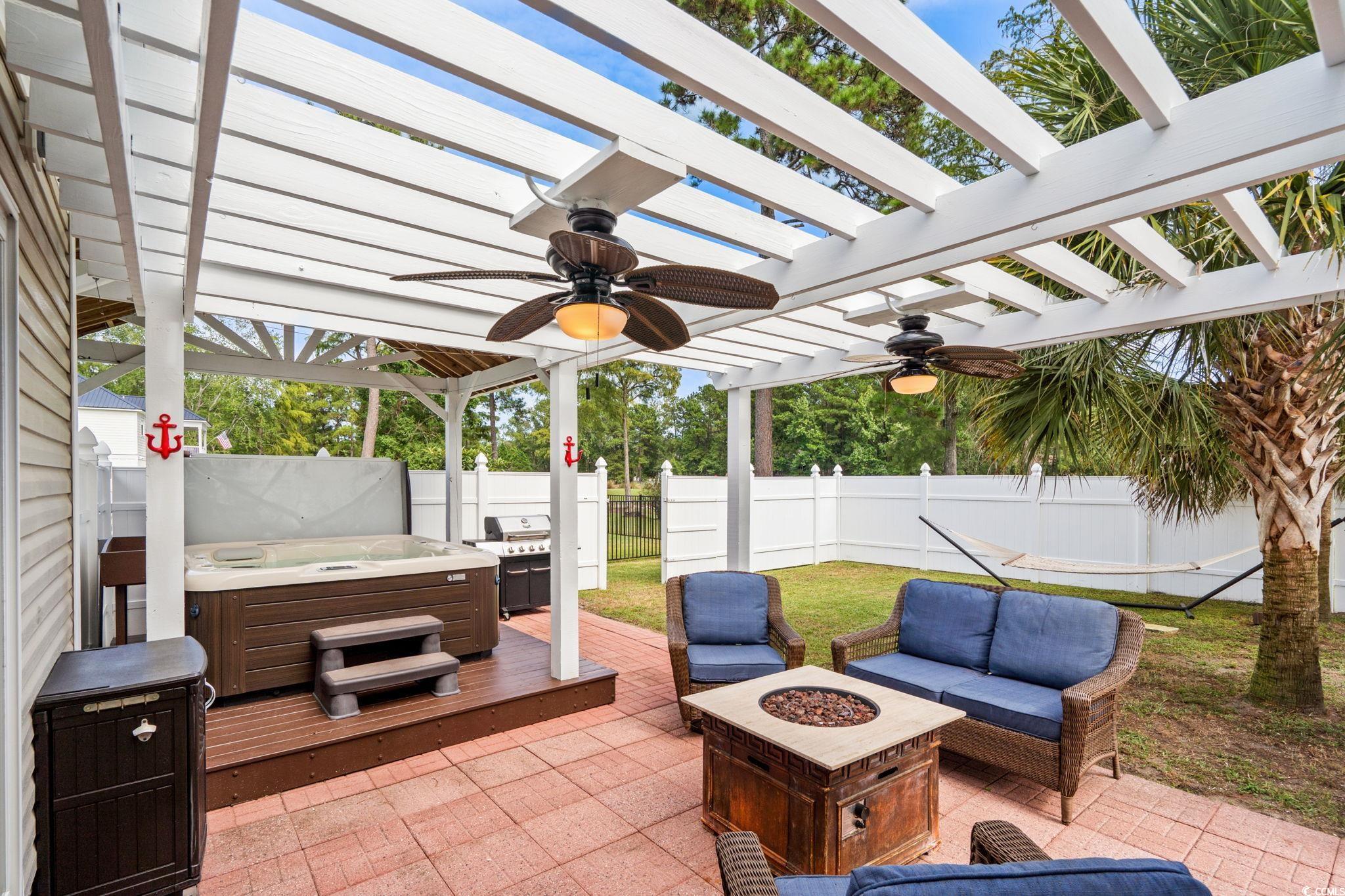 Escape to Your Pawleys Island Oasis! Discover this charming 3-bedroom, 2-bathroom home with a two-car garage, perfectly nestled in the highly sought-after Hagley Estates of Pawleys Island, SC. Renowned for its generous lots and abundant trees, Hagley Estates offers a serene escape just minutes from the Intracoastal Waterway, Hagley Boat Landing, and The Founders Club Golf Course. Golf enthusiasts will love the proximity to numerous other highly-regarded courses in the area. Enjoy quick access to the beautiful Pawleys Island beaches, a diverse array of amazing restaurants, convenient grocery stores, and all the fantastic amenities this area has to offer. Situated on a peaceful street, this property boasts a spacious .37-acre lot adorned with 9 mature palm trees, charming outdoor lighting, and a 6-foot privacy fence, all while offering scenic views of the Founders Club golf course. While joining the POA is voluntary, it provides the bonus of a very affordable cable internet package. This home is designed for easy living with a newer roof (2024), a convenient split floor plan, a vaulted ceiling, and carpet-free flooring throughout for effortless maintenance. Step into your very own backyard oasis, where relaxation and fun are always on the agenda! Take a refreshing dip in the 16 x 32 gunite pool (4-6 FT), complete with adorable and inviting turtle murals. Unwind in the soothing hot tub equipped with numerous jets, gather under the charming pergola, or enjoy cozy evenings around the fire pit - perfect for entertaining friends and family or simply unwinding after a day at the beach. ----- The golf course view is beyond the privacy fence, offering space to play ball or relax and check out the golfers!