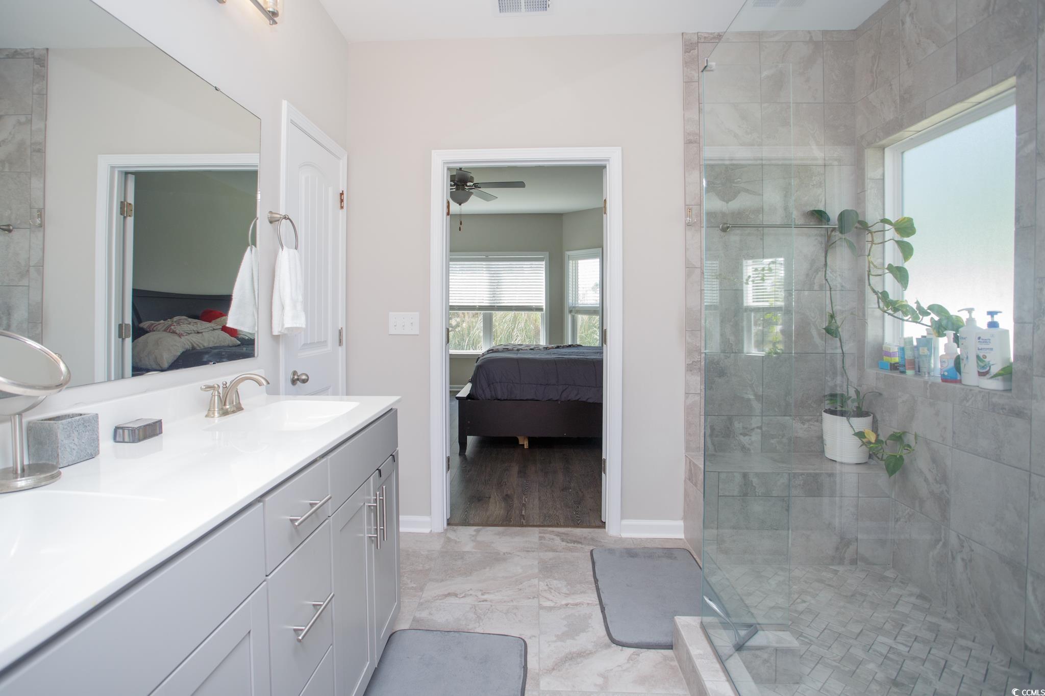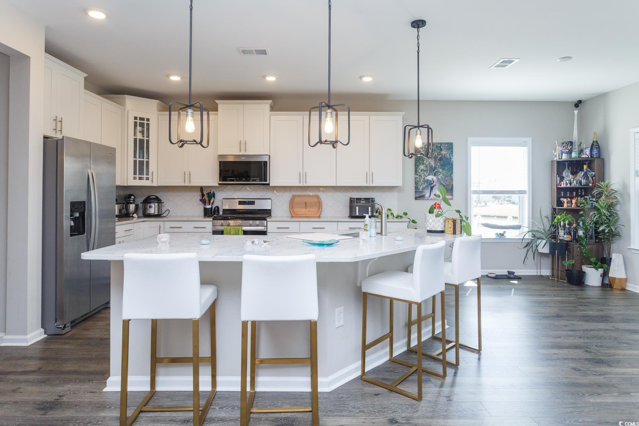 Gorgeous 3 bedroom, 2 bath home with top-of-the-line appliances. Whirlpool Stainless Steel side-by-side refrigerator, natural gas range, over-the-range microwave vented to the exterior, dishwasher and garbage disposal. Whirlpool washer and dryer, lawn irrigation system and gutters. Contemporary-farmhouse style with open concept design, spacious bedrooms and a 32 ft. screened porch with a water view. Shaker style kitchen cabinets in crisp white. Quartz countertops, a single bowl stainless steel kitchen sink located in the large island, hexagon tile back splash-Modern White, upgraded contemporary-farmhouse style lighting throughout, ceiling fans, Moen satin nickel plumbing fixtures, Mohawk REV Wood flooring in the living areas and Primary bedroom, Daltile Memoir-Petal Black tile flooring in the laundry room, powder room and Primary bath. The Primary bath includes a walk-in spa tiled shower, a wall shower head and rain shower head. Energy Star Certified to ensure cost savings and comfort. Amenities galore such as community pool, clubhouse, exercise room, sidewalks, fishing lakes and non-motorized boating lakes. Convenient location close to shopping, dining and the lovely Market Commons. Between the two-17's, across the street from South Strand Commons (Lowes Foods, Kohl's, Lowes Hardware, McCallister's Deli and more). Belle Mer is a golf cart community. Residents can easily drive their golf cart to the pool, clubhouse and nearby shopping and dining venues. See today!! Bring all offers!!