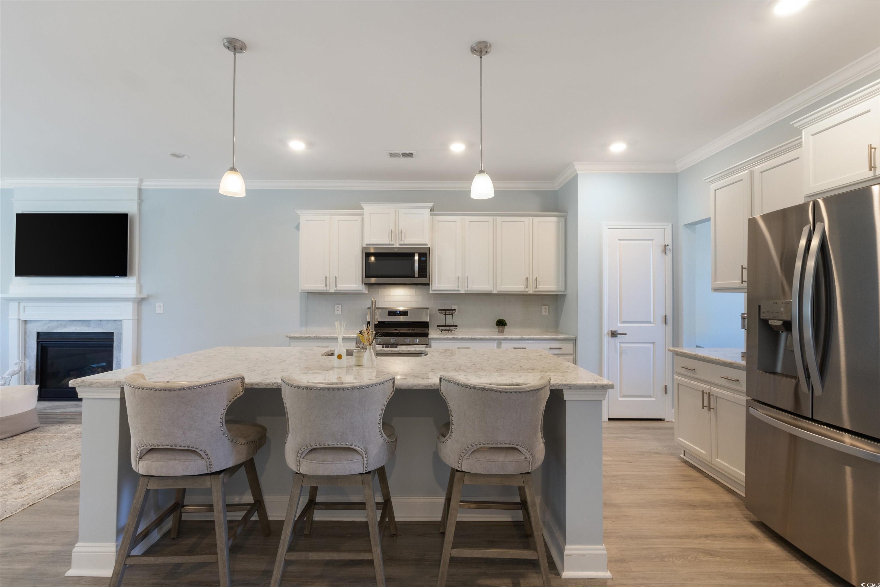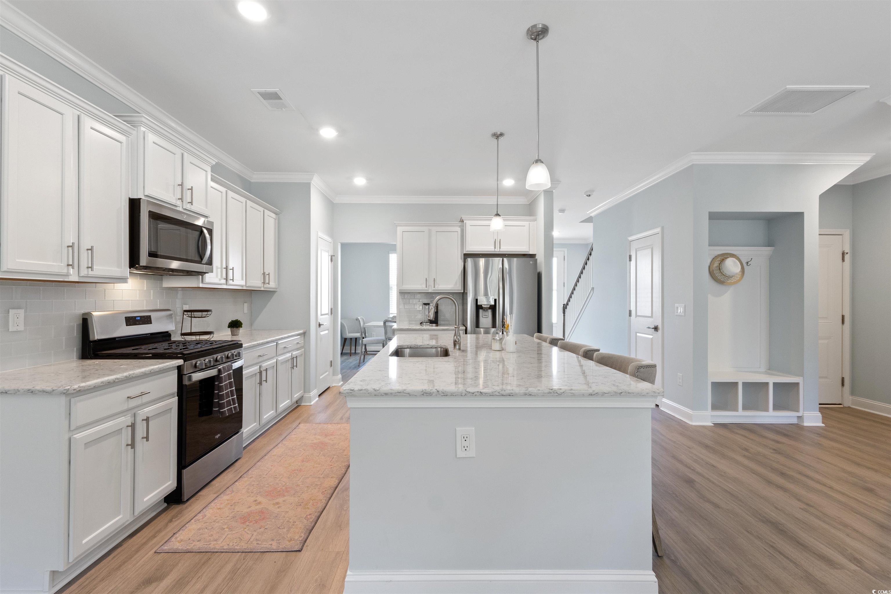 Location, Location, Location! If you appreciate beautiful upgrades and great location, this home is a must see. Welcome to one of the Best Located Properties in Heather Glen! Enjoy a short stroll to the clubhouse/pool for a refreshing swim, then unwind in the privacy of your screened-in patio and take in the serene beauty of the surrounding preserve. Upon entry of the home you will see the elegantly upgraded oak staircase and open spindles at the top of the stairway (no knee wall) & crown molding throughout. The beautiful wood laminate flooring runs throughout the entire first floor. Continuing on your D/R will be on your right and then your open concept kitchen & L/R. The kitchen is elegantly appointed with an 8' quartz island and countertops, a large pantry and an abundance of natural light. This kitchen is a chef's dream and an entertainers paradise. Whether you're hosting friends or enjoying a quiet evening with family, this open space offers the perfect balance of function and style. There is a 1/2 bath adjacent to the kitchen. The 1st floor Primary Bedroom is spacious and has a large walk-in closet that's been custom fitted by Closet by Design. The en-suite has been fitted with a soaking tub, a 5' tiled walk-in shower, w/c, and double vanity sink. Upstairs you will find a very large versatile loft area, a laundry room, 4 bedrooms and 2 bathrooms. This home has gutters, irrigation, an outdoor rear patio, a gas line installed for a gas grill, ADT security which is optional to a new owner. The blinds convey. Heather Glen is a natural gas community where homeowners enjoy a large clubhouse with sprawling verandas, a resort style pool, state the art fitness center, fenced dog park, playground area and a shared garden.