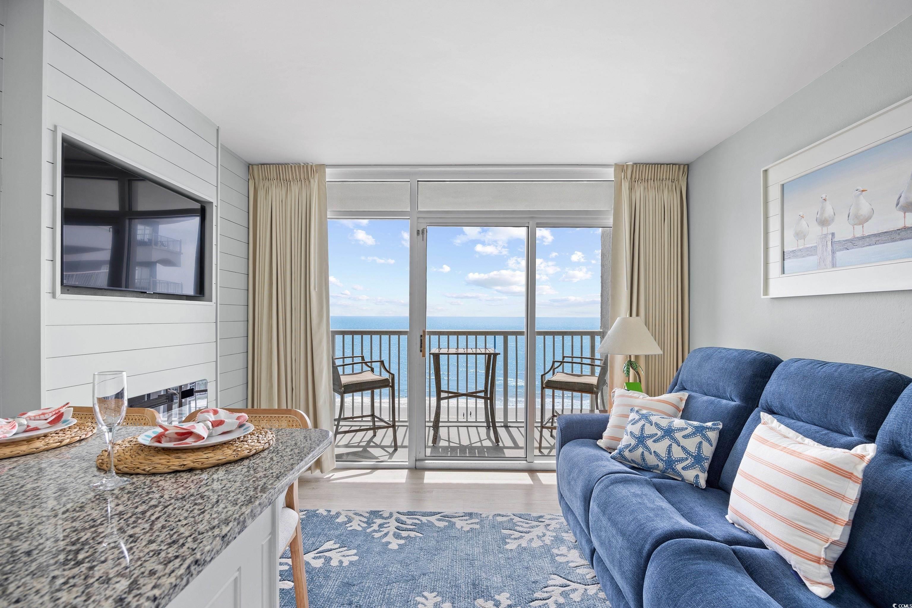 Nicely renovated one-bedroom, one-bathroom condo with a full kitchen and direct oceanfront views from the balcony. This property has smooth ceilings and LVP continuous flooring. The bathroom has a newly tiled walk-in shower with an updated vanity. The kitchen has updated shaker cabinets, a dishwasher, a range, a microwave, and a refrigerator. The living room boasts a ship lap built-in electric fireplace with a flat screen TV. This spacious living area has beadboard walls, newer furniture, and 2 2-seat breakfast bar. There is also a 2-seat pub table on the balcony. Enjoy all of Seawatch's amenities, including two indoor pools, five outdoor pools, 12 jacuzzis, a lazy river, oceanfront restaurant, and much more. This property would make a great second home, rental property, or primary residence. A must see!