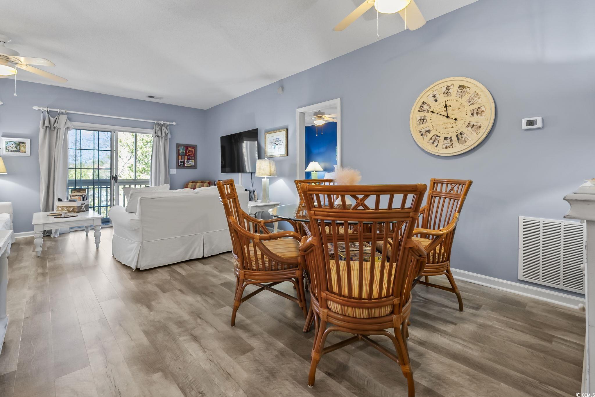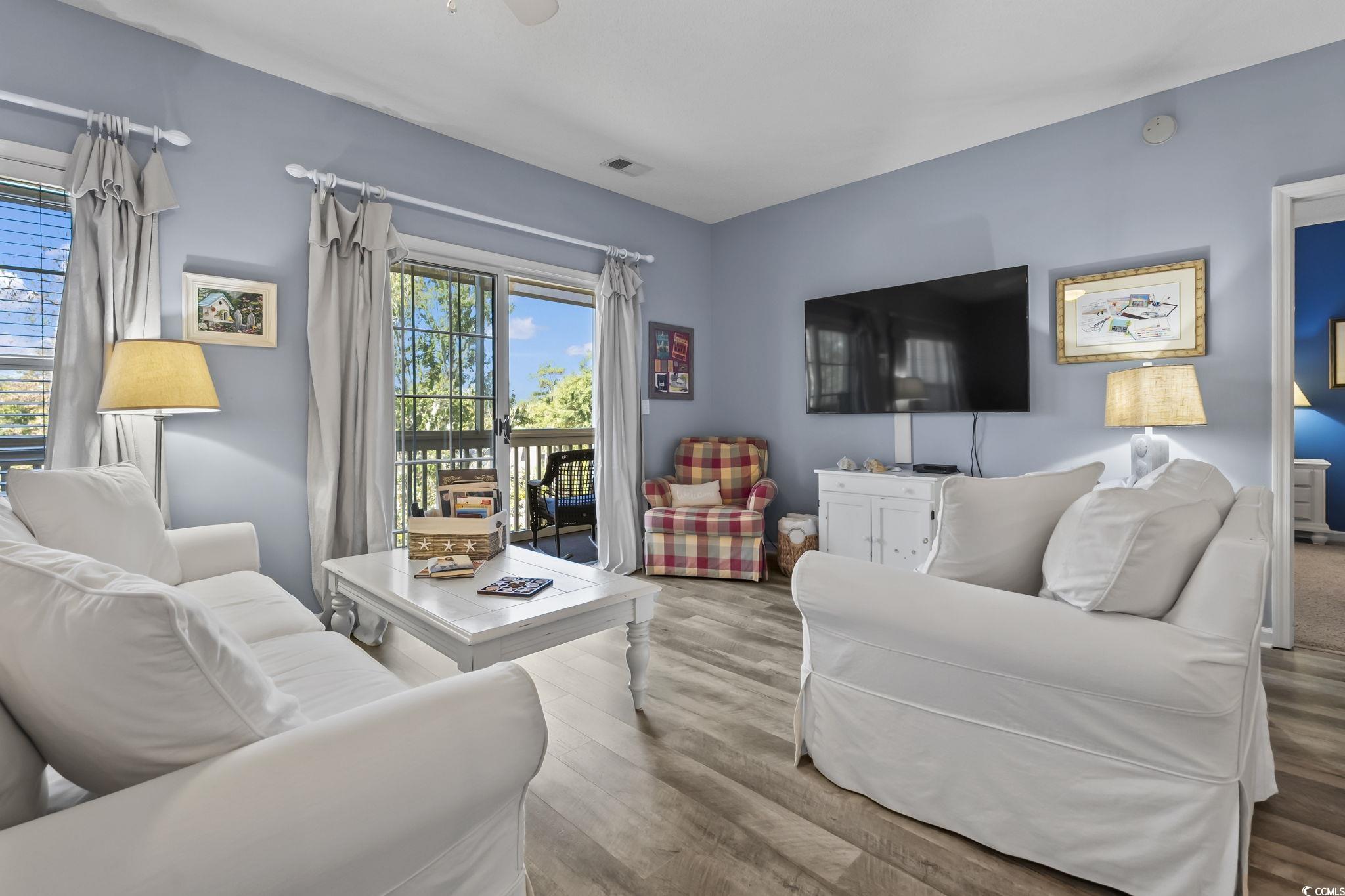 This condo will absolutely stop you in your tracks the moment you see that view. The screened-in deck is huge and overlooks the water, the perfect spot to relax or entertain. Inside, the open floor plan feels bright and coastal, featuring beautiful LVP floors in the main living areas and stylish beachy furniture throughout. Its being sold fully furnished, so you can move right in and start enjoying the North Myrtle Beach lifestyle. Located in a well maintained complex with a pool, this top floor 3-bedroom end unit offers plenty of space and a great layout with split bedrooms and the primary having its own access to the screened in balcony. Youre just a short golf cart ride to the beach, Main Street, shopping, dining, and local events. Whether youre looking for a full-time home, vacation getaway, or investment property, this one checks every box. Short and long-term rentals are allowed, the HOA covers almost everything except interior electric, and your HO-6 policy, owners are welcome to bring pets. Come see it for yourself, the view is truly unforgettable.