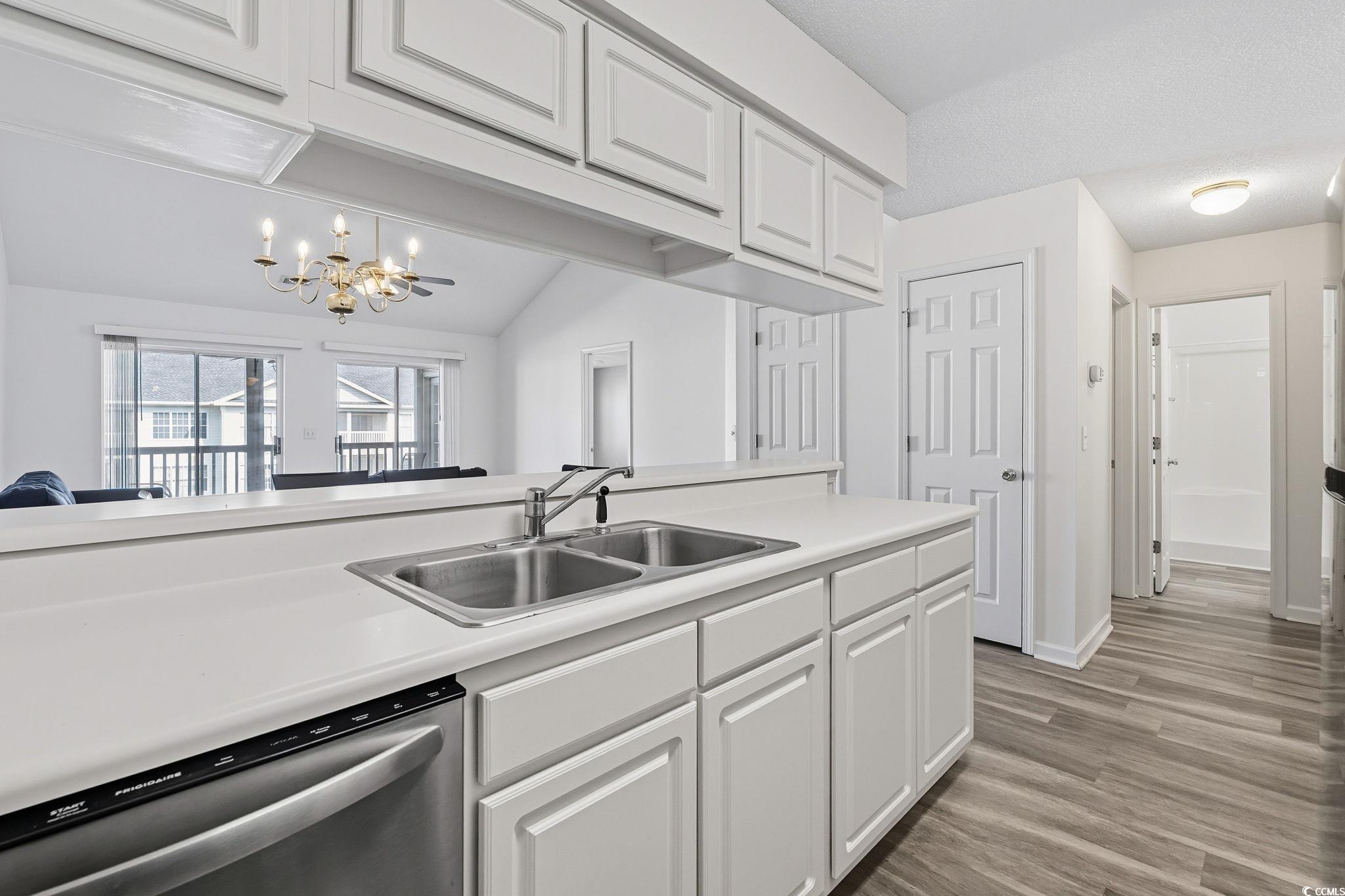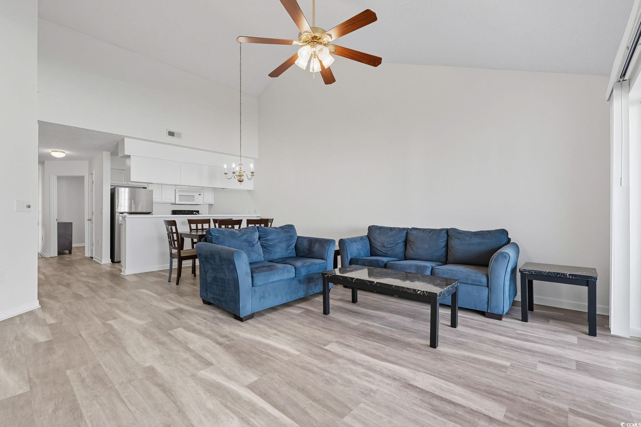 This beautifully maintained 3-bedroom, 2-bath condo offers an open and inviting layout with tremendous natural light throughout. The spacious living and dining area features vaulted ceilings and flows seamlessly into the kitchen, which offers bright white cabinetry, and a convenient breakfast bar. Luxury vinyl plank (LVP) flooring extends throughout the entire condo, providing a modern and cohesive look, while tile flooring enhances durability in both bathrooms and the laundry room. The primary suite provides a comfortable retreat with a walk-in closet, private bath, and direct access to the balcony - perfect for enjoying your morning coffee or evening breeze. Two additional bedrooms are thoughtfully positioned for guests or a home office. Step outside to the open balcony and take in the peaceful lake views, offering a relaxing outdoor space to unwind. The community boasts a clubhouse and pool with easy access to the beach, just 1.2 miles away. Conveniently located near restaurants, medical facilities, Surfside and Garden City piers, golf courses, the MarshWalk, the airport, and all South Carolina state parks. Jasmine Lake offers a pool and clubhouse overlooking the lake, providing a serene and coastal ambiance. Don't miss this fantastic opportunity to own a turnkey condo in a perfect location -Just a short ride to golf courses, entertainment, the Atlantic Ocean, Murrells Inlet MarshWalk and endless dining and shopping options. Plus, it's only 90 miles north of historic Charleston, SC. It's the perfect blend of comfort, convenience, and coastal charm. Schedule your showing today! Measurements are not guaranteed. Buyer is responsible for verifying.