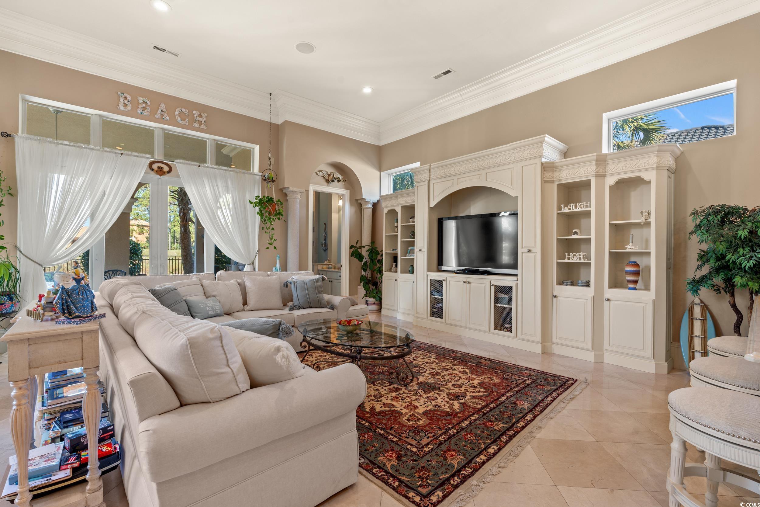 What an incredible showcase home! This former model property stands out as one of the most impressive residences in the community. Perfectly positioned on Serena Drive, just across the bridge, this stunning home sits on a premier golf course lot overlooking a serene lake and the tee box of No. 7 on the resort course. With more than 7,700 square feet under roof, it features four generous bedrooms, a two-story library, an expansive media room, and an oversized three-car garage. Crafted with superior ICF construction, this home offers soaring vaulted ceilings, detailed trim work, elegant trey ceilings, and beautiful porcelain tile in the main living spaces. The master suite boasts upgraded wood flooring, a luxurious bathroom with a whirlpool tub and spa-style shower, and custom cabinetry paired with top-tier appliances. Additional highlights include a striking stone fireplace, a gorgeous wine room, and captivating golf and water views from both the main level and the upstairs covered terrace. Step outside to enjoy lush, mature landscaping and a thoughtfully designed outdoor retreat, complete with a summer kitchen, pool, and hot tubperfect for relaxing or entertaining after a day at the beach. Located in Grande Dunes, one of South Carolinas most sought-after coastal communities in Myrtle Beach, this 2,600-acre development offers unmatched lifestyle amenities. Residents enjoy exclusive access to the 25,000-square-foot Ocean Club, featuring fine dining, oceanfront pools with food and beverage service, meeting spaces, and year-round activities. The community also offers two championship 18-hole golf courses, a deep-water marina, Har-Tru tennis courts, and miles of scenic biking and walking trails. This is a rare opportunity to own a true masterpiece in a premier coastal setting.