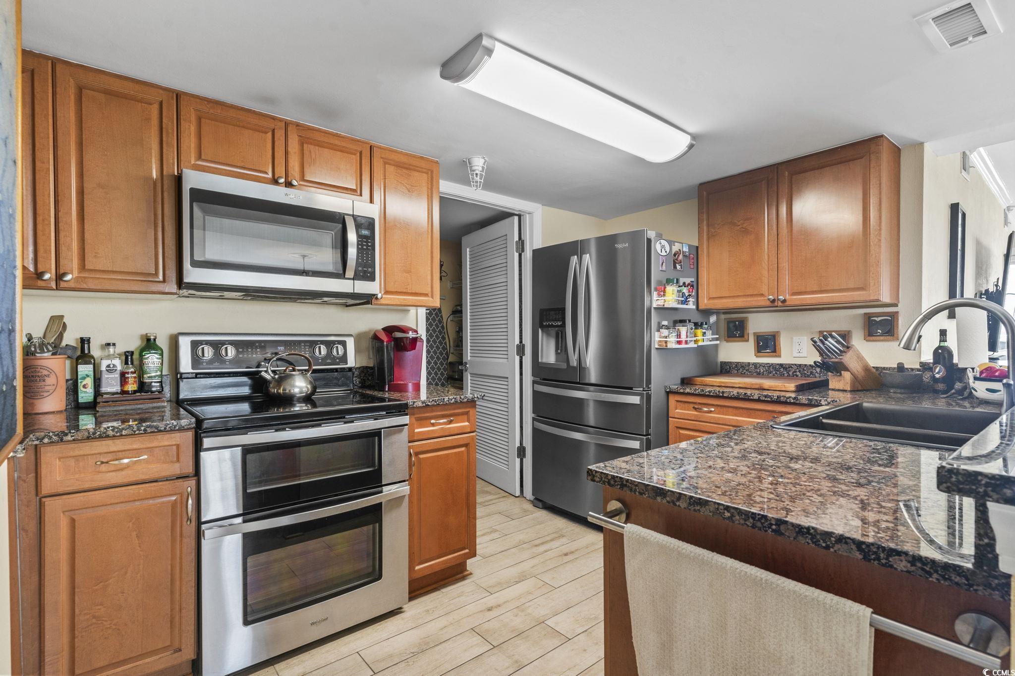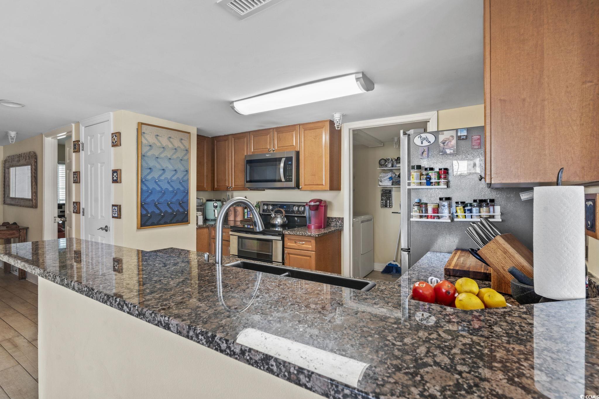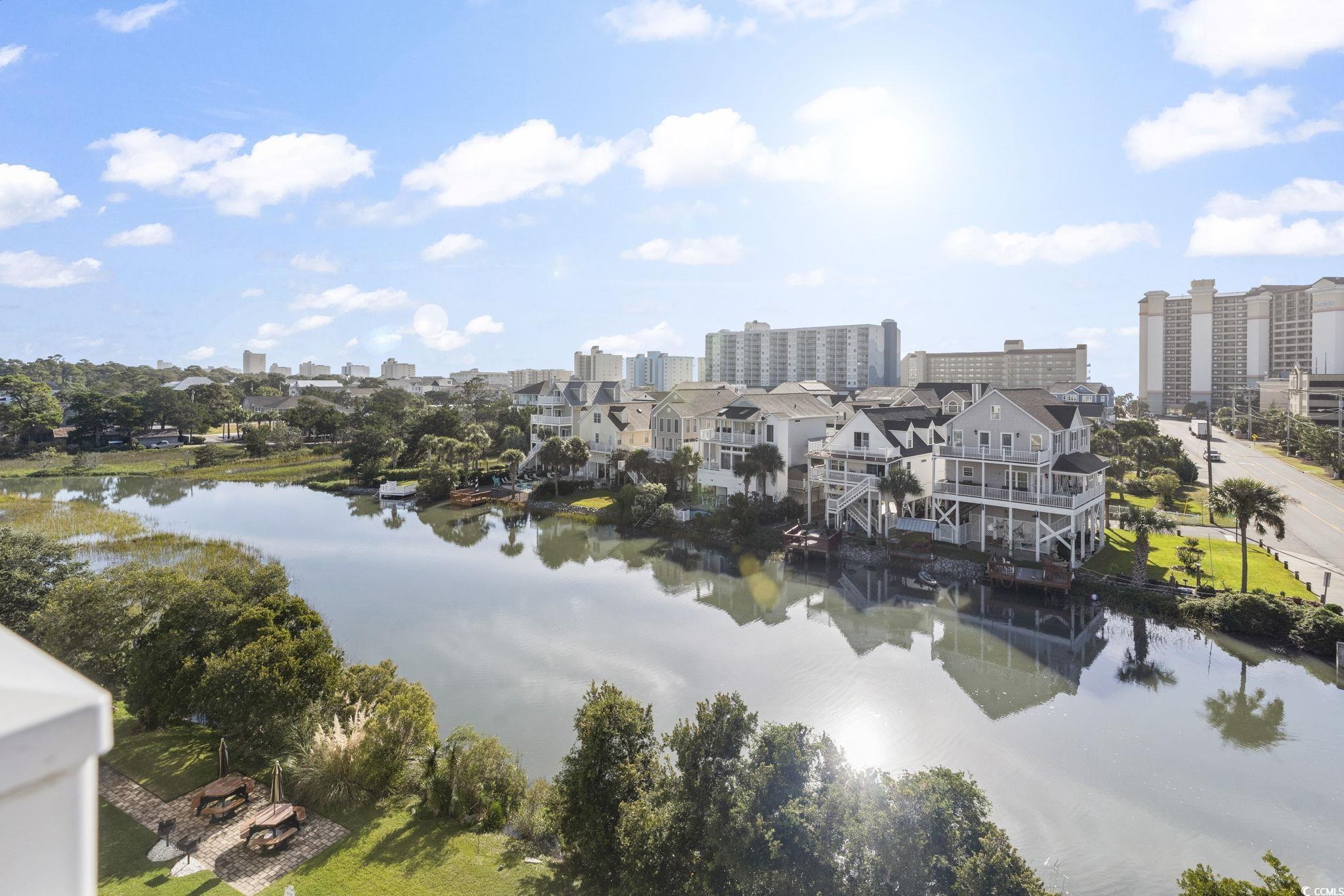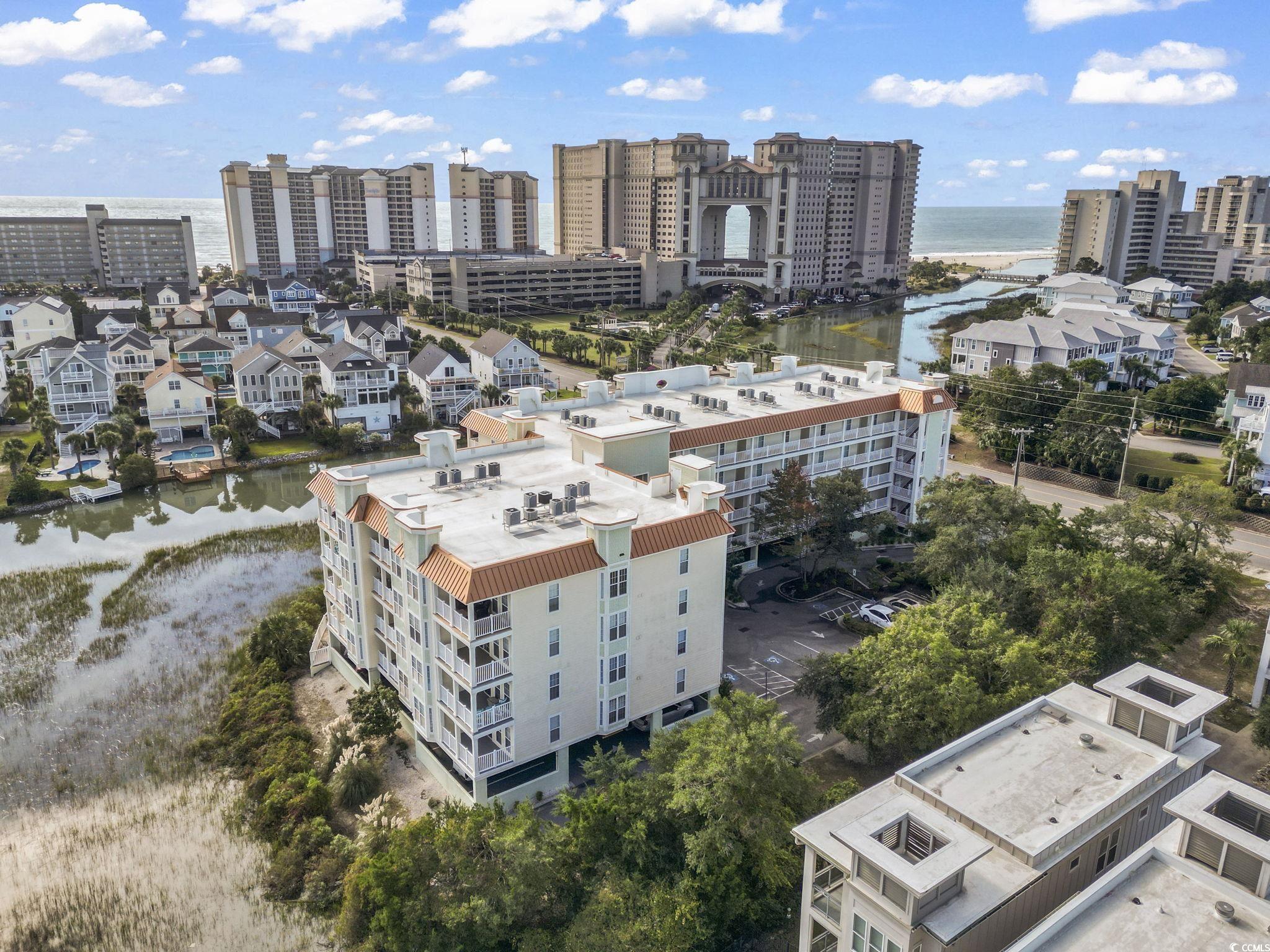Top floor end unit. Best view in the building. This 3 bedroom, three bath unit includes Stainless Steel appliances, granite countertops, tile flooring throughout. Updated primary bath. Spectacular views of the marsh and ocean. Ocean Marsh complex features an in-ground pool, kiddie pool, and jacuzzi, picnic area. Complex is nicely landscaped with 2 elevators and covered parking. Take a golf cart or simply walk to the ocean and Barefoot Landing. Don't miss this special opportunity.