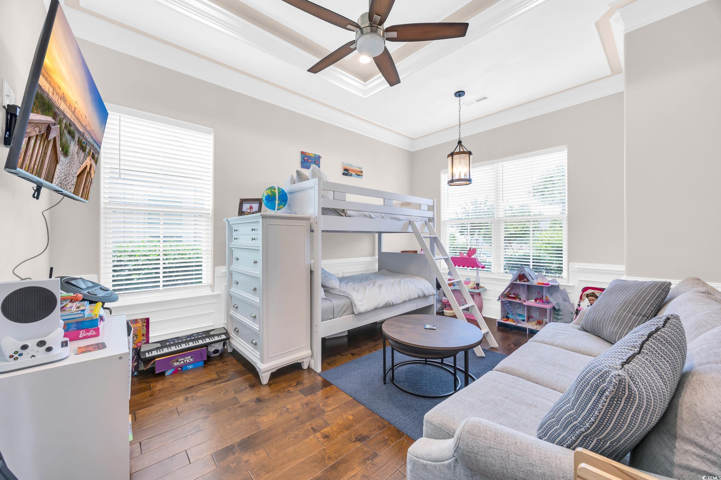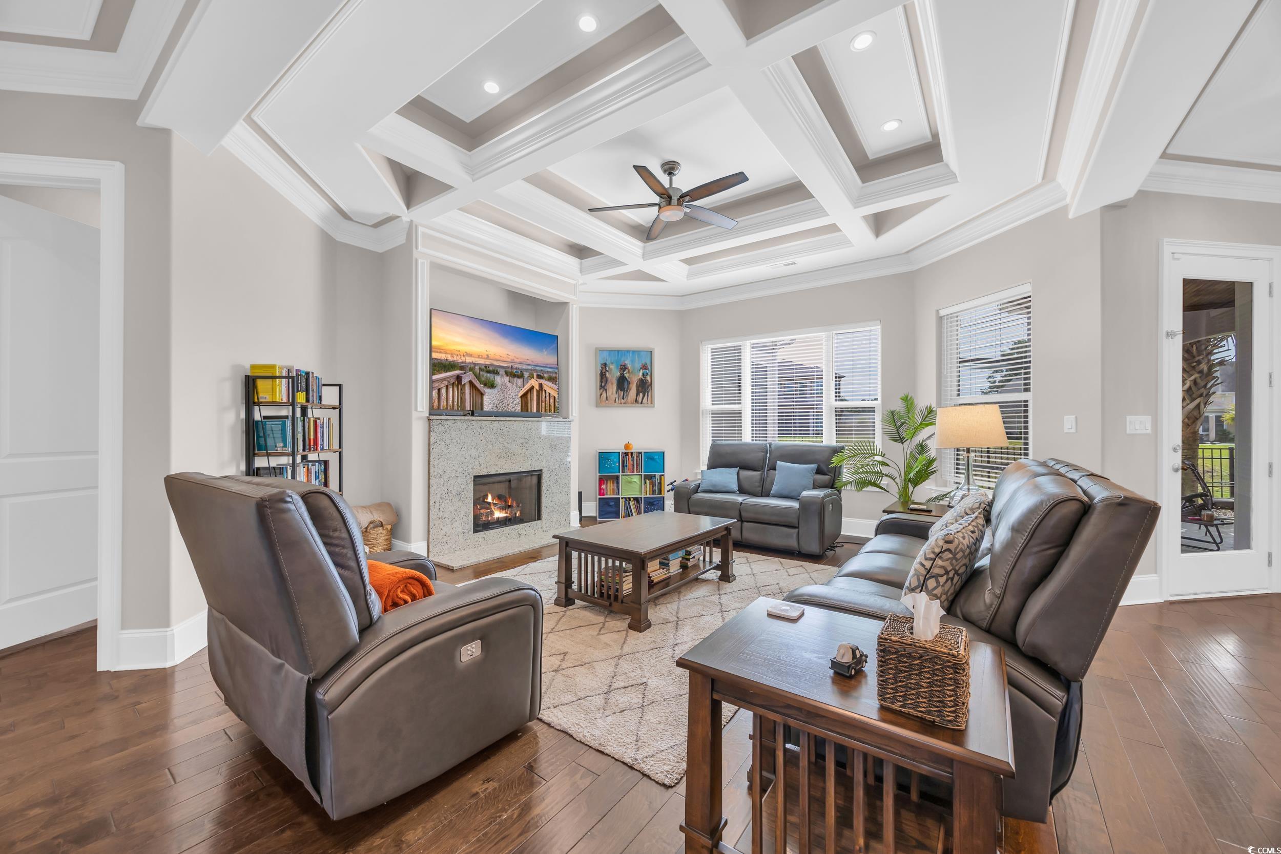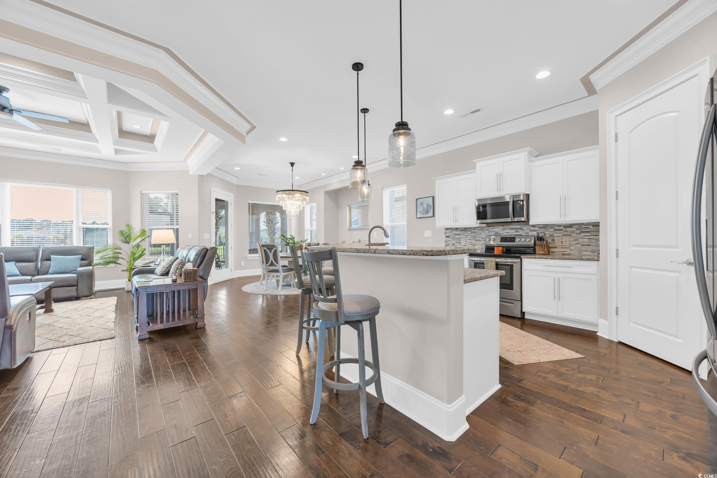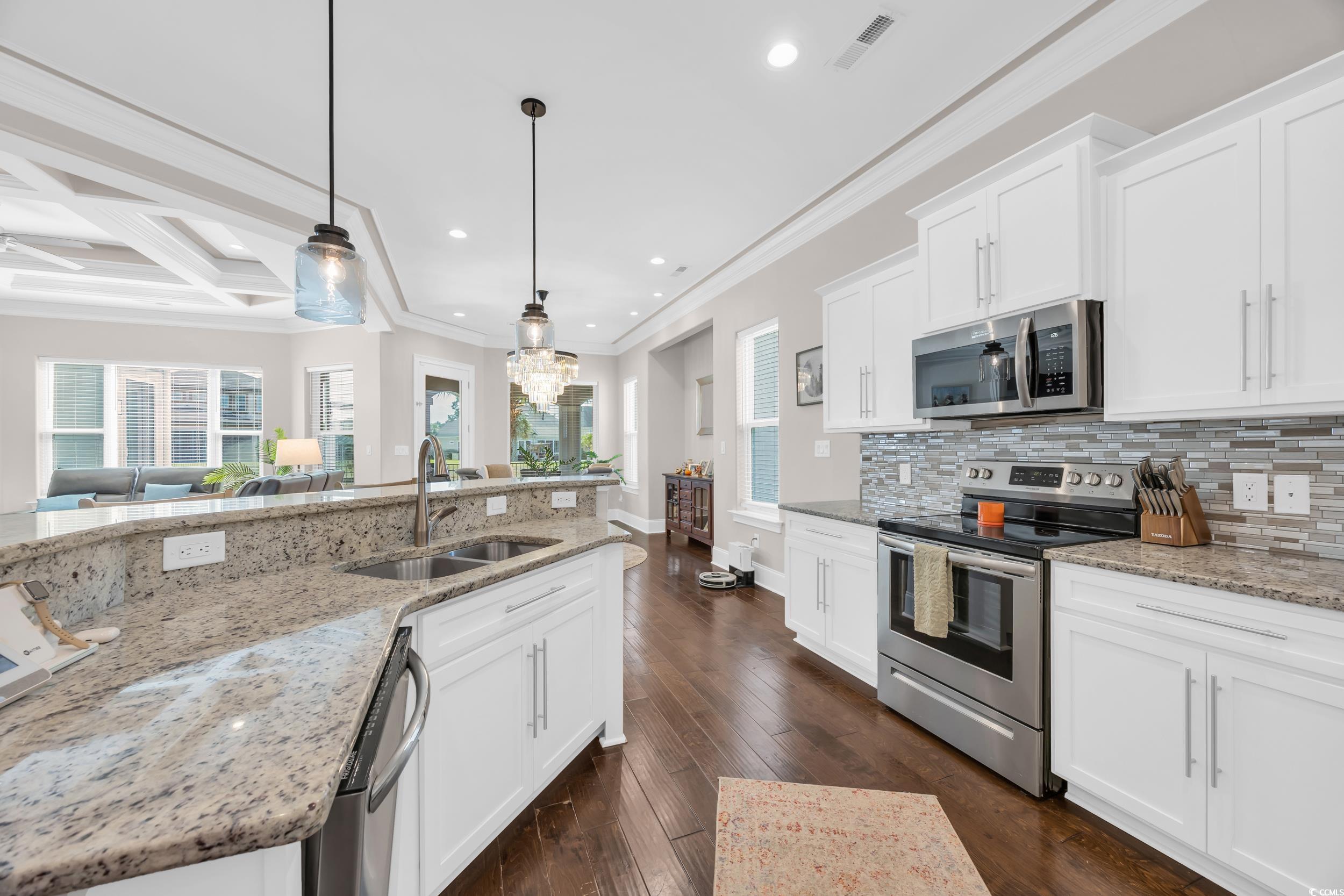 Four bedroom Mediterranean ranch with a three car garage and a tranquil pond view in The Bluffs on the Waterway, a gated community known for first class amenities including two elegant clubhouses, a resort style pool, private boat launch and day docks, boat and RV storage, tennis and pickleball, playground, and walking trails just minutes from the beach. This amenity rich lifestyle sets the tone the moment you arrive, promising everyday relaxation and effortless entertaining. Inside, the open concept great room flows into a chefs kitchen with granite countertops, stainless appliances, and a tile backsplash, while wide plank flooring, plantation shutters, custom lighting, and crown molding elevate every space. The owners suite pampers with a walk in shower and dual vanities, and a flexible office or bonus room offers abundant storage. Ideally located near Carolina Forest golf, shopping, dining, medical services, and the airport, this home is move in readybring your boat and start living the Waterway dream.Move in ready and golf cart friendly, so bring your boat and start living the Waterway dream!