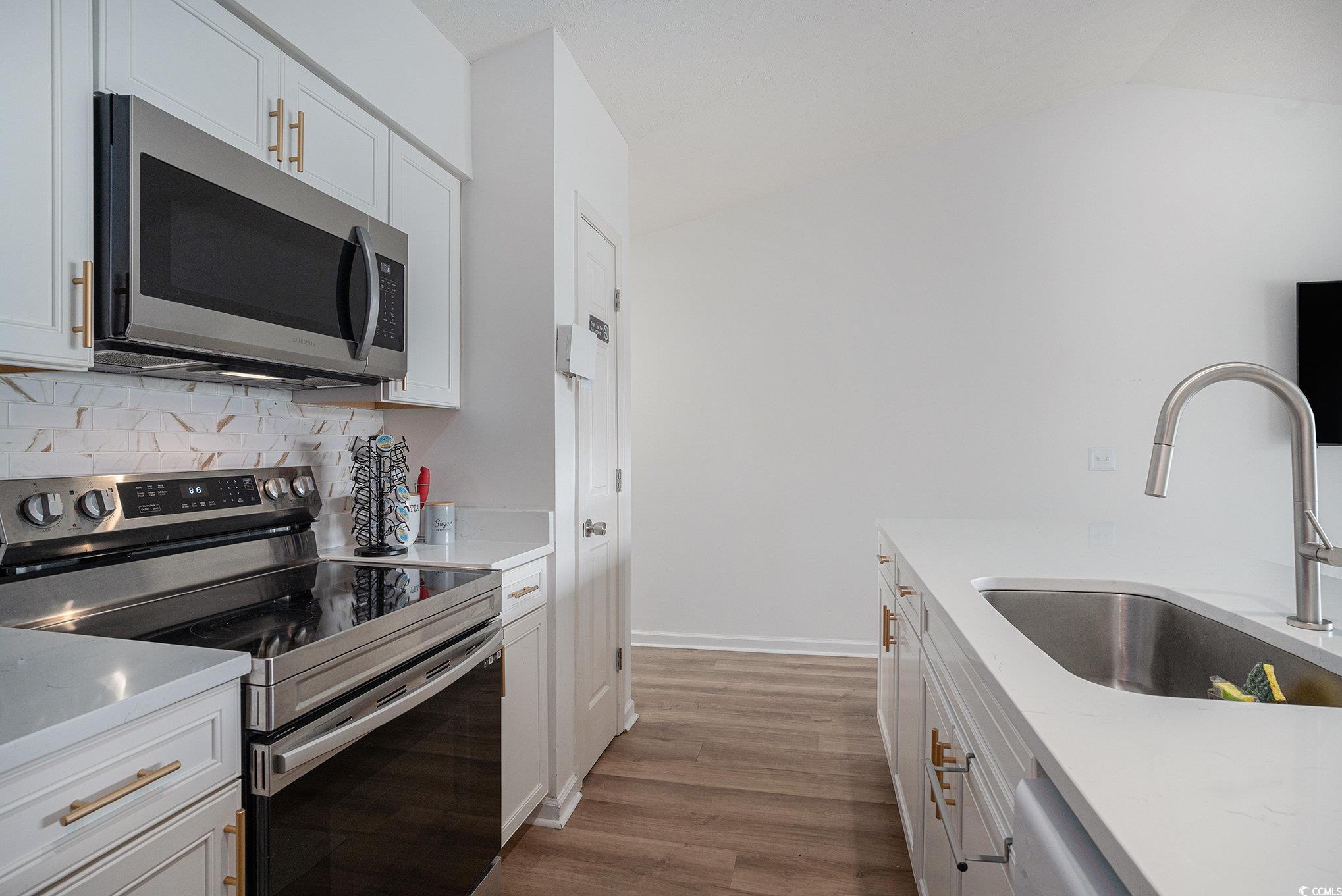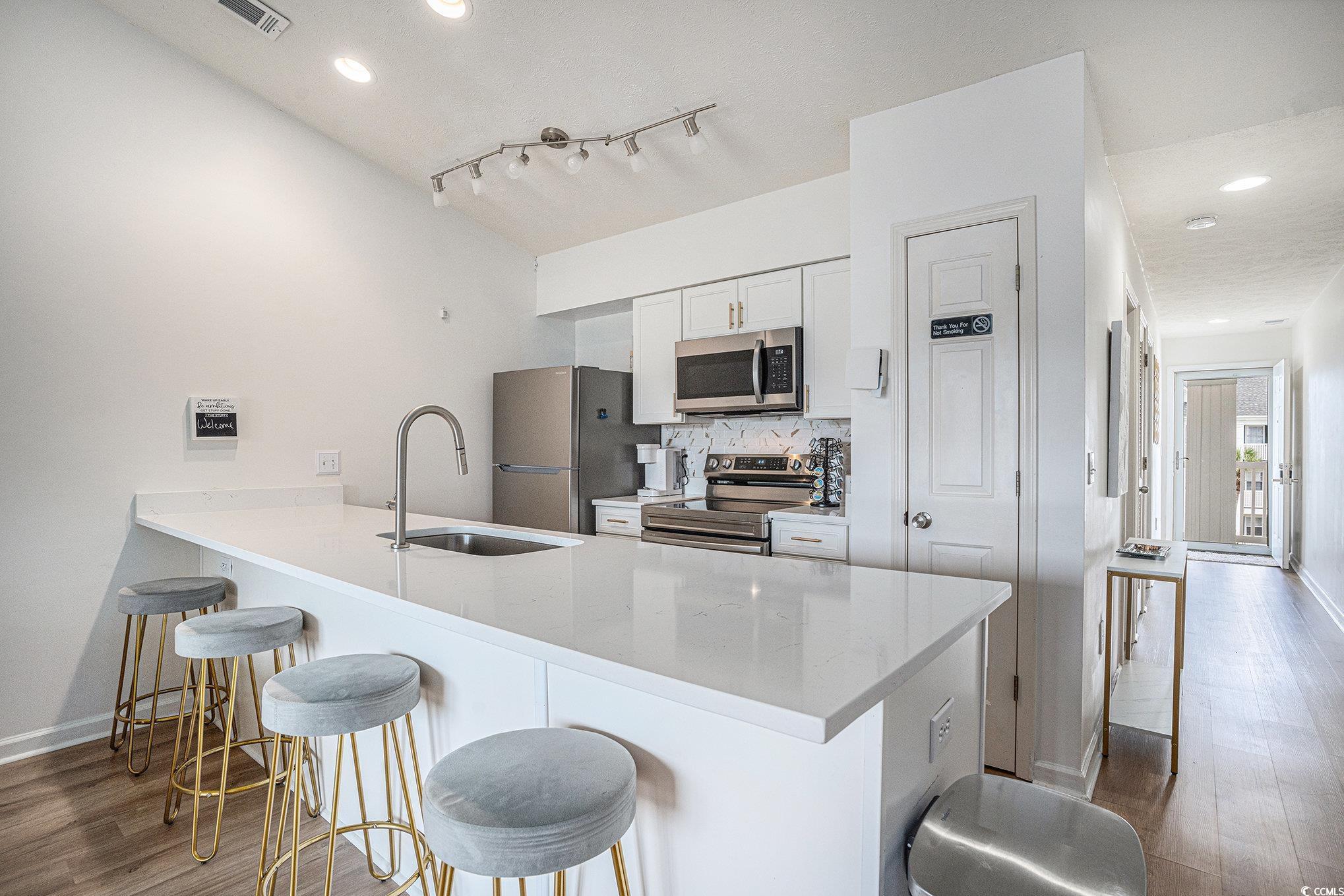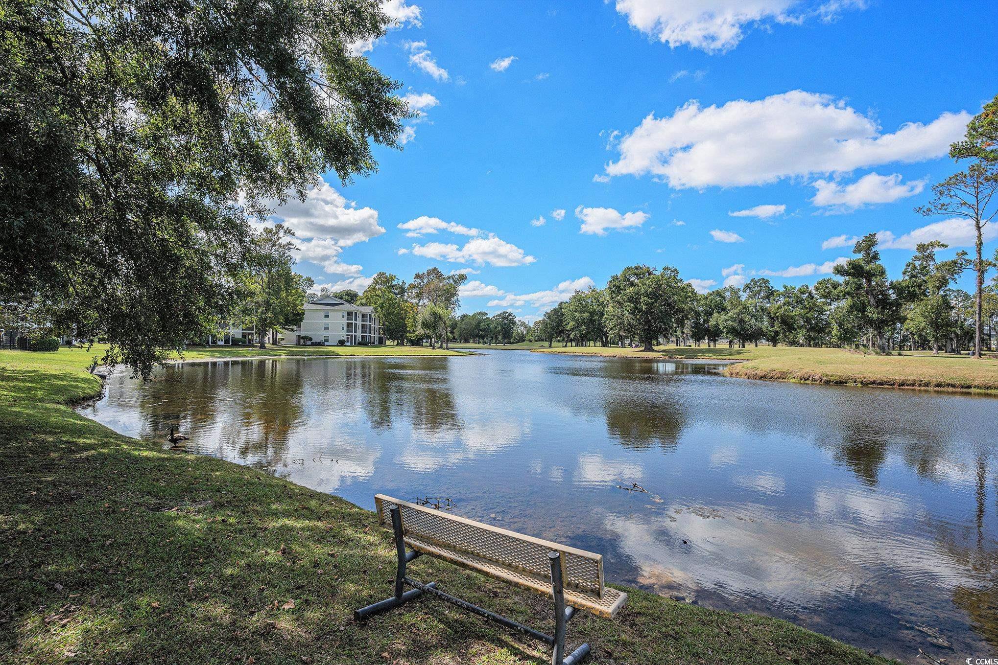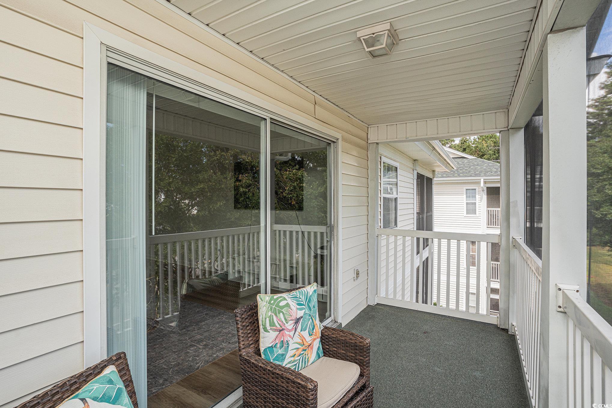 This top-floor remodeled, 1-bedroom, 1-bath condo offers a bright, open layout with vaulted ceilings and plenty of natural light. The living area features new LVP flooring and a large sliding door that opens to a screened-in balcony. The beautifully updated kitchen includes quartz countertops, new cabinets, and stainless steel appliances. The bedroom offers cozy carpet, while the bathroom features tile flooring, a tub/shower combo, and a laundry closet with a stackable washer and dryer. Ideal as a second home, investment property, or low-maintenance primary residence. Located in the River Oaks community, you'll enjoy access to three outdoor pools, an indoor pool, tennis/pickleball courts, community grills, and a putting green. Just minutes from shopping, dining, the Intracoastal Waterway, Broadway at the Beach, and only 10 minutes to the ocean.