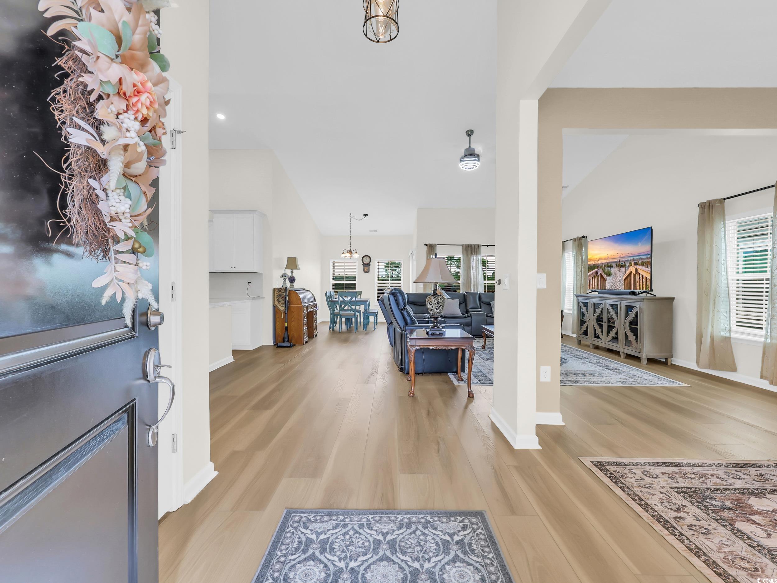 Immaculate pond view home with 3-car garage and thoughtful upgrades. Enjoy stunning lake views from this newly built 3 bedroom, 2 bath home featuring a spacious 3 car garage and numerous upgrades. Step inside to find LVP flooring in the main living areas and carried through the primary suite, offering both durability and style. The open concept floor plan is perfect for entertaining, with large windows framing the serene water views. The modern kitchen features quartz countertops and stainless appliances. Practical upgrades make this home better than new and truly move in ready with epoxy coated garage floors, added cabinetry in the laundry room, drop-down attic stairs, a full sprinkler system for easy lawn maintenance and ceiling fans throughout. Relax or host guests on the extended back patio, ideal for enjoying peaceful mornings or evenings by the lake. This home combines luxury, practicality and comfort offering the perfect balance for everyday living.