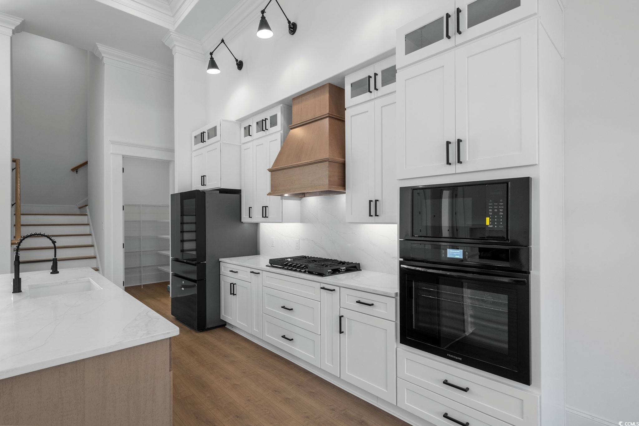 Incredible Opportunity in Crow Creek! Welcome to this stunning 4-bedroom, 3.5-bath home with a 3-car garage and private pool, located in the prestigious gated golf course community of Crow Creek in Calabash, NC. Perfectly positioned on the golf course with a serene pond view, this home offers exceptional curb appeal with its brick faade, black windows, board and batten Hardie siding, and cedar-wrapped beams. Step inside the grand entrance with soaring 14-foot ceilings and be captivated by the homes custom elegance. The open-concept layout seamlessly connects the formal dining area, spacious living room, and chefs kitchenperfect for entertaining or everyday living. Youll love the coffered ceilings, custom trim work, and gas fireplace with built-ins that elevate the main living space. The gourmet kitchen features sleek black appliances, a 36-inch cooktop with a custom hood, built-in microwave and oven combo, and a cozy dinette area for casual meals. A large pantry, dedicated laundry room, and guest half bath round out the main living areas. The luxurious owners suite is a private retreat featuring a tray ceiling with bay windows, a spa-style bath with a soaking tub, oversized black tile walk-in shower, dual vanities, private water closet, and a generous walk-in closet. This home follows a split-bedroom layout, with two spacious guest bedrooms on the opposite side that share a full bath. Upstairs, youll find an incredible in-law suite or bonus room complete with a full bath, custom tile shower, walk-in closet, and even a kitchenetteperfect for extended guests, a media room, or flex space. Step outside and unwind on the expansive covered patio overlooking your private 12x24 concrete pool, surrounded by beautiful paver deckingideal for summer entertaining. Crow Creek offers a resort-style lifestyle with access to top-tier amenities: Indoor & outdoor pools, Fitness center, Tennis & pickleball courts, Scenic walking trails, Full-service clubhouse, pro shop & restaurant, and Championship 18-hole golf course designed by Rick Robbins. Located just minutes from the NC beaches and the South Carolina border, this home truly delivers the best of coastal living. Dont miss your chance to own in one of Brunswick Countys most desirable communitiesschedule your private showing today!