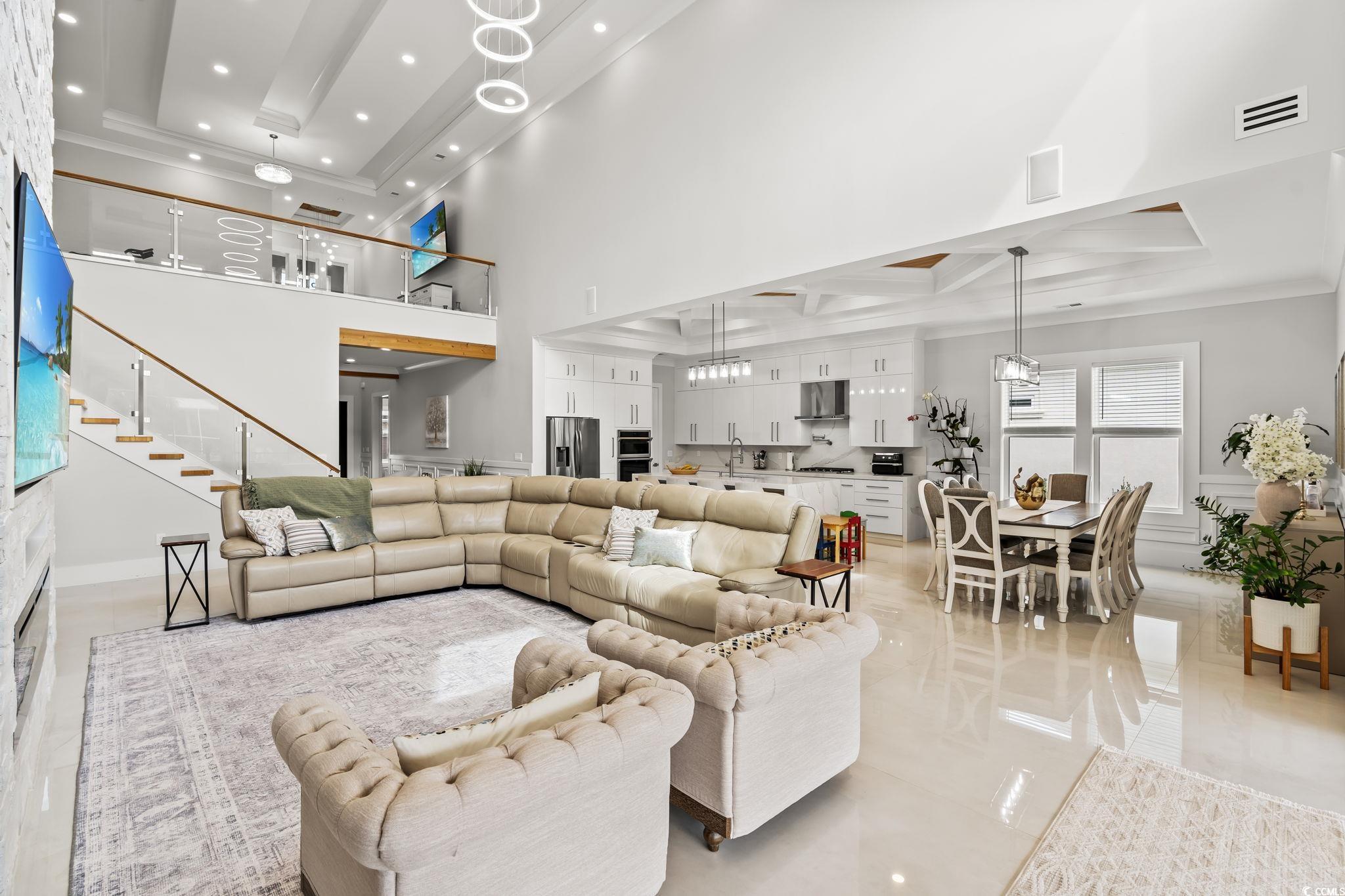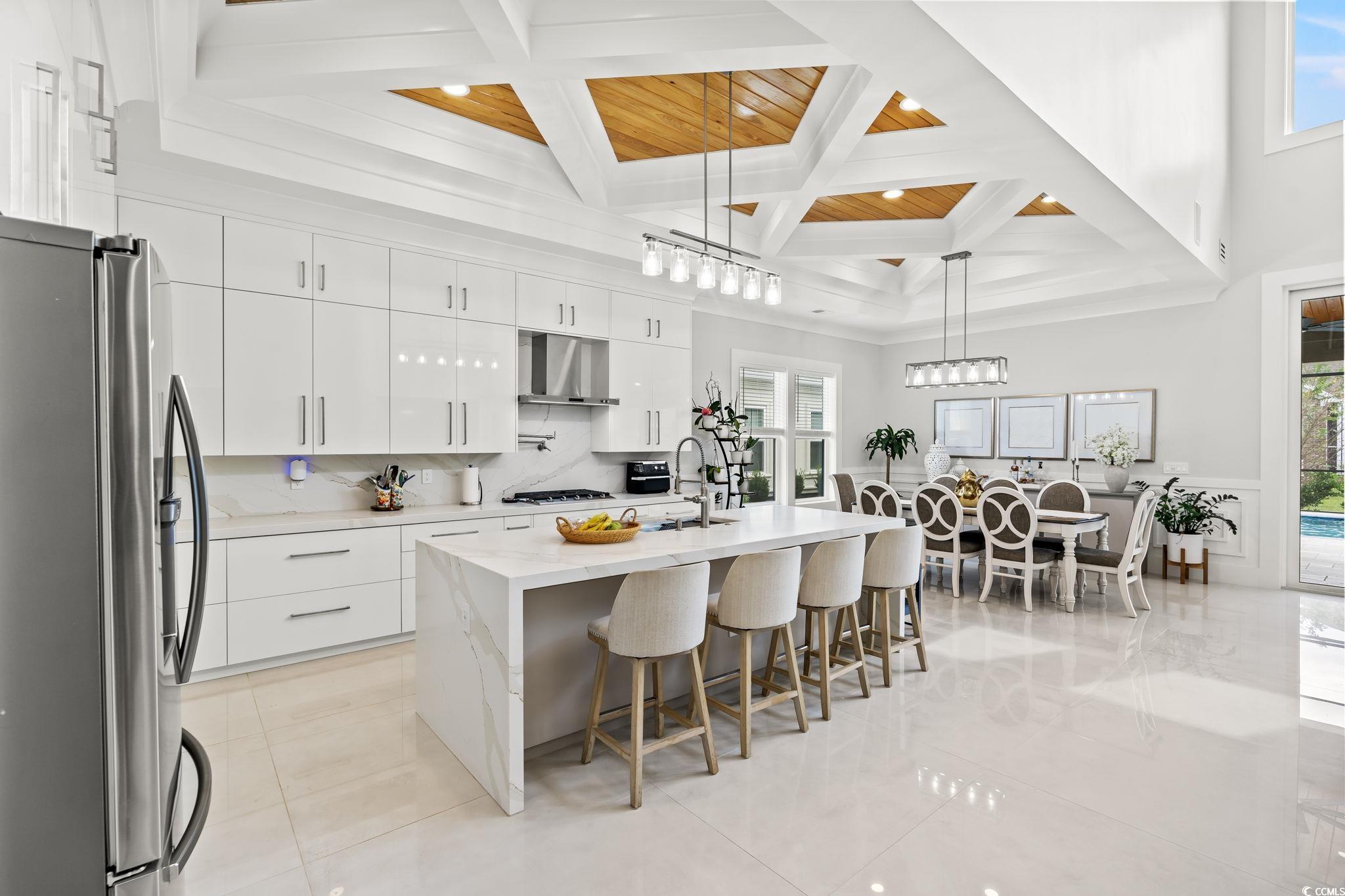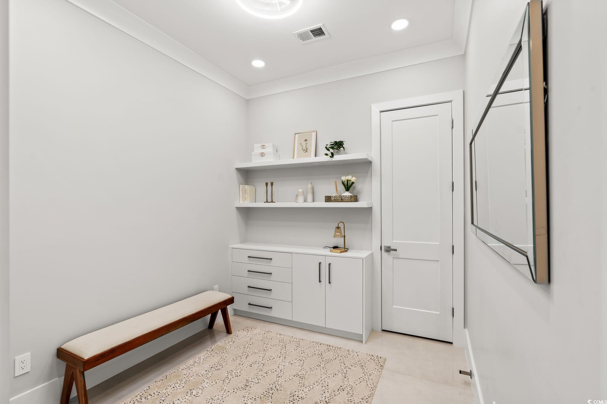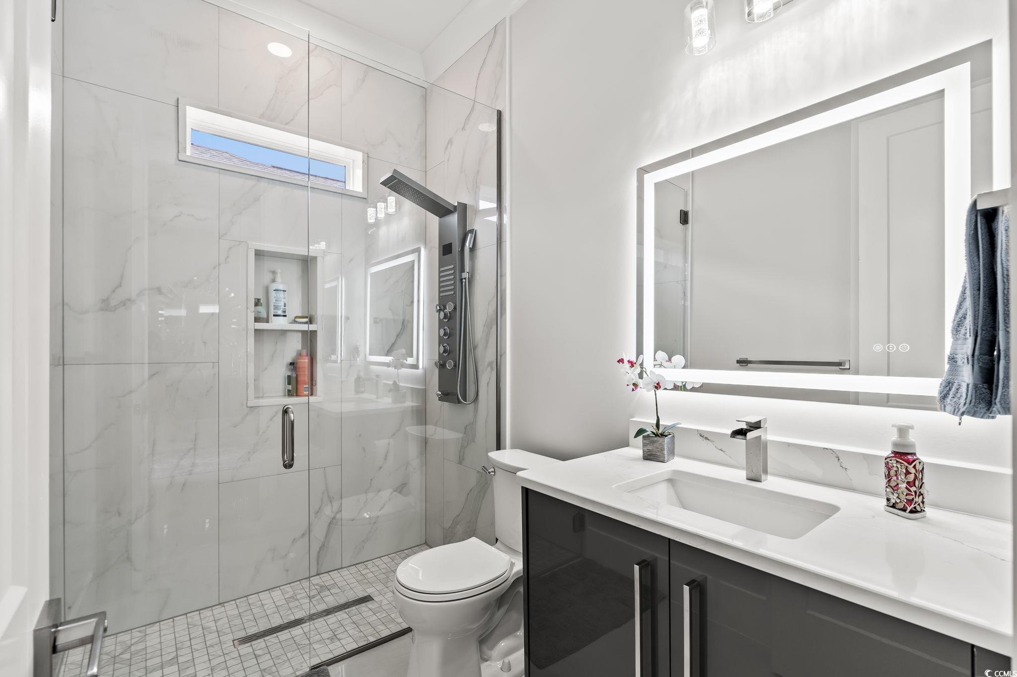 This exquisite custom-built residence is located in the gated community of Carolina Waterway Plantation along the Intracoastal Waterway. The home, featuring 4 bedrooms, 1 office, and 3.5 bathrooms, blends architectural elegance with resort-style living. Built with 2x6 exterior walls, spray foam insulation in the walls and the attic, and a sleek white stucco finish, it is accented by black modern windows, soffit lighting, a paver driveway and walkway, and stone hardscape with palm tree detailing for timeless curb appeal. The outdoor oasis features a metal screen enclosure over the pool. The pool size is 15 x 27 feet, along with an 8 x 8 feet jacuzzi spa, a waterfall wall, travertine tiles pool deck, and a full outdoor kitchen complete with a Brazilian grill, stove, refrigerator, beer keg, and granite countertopsperfect for entertaining family and friends. A half bath, storage room, and wood-paneled porch ceiling add to the luxury experience. Inside, sophistication flows through every detail4 x 4 tile floors throughout the home, high ceilings, crown molding, and wood ceiling accents. The living rooms 22-ft stone-accented wall, gas fireplace, and glass handrail staircase create a grand architectural statement. The chefs kitchen offers quartz countertops, a waterfall island, a gas cooktop, a built-in oven and microwave, and plenty of European glossy cabinetry, custom built-in shelving in the pantry room. All four bedrooms are spacious with tray ceilings and large windows; the primary suite impresses with his-and-hers custom closets and a spa-like bath featuring dual vanities, rainfall showers, and a freestanding soaking tub. Additional highlights include an epoxy-coated garage, smart camera/speaker systems, and professional tropical landscaping. Every element of this home is designed for beauty, comfort, and modern coastal living. The community features a tennis court, an outdoor pool with a clubhouse, Boat and RV parking/storage, and waterway access ramp. Located near stores, restaurants, and a hospital with a short drive to the Atlantic Ocean beaches, this property is your Perfect Dream Home. Don't miss out and schedule your showing today!