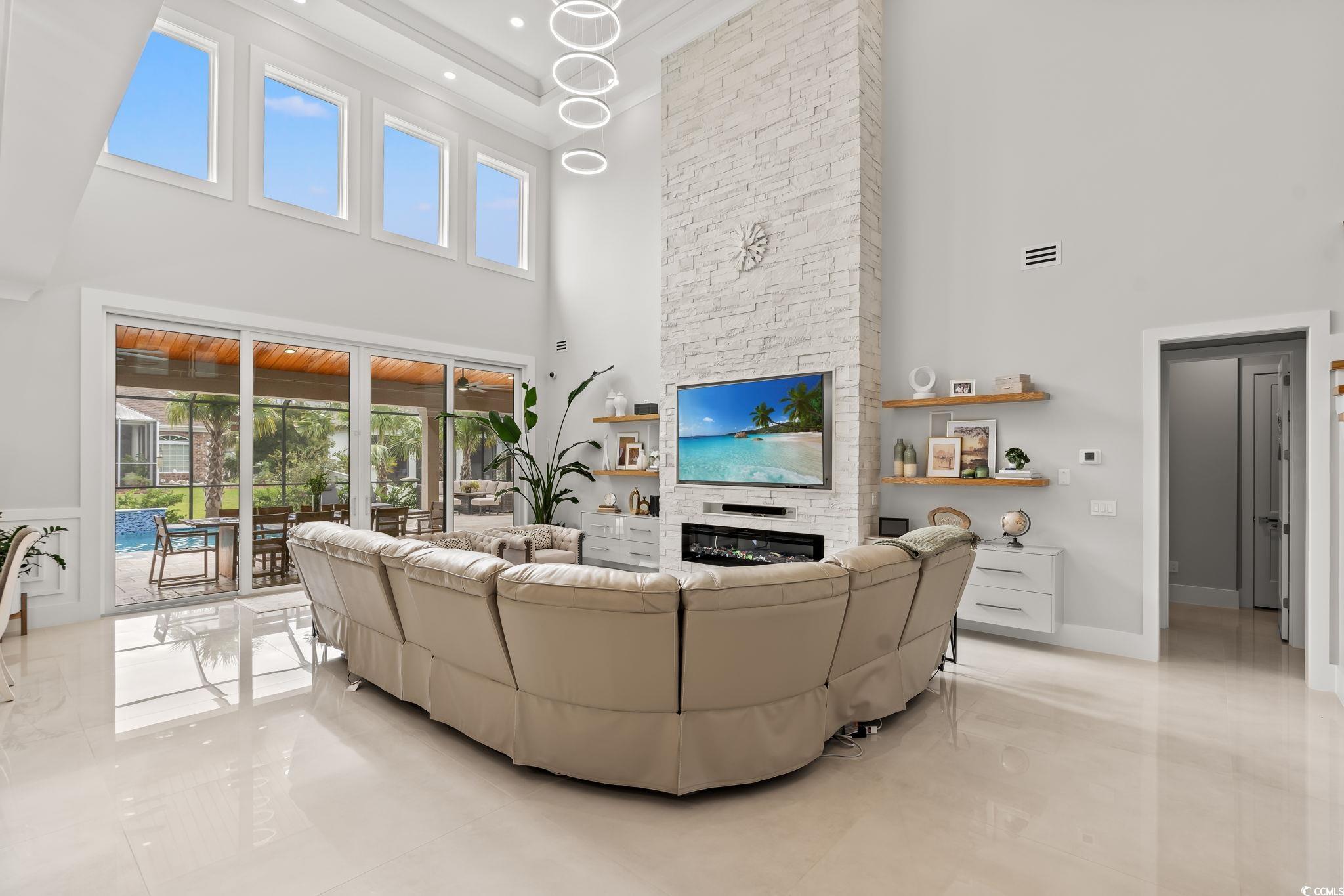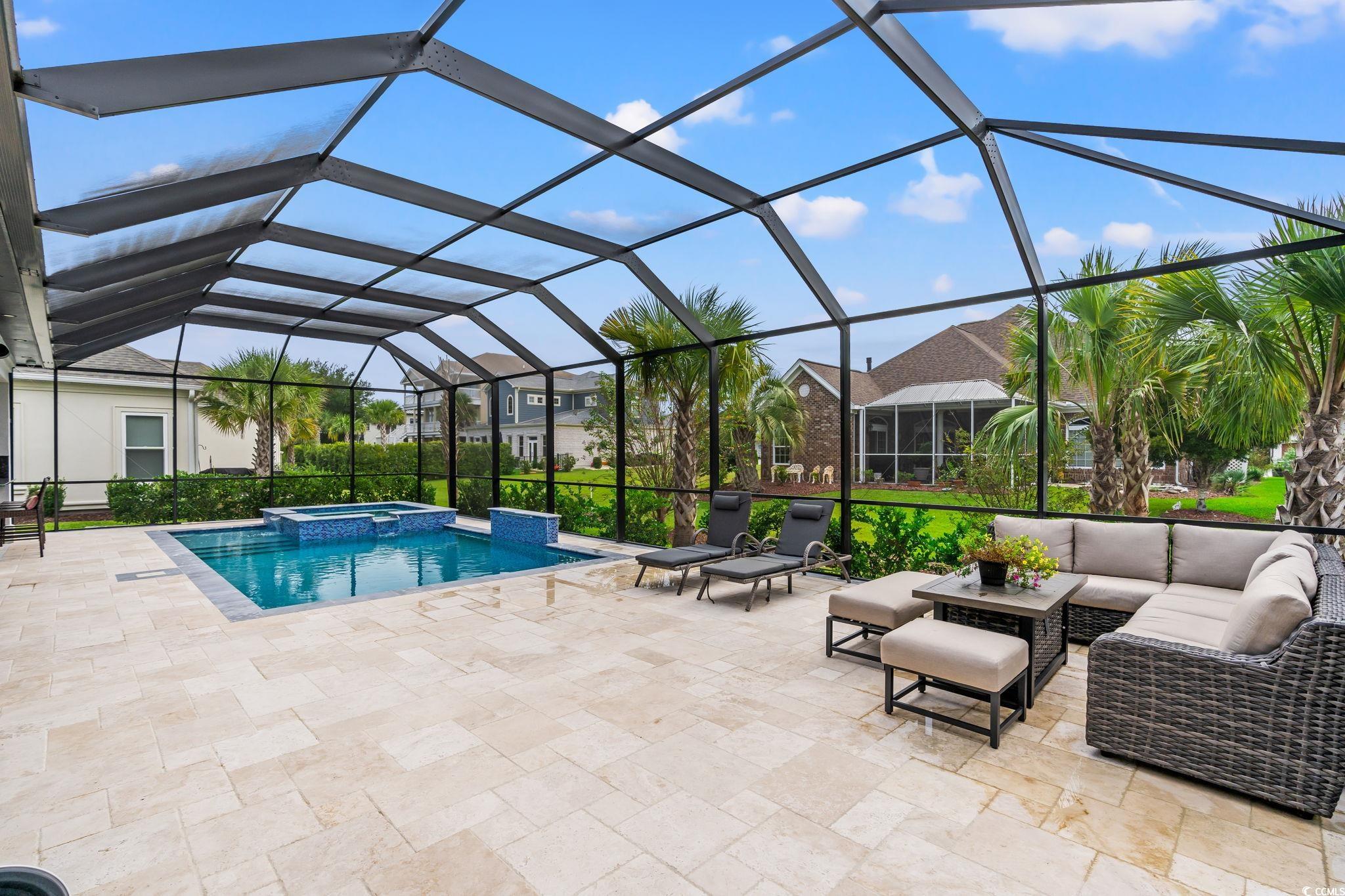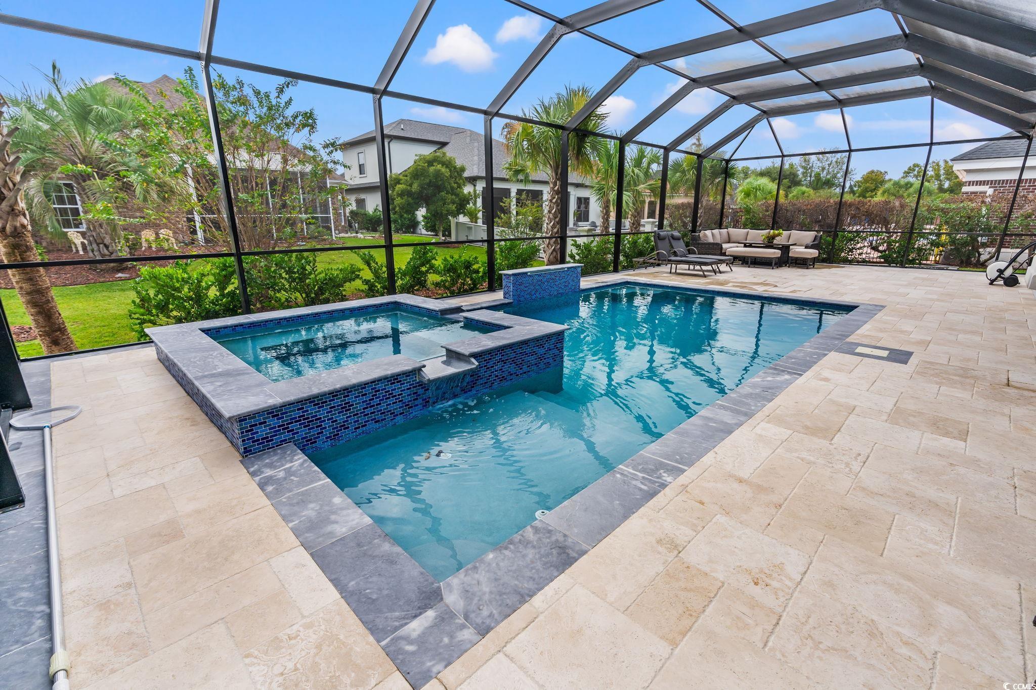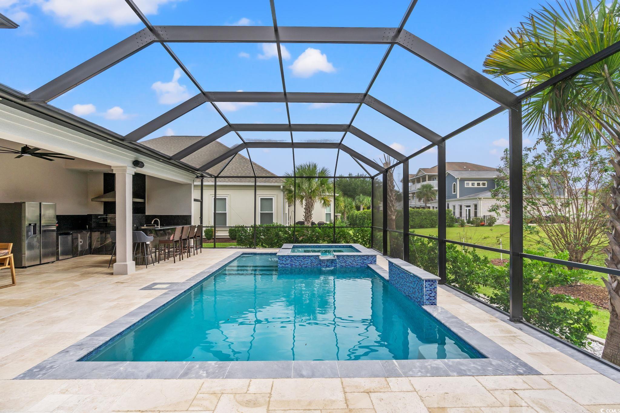 This exquisite custom-built residence is located in the gated community of Carolina Waterway Plantation along the Intracoastal Waterway. The luxury home, featuring 4 bedrooms, 1 office, and 3.5 bathrooms, blends architectural elegance with resort-style living. Built with 2x6 exterior walls, spray foam insulation in the walls and the attic, and a sleek white stucco finish, it is accented by black modern windows, soffit lighting, a paver driveway and walkway, and stone hardscape with palm tree detailing for timeless curb appeal. The outdoor oasis features a pool enclosure (cage) 54 x 23 feet over the pool deck. The salt and heated pool size is 15 x 27 feet, along with an 8 x 8 feet jacuzzi spa, a waterfall wall, travertine tiles pool deck, and a full outdoor kitchen complete with a Brazilian grill, stove, refrigerator, draft box/ beer keg, sink, and granite countertopsperfect for entertaining family and friends. A half bath, storage room, outdoor shower, and wood-paneled porch ceiling add to the luxury experience. Inside, sophistication flows through every detail4 x 4 tile floors throughout the home, high ceilings, crown molding, and wood ceiling accents. The living rooms 22-ft stone-accented wall, electric fireplace, four panels of a 10-foot sliding glass door, glass handrail, and wooden staircase create a grand architectural statement. The chefs kitchen offers quartz countertops, a waterfall island, a gas cooktop, a built-in oven and microwave, and plenty of European glossy cabinetry, custom built-in shelving in the pantry room. All four bedrooms are spacious with tray ceilings and large windows; the primary suite impresses with his-and-hers custom closets and a spa-like bath featuring dual vanities, rainfall showers, and a freestanding soaking tub. Additional highlights include an epoxy-coated garage, smart camera/speaker systems, and professional tropical landscaping. Every element of this home is designed for beauty, comfort, and modern coastal living. The community features a pickleball and tennis court, a community outdoor pool with a clubhouse, Boat and RV parking/storage, and a waterway boat access ramp. Located near stores, restaurants, and a hospital with a short drive to the Atlantic Ocean beaches, this property is your Perfect Dream Home. Don't miss out and schedule your showing today!
