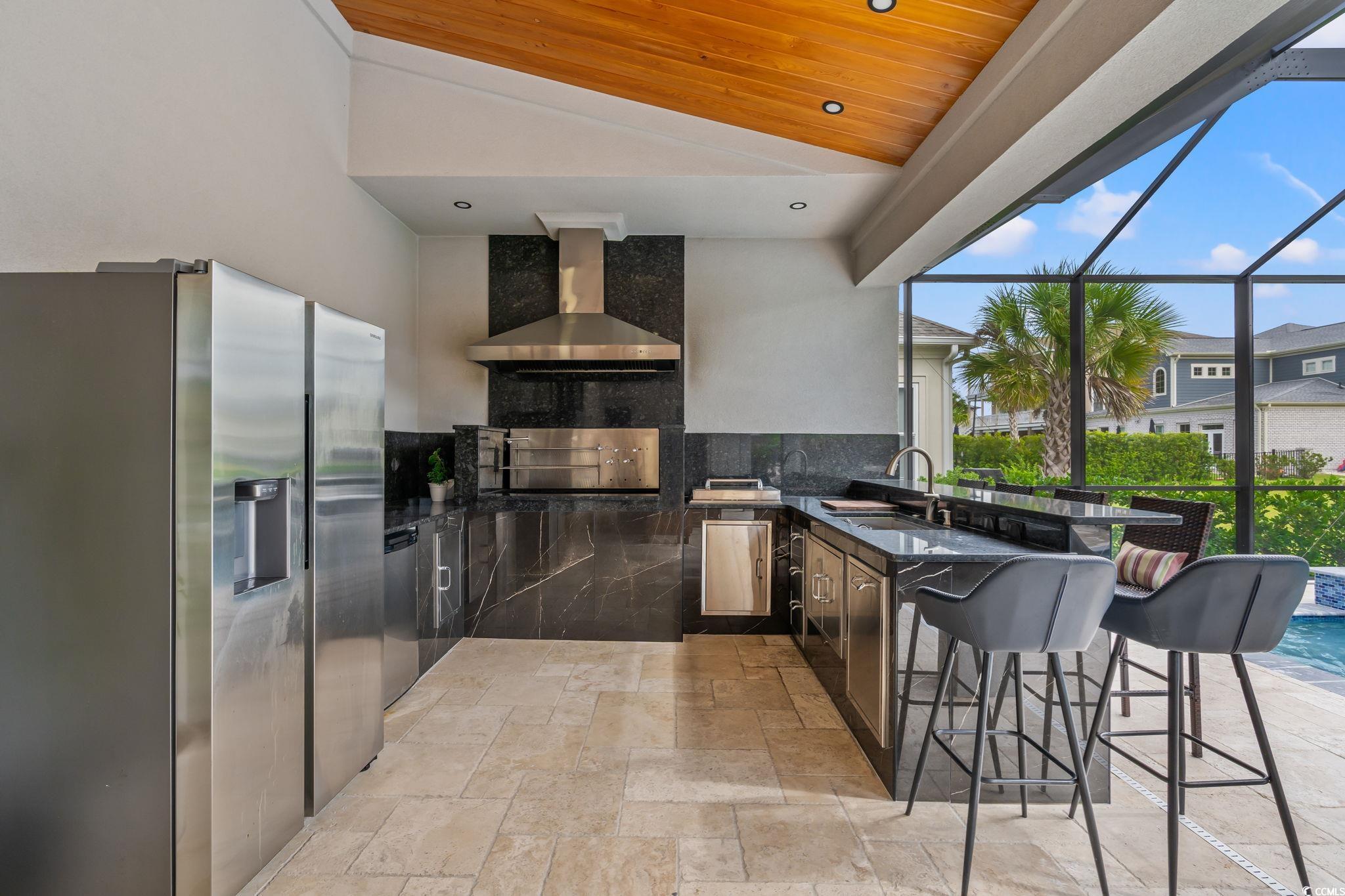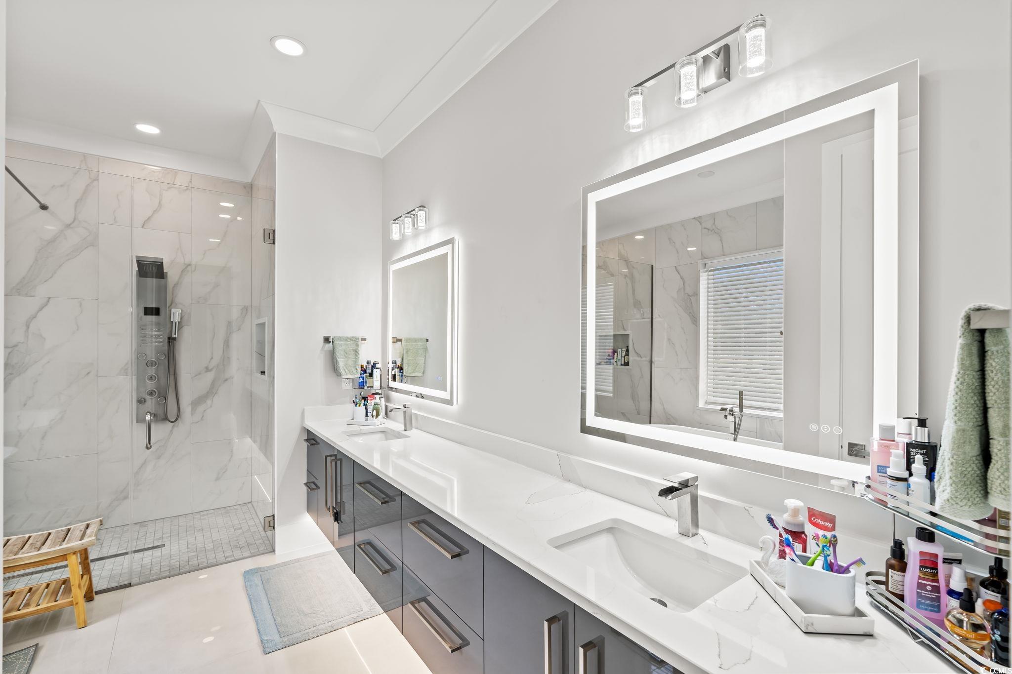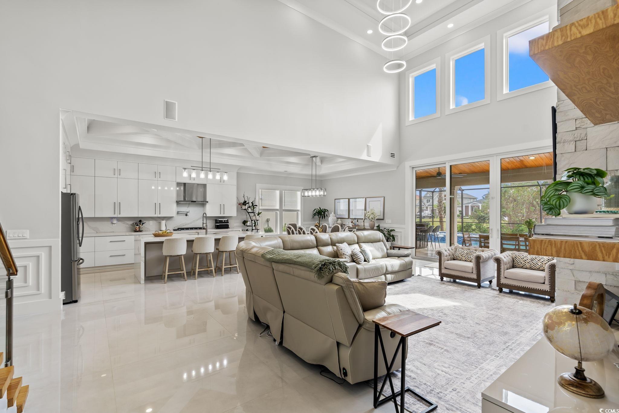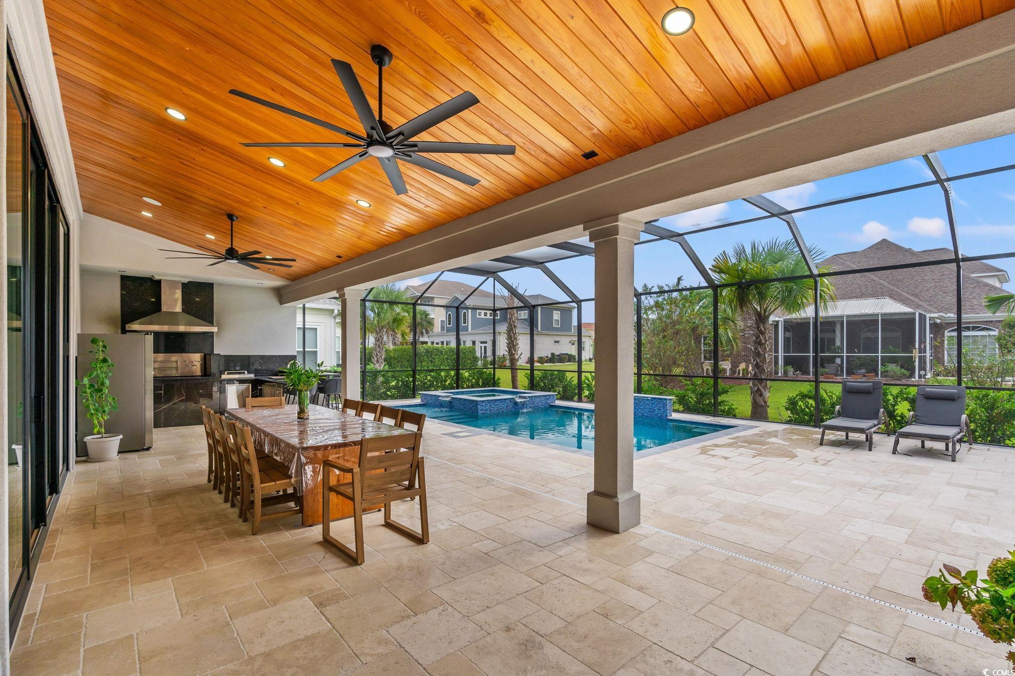 This exquisite custom-built residence is located in the gated community of Carolina Waterway Plantation along the Intracoastal Waterway. The luxury home, featuring 4 bedrooms, 1 office, and 3.5 bathrooms, blends architectural elegance with resort-style living. Built with 2x6 exterior walls, spray foam insulation in the walls and the attic, and a sleek white stucco finish, it is accented by black modern windows, soffit lighting, a paver driveway and walkway, and stone hardscape with palm tree detailing for timeless curb appeal. The outdoor oasis features a pool enclosure (cage) 54 x 23 feet over the pool deck. The salt and heated pool size is 15 x 27 feet, along with an 8 x 8 feet jacuzzi spa, a waterfall wall, travertine tiles pool deck, and a full outdoor kitchen complete with a Brazilian grill, stove, refrigerator, draft box/ beer keg, sink, and granite countertopsperfect for entertaining family and friends. A half bath, storage room, outdoor shower, and wood-paneled porch ceiling add to the luxury experience. Inside, sophistication flows through every detail4 x 4 tile floors throughout the home, high ceilings, crown molding, and wood ceiling accents. The living rooms 22-ft stone-accented wall, electric fireplace, four panels of a 10-foot sliding glass door, glass handrail, and wooden staircase create a grand architectural statement. The chefs kitchen offers quartz countertops, a waterfall island, a gas cooktop, a built-in oven and microwave, and plenty of European glossy cabinetry, custom built-in shelving in the pantry room. All four bedrooms are spacious with tray ceilings and large windows; the primary suite impresses with his-and-hers custom closets and a spa-like bath featuring dual vanities, rainfall showers, and a freestanding soaking tub. Additional highlights include an epoxy-coated garage, smart camera/speaker systems, and professional tropical landscaping. Every element of this home is designed for beauty, comfort, and modern coastal living. The community features a pickleball and tennis court, a community outdoor pool with a clubhouse, Boat and RV parking/storage, and a waterway boat access ramp. Located near stores, restaurants, and a hospital with a short drive to the Atlantic Ocean beaches, this property is your Perfect Dream Home. Don't miss out and schedule your showing today!
