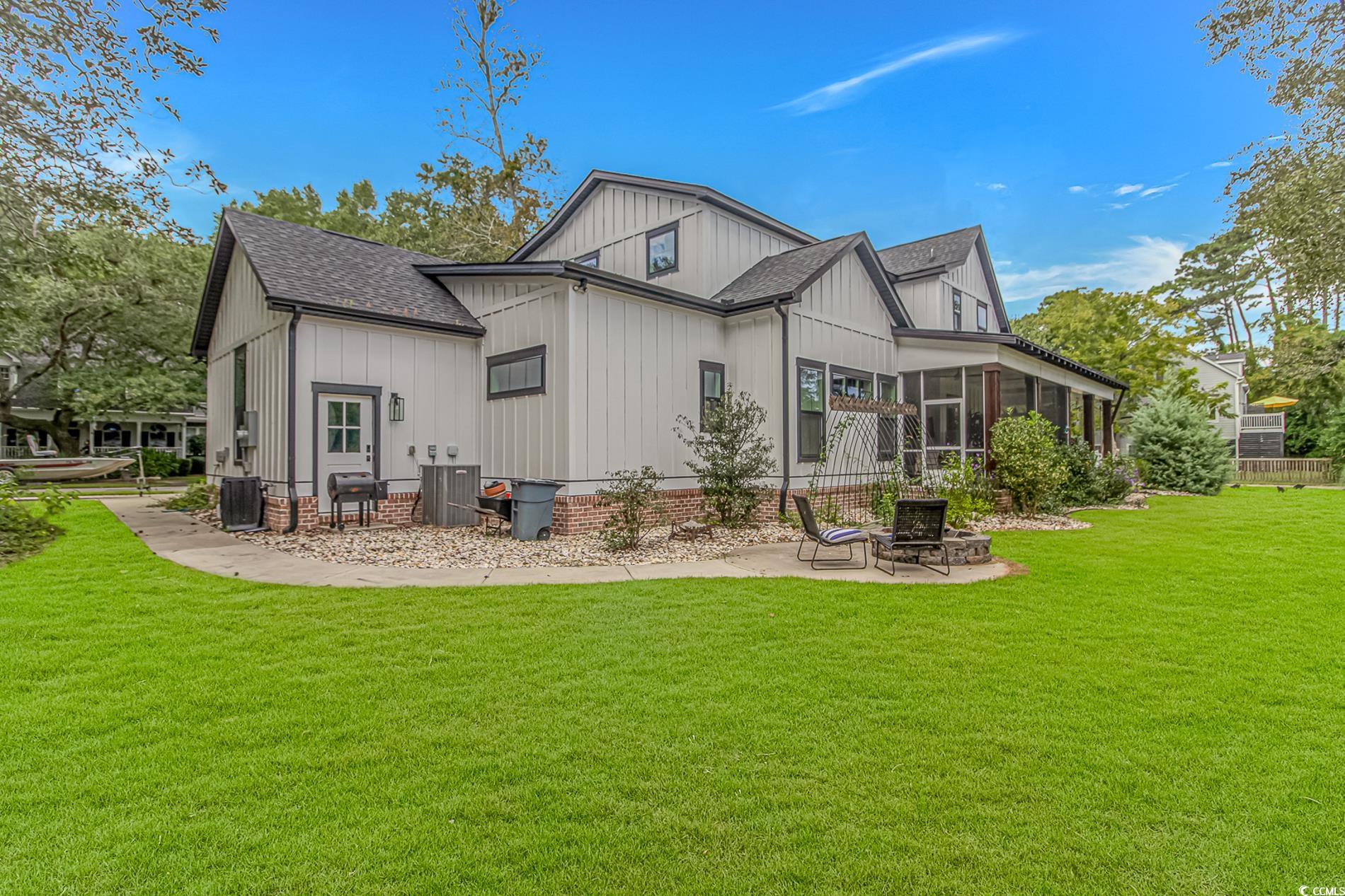 Nestled east of Highway 17, this Southern custom coastal farmhouse exudes charm and elegance. The home features four spacious bedrooms and 3 1/2 baths, perfect for family living and entertaining guests. A circular driveway welcomes you to this beautiful property, setting the stage for the warmth and sophistication found inside. Enter through 8-foot solid wood doors into the open floorplan, designed for modern living, with a seamless flow between the living spaces. The heart of the home is the kitchen, boasting double ovens and a gas stove, ideal for culinary enthusiasts. Adjacent to the kitchen is a large laundry area, adding convenience to daily chores. Steps away, you will find the primary suite featuring a truly luxurious ensuite. Double vanities, water closet, and a tiled shower featuring a rain head and two additional sprayers for the best start to your day. Solid surface countertops and tiled showers throughout the home reflect quality craftsmanship and attention to detail. The living room is enhanced by a coffered ceiling and a cozy fireplace, creating a welcoming atmosphere. Step outside to the large screened-in porch, complete with brick flooring, perfect for enjoying the coastal breeze and relaxing outdoors. This home combines Southern charm with modern amenities, making it a true coastal farmhouse dream.