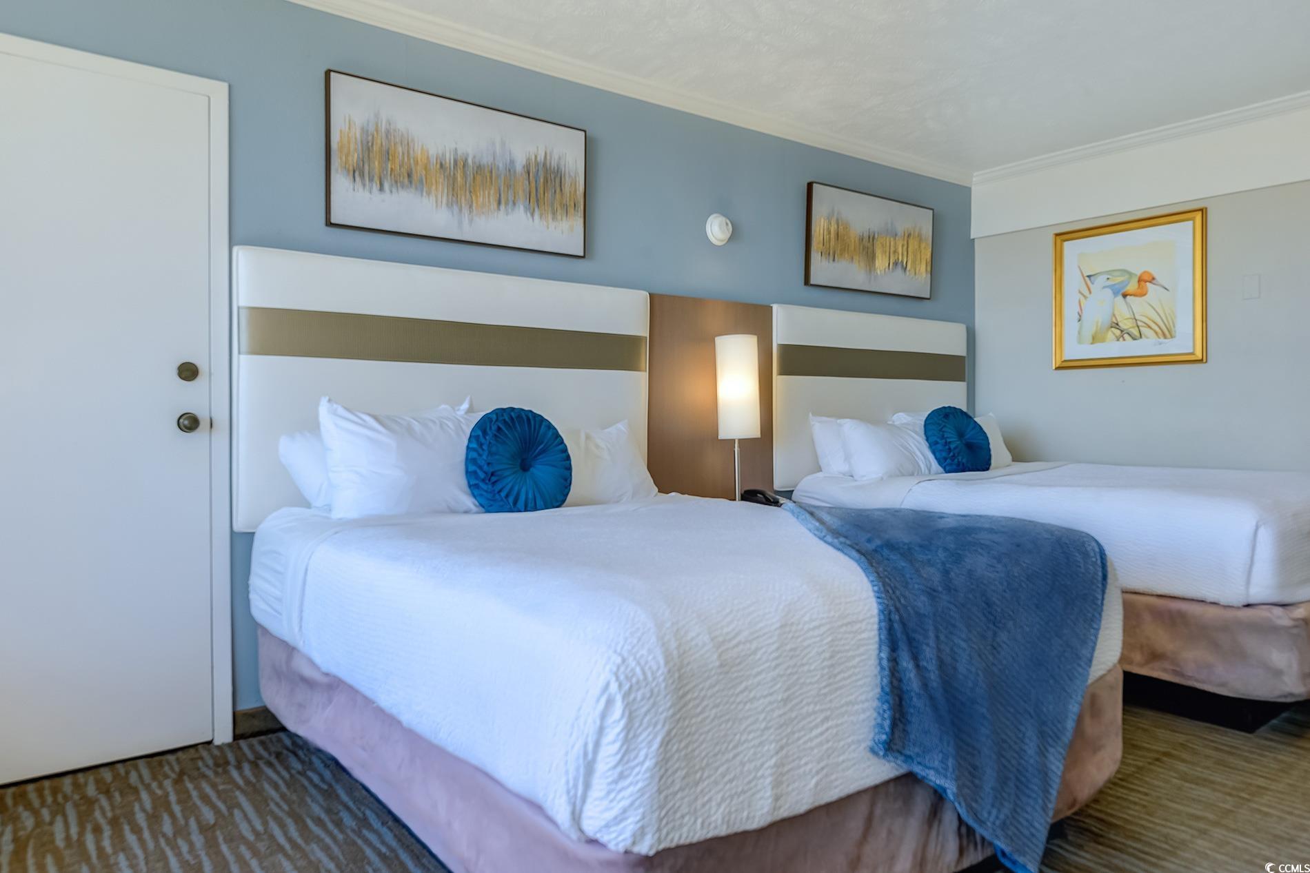 DIRECT OCEANFRONT END-UNIT condo, FULLY FURNISHED, at Ocean Reef Resort in the North Tower. This property features an updated kitchenette, full bath, and a large open area with two queen-sized beds, TV, dresser, and a dining area that looks out onto the balcony. Step outside onto your private balcony to enjoy the views of the gorgeous Atlantic Ocean. This highly sought after, family resort has 10 water amenities including a water park, lazy river, indoor pool, outdoor pool deck, hot tubs and more. Multiple food and beverage options available, the pool bar, Banana Boat Lounge, Cafe du Port, breakfast buffet, and even a Starbucks next door! Enjoy the vast game room, workout in the fitness center, play some volleyball out back, or check out the on-site gift shop! The second floor end unit location allows for a private staircase out front for when you want to avoid the crowds, and a beautiful community lounge space above the signature grand spiral staircase. Book your private showing today!
