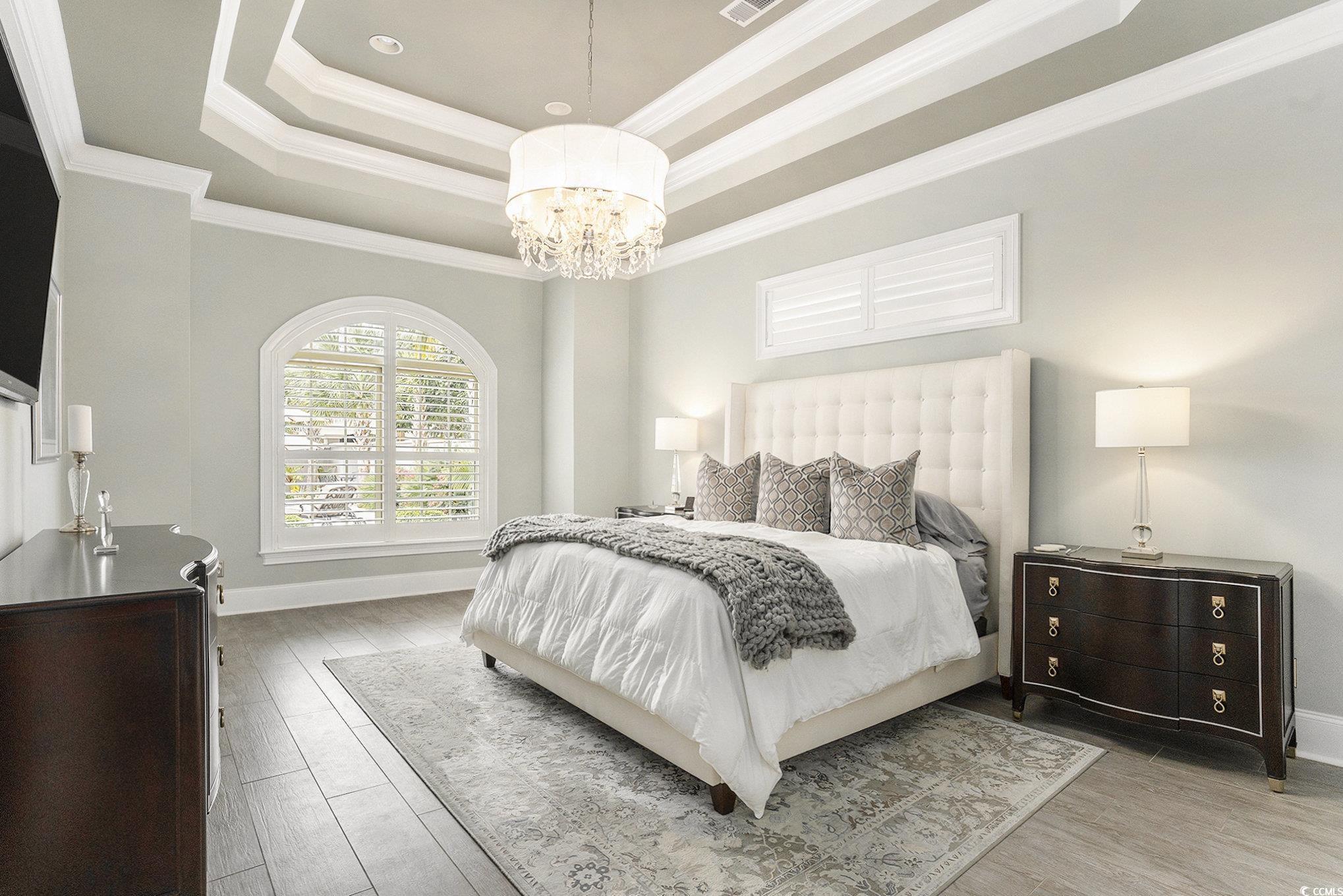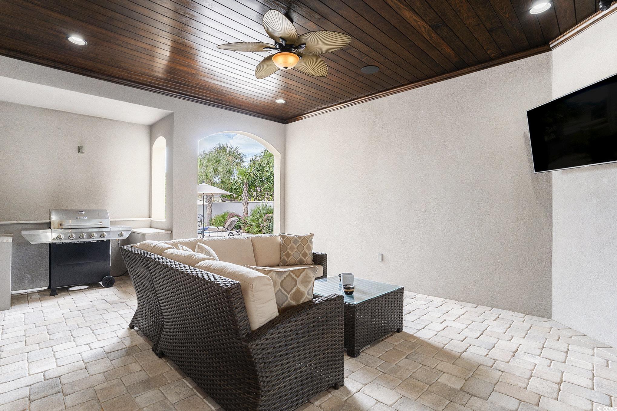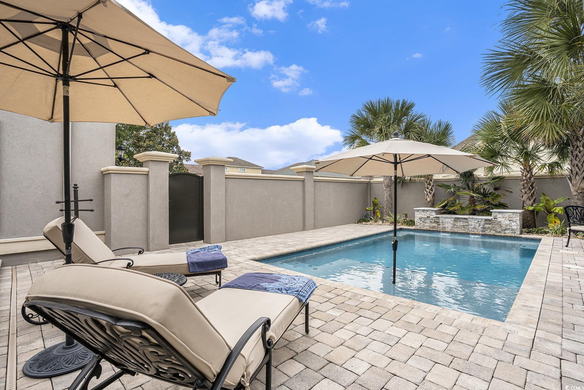 Welcome to The Bluffs on the Waterway, one of Myrtle Beachs most sought-after gated communities along the Intracoastal Waterway. This stunning 4-bedroom, 4-bathroom custom home perfectly blends timeless elegance with coastal sophisticationoffering comfort, privacy, and luxurious design at every turn. From the moment you arrive, the curved driveway and manicured landscaping framed by palm trees make a grand first impression. Step through the arched front porch into a bright, open floor plan featuring high ceilings, custom millwork, and abundant natural light. The open-concept living area is both elegant and inviting, showcasing coffered ceilings, a modern ceiling fan, and a gas fireplace framed by custom built-ins. Expansive sliding glass doors fill the space with sunlight and connect seamlessly to the outdoor living area, enhancing the homes indoor-outdoor flow. The gourmet kitchen is a true showstopper, featuring timeless white cabinetry, marble countertops, and a full-height marble backsplash behind a professional-grade gas range. Pendant lighting, under-cabinet illumination, and a large island with seating create a functional yet stylish centerpiece. Additional highlights include double ovens, a paneled refrigerator, built-in wine storage, and a beverage coolerideal for entertaining. All kitchen appliances are KitchenAid. The adjacent dining area features tray ceilings, a statement chandelier, and arched plantation-shuttered windows. The primary suite is a serene retreat featuring detailed tray ceilings, a designer chandelier, and soft natural light from arched windows. The spa-inspired ensuite bathroom boasts dual vanities, a soaking tub, and an oversized walk-in tile shower with decorative inlays. A spacious custom closet provides exceptional organization and storage. Three additional bedrooms and three full bathrooms ensure comfort and privacy for family and guests. One of the bedrooms has been converted into a cozy media roomperfect for movie nights or game days. The dedicated home office offers a quiet workspace with French doors, wainscoting, and elegant trim details. Upstairs, a versatile flex room currently serves as a home gym but can easily adapt as a studio, playroom, or guest suite. A stylish laundry room adds convenience with custom cabinetry, marble-style counters, and a utility sink. Step outside to your own private coastal oasis. The backyard is designed for relaxation and entertaining, featuring a sparkling pool surrounded by tropical landscaping and privacy walls. Water features add a tranquil, resort-like ambiance, while the expansive paver patio offers plenty of space for lounging and outdoor dining. The covered patio provides a shaded retreat with a wood-paneled ceiling, ceiling fan, outdoor television, and space for a grillideal for al fresco living. Living in The Bluffs on the Waterway means access to unmatched community amenities, including a private boat launch, day docks, clubhouse, outdoor pool, playground, tennis courts, and scenic walking trailsall just minutes from Myrtle Beachs finest dining, golf, and coastline.
