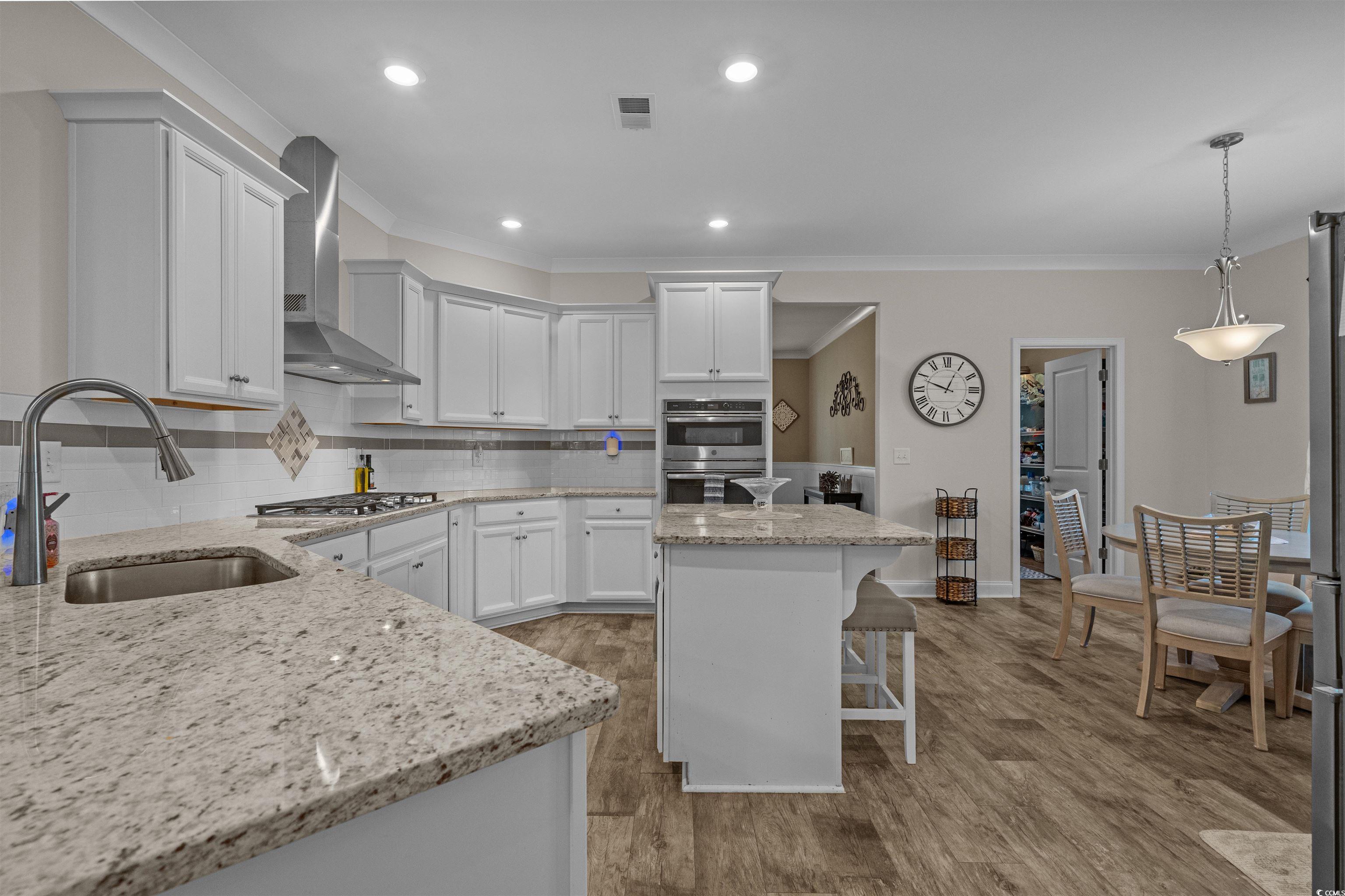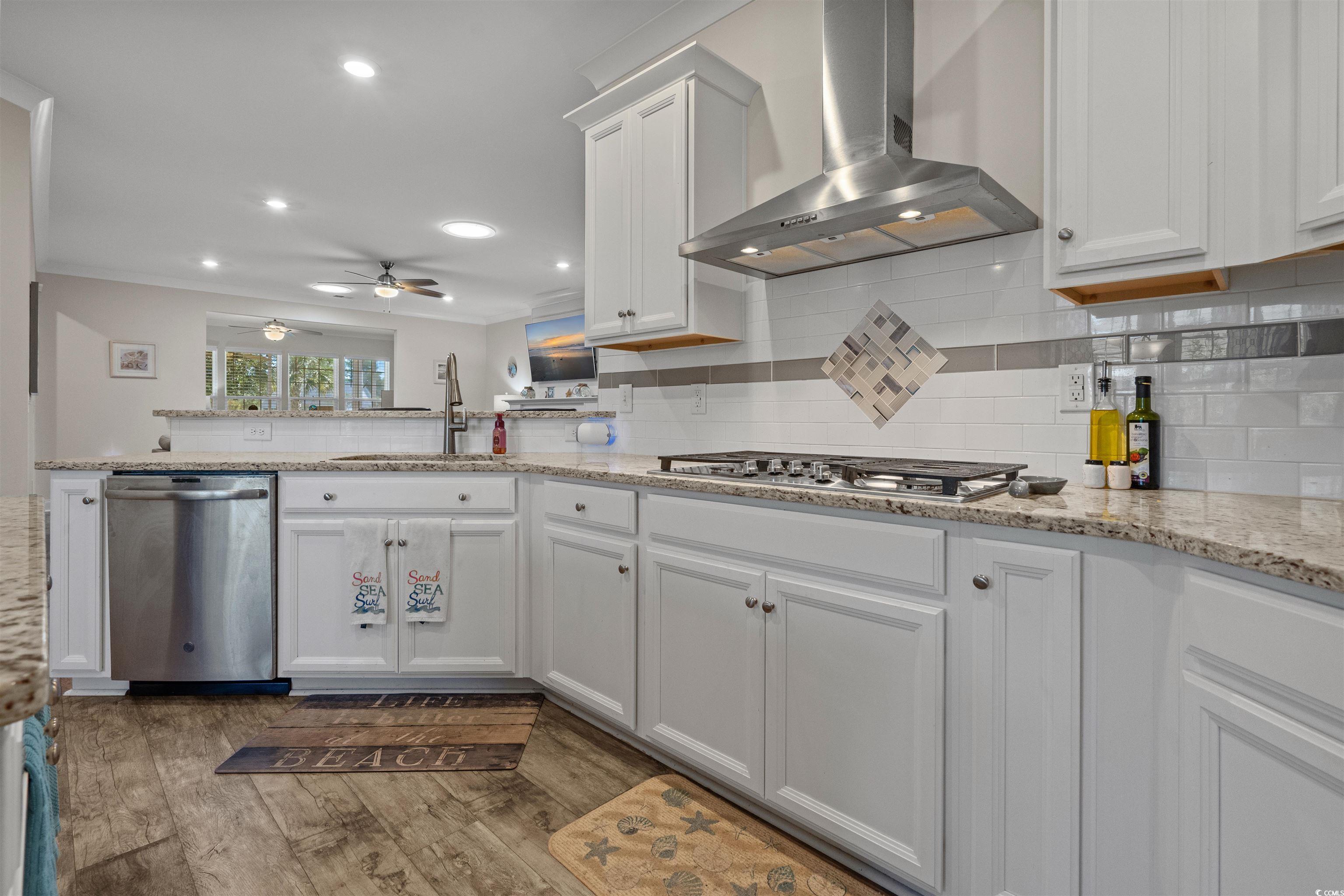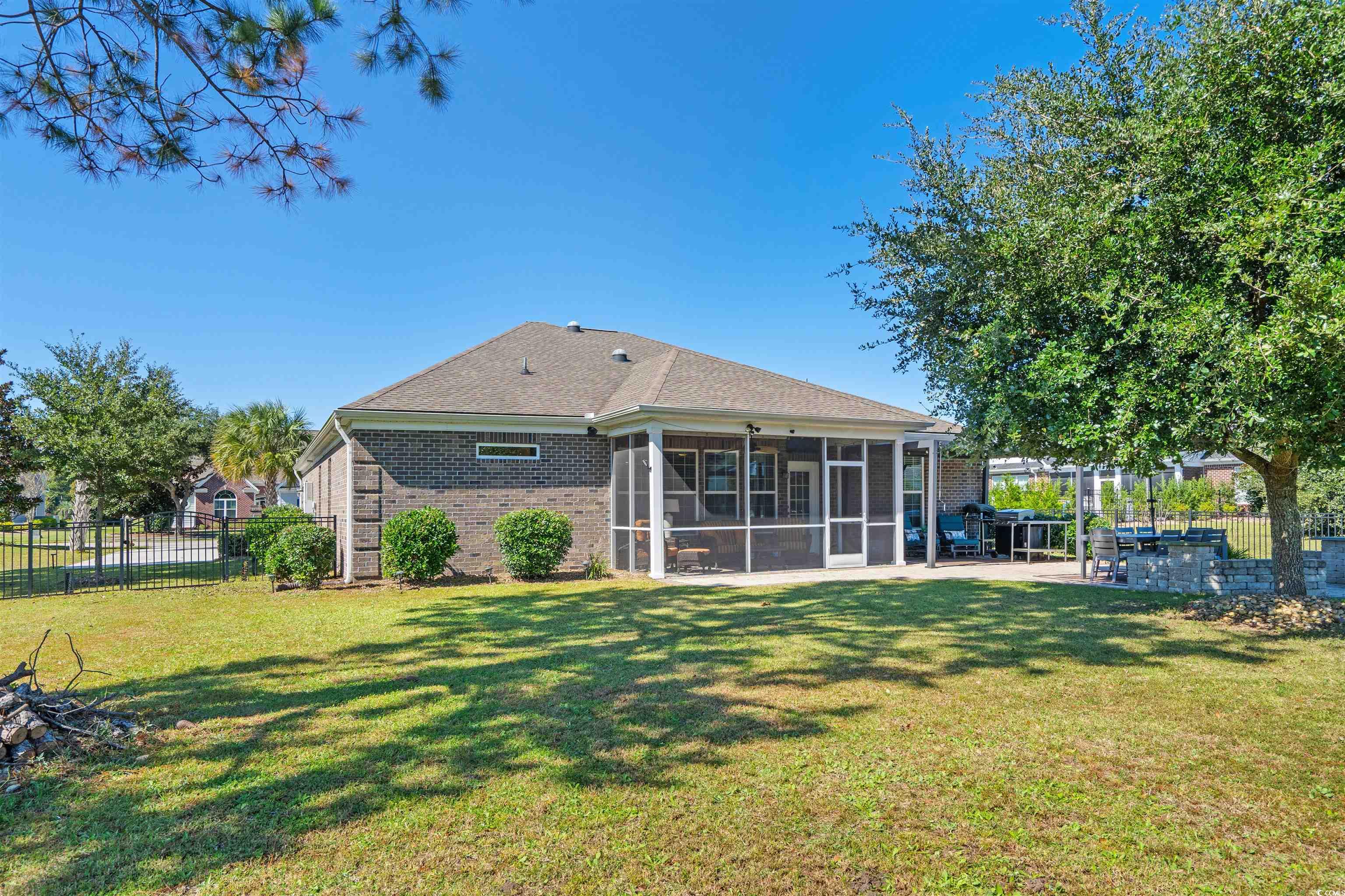 Welcome and discover an opulent life in Wild Wing Plantation. Step inside the ALL brick lake lot which is comfortably designed with an open floor plan featuring 3 bedrooms, 2.5 bathrooms. The home has an airy, relaxing ambiance and a light & bright chef's kitchen featuring white cabinets, stainless steel appliances including gas cooktop/hood, wall oven/microwave, subway tiled backsplash, ample granite counter space (includes 2 bar stools at counter facing living room), kitchen island (includes 2 stools), kitchen nook, designated desk/coffee bar, and a sizeable handy walk-in pantry closet. There is a formal dining room. The living room offers plenty of natural light and a gas fireplace. Convenient location of powder room and walk-in laundry room (with conveying new GE Washer & Dryer). Master Bedroom is a relaxing retreat including a sitting area, spacious closets, hard surfaces in shower, floors, and countertops. Two other bedrooms are proportionate sizes, and the hall bath includes a hefty sized vanity, hard surfaces and additional storage closet. As you walk out through the sunroom into the attached Carolina Room you will love the view looking out at the large lake. The backyard patio and walkways are stone pavers with an aluminum pergola for your entertaining and enjoyment with plenty of privacy. The stone pavers lead to a built-in stone firepit area (4 chairs convey) that overlooks the lake surrounded by nature and its beauty in your backyard. The fenced in backyard is the perfect place to sit back, relax, and soak in all months of the year! Wild Wing Plantation is a golf course community with live oak trees lined down sidewalks for your walking leisure. Wild Wing amenities are incredible with 3 pools, club house, restaurant, golf, pro shop, tennis, gym, playground, boating access. The location is close to the beach, shopping, golf courses, hospitals, Carolina Forest Schools, Coastal Carolina University, airport and highways.