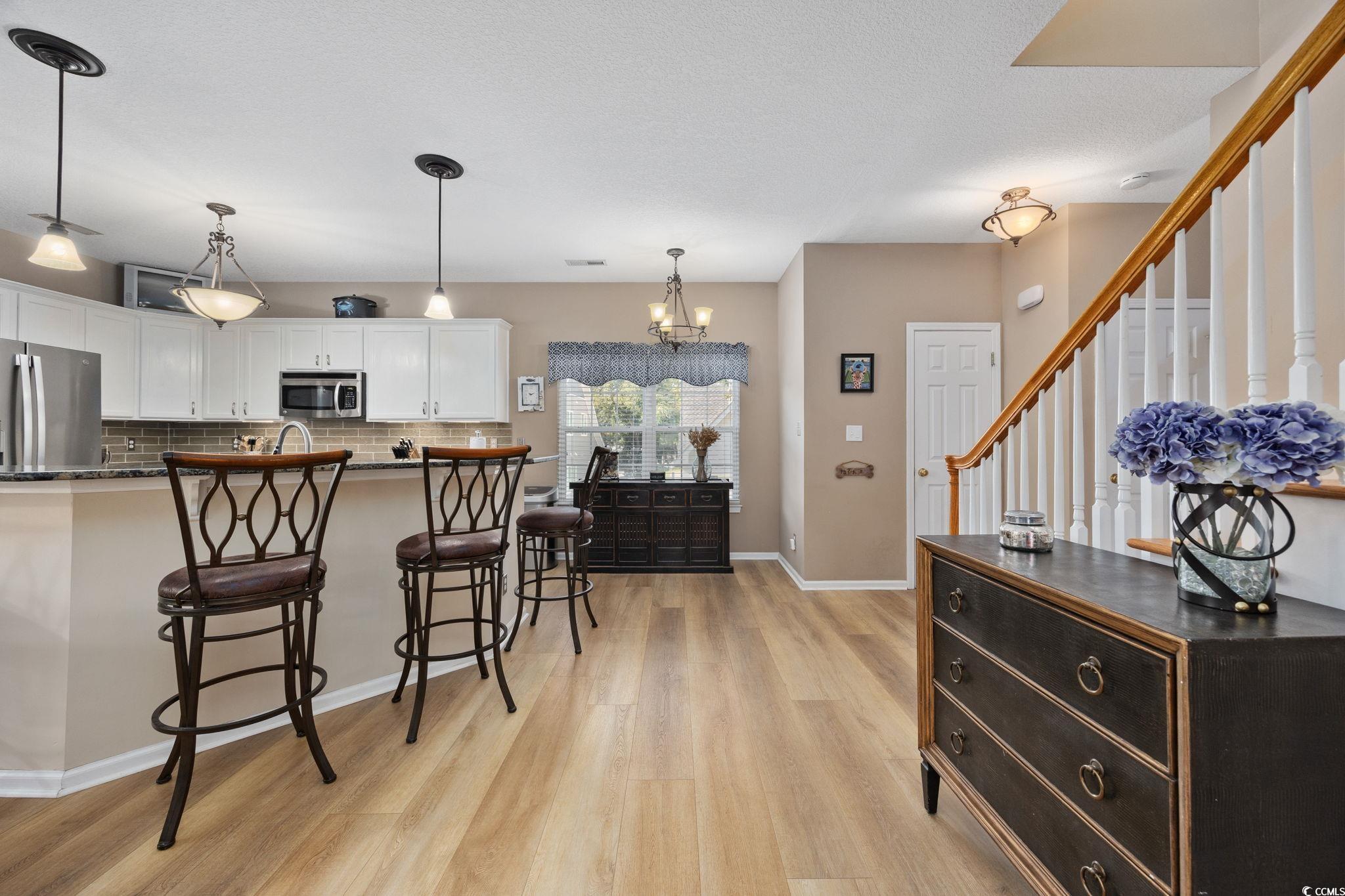 Desirable, East of 17, Surfside Beach community with pool, Just 5 Blocks from the Ocean! Welcome home to this beautifully appointed 4 bedroom, 3.5 bath coastal retreat, perfectly located in one of Surfside Beachs most desirable neighborhoods, only five blocks from the Atlantic Ocean! The open-concept main level features a spacious living area, a welcoming dining space, and direct access to the charming front porch. The upgraded kitchen impresses with granite countertops, a subway tile backsplash, stainless steel appliances, and a large dining bar... perfect for entertaining. A convenient half bath completes the main floor. Upstairs, youll find three bedrooms and two full baths, including a generous primary bedroom with an ensuite bath. The ground level offers a versatile in-law suite with a full bath, plenty of space for bedroom and sitting area with private access to the back patio. This by design is ideal for guests or extended family. The entry foyer connects to both the interior, entrance stairway and to the oversized two-car garage, which includes a small workshop area. The garage refrigerator and all main kitchen appliances, plus washer/ dryer convey with the home. New roof 2023. Enjoy outdoor living with the community pool located just two doors down, or take a short walk or golf cart ride to the beach to experience the best of coastal living! This home checks all the boxes... perfect as a primary residence or a second home by the sea. Home is occupied... please do not disturb. Show by appointment only. Some furniture may be negotiable.