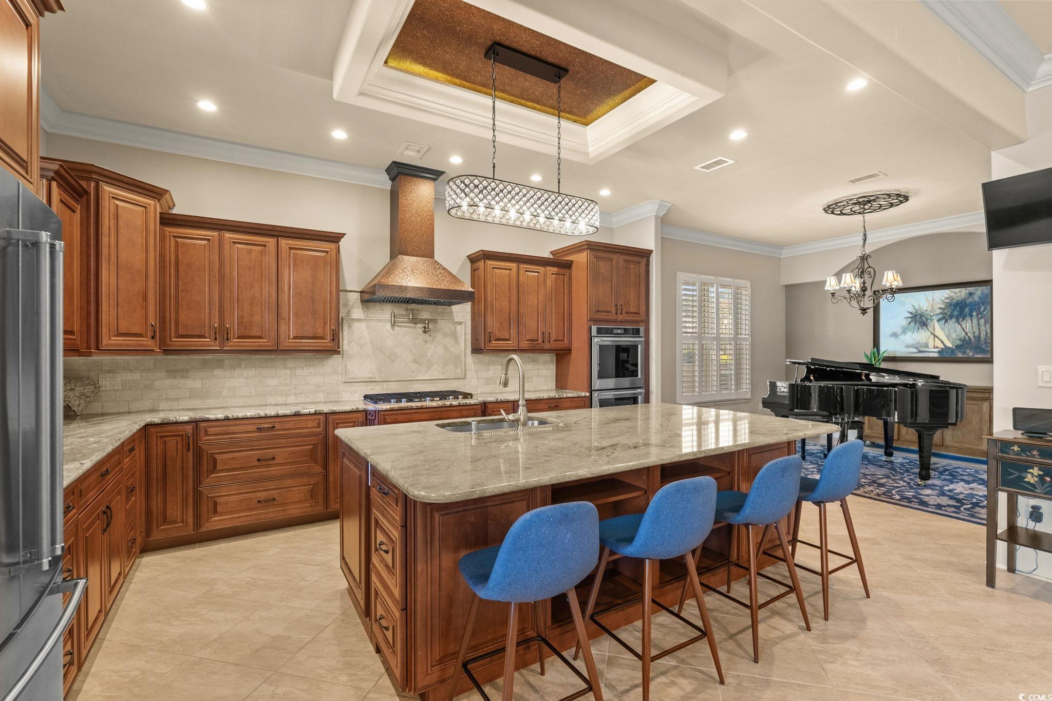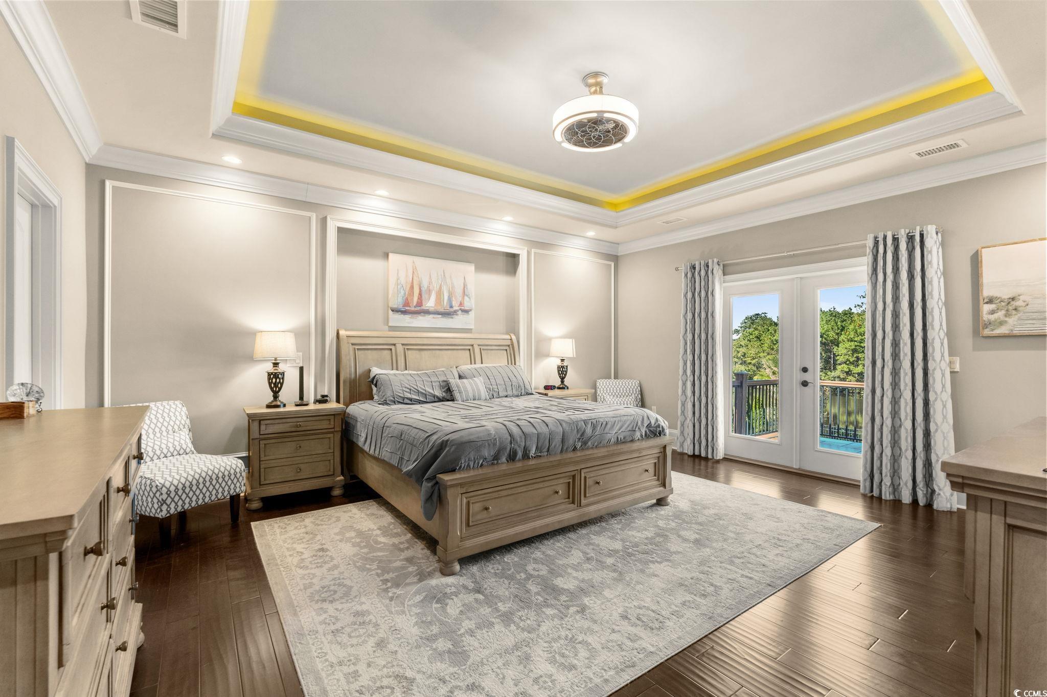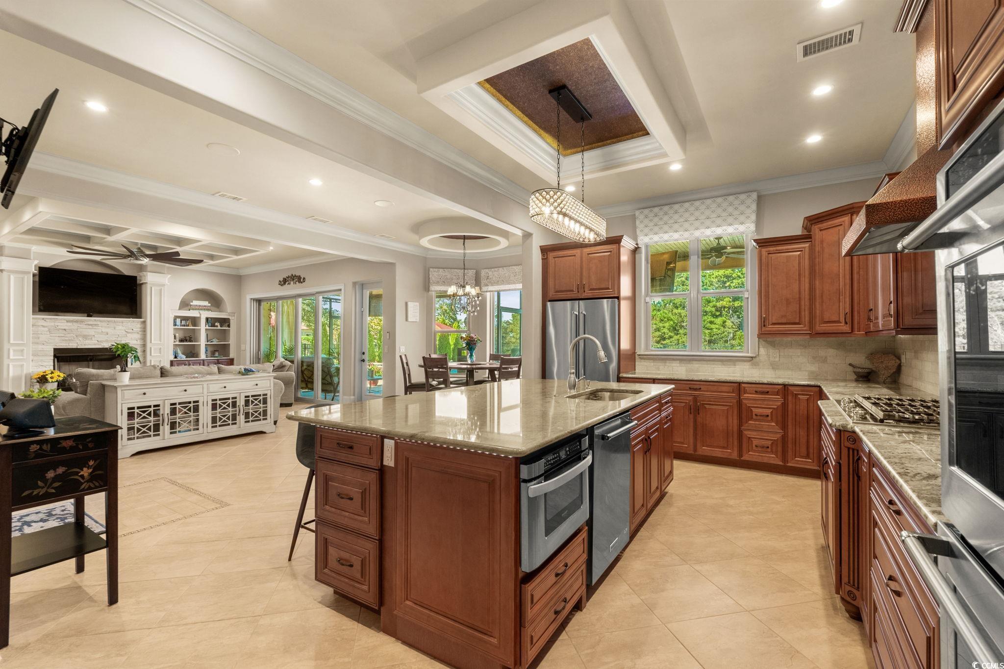 Welcome to 8319 Juxa Drive, a stunning Mediterranean-inspired lakefront estate in the prestigious Plantation Lakes community of Myrtle Beach. Designed for both elegance and comfort, this 5-bedroom, 4-bath custom home offers over 4,500 heated square feet of luxurious living space and showcases dual primary suites one on each level ideal for multi-generational living or hosting guests in style. The main-level primary suite features a private covered patio, double tray ceiling with uplighting, and a spa-like bath with copper vessel sinks, a soaking tub, oversized shower with body jets and custom walk-in closet. Upstairs, the second primary suite offers a private balcony overlooking the lake, a spacious bath with a double sink vanity, and a garden tub perfect for relaxation. The open-concept floor plan centers around a grand great room with a Rainbow Sandstone gas fireplace, custom built-ins, wet bar with ice maker, surround sound and 4-panel sliding doors opening to breathtaking lake views. The gourmet kitchen is a chefs dream, showcasing custom solid maple cabinetry, double KitchenAid ovens, a propane cooktop with a copper hood and pot filler, granite countertops, expanded island with seating area, and walk-in pantry, all flowing seamlessly into a formal dining area and breakfast nook with bay window. Throughout the home, fine details abound hand-scraped hardwood floors, decorative ceilings, plantation shutters, security system, and security cameras enhance both beauty and functionality. Step outside to your own private resort. This lakefront sanctuary offers a heated saltwater pool with tanning ledge, cascading hot tub, gas fire pit, and putting green all surrounded by lush landscaping, elegant paver hardscaping, and a private dock for boating and kayaking. Invite your guests over with plenty of parking utilizing the upgraded paver U shape driveway, Entertain effortlessly in the covered outdoor kitchen and bar area or in the screened-in porch with retractable screens perfect for enjoying evenings by the water. Never miss your favorite show with an outdoor TV in both spaces! Nestled within the sought-after Plantation Lakes community, residents enjoy access to 15 miles of navigable lakes, two pools, a clubhouse with gym and event space, tennis, pickleball and basketball courts, playgrounds, and sidewalks throughout the community. Located in the Carolina Forest area, this home offers convenience to Highway 31, award-winning schools, medical facilities, golf courses, restaurants, outlet shopping, and, of course, the world-famous Myrtle Beach coastline. Experience the perfect blend of sophistication, comfort, and charm at 8319 Juxa Drive where every detail reflects luxury lakefront living at its finest.
