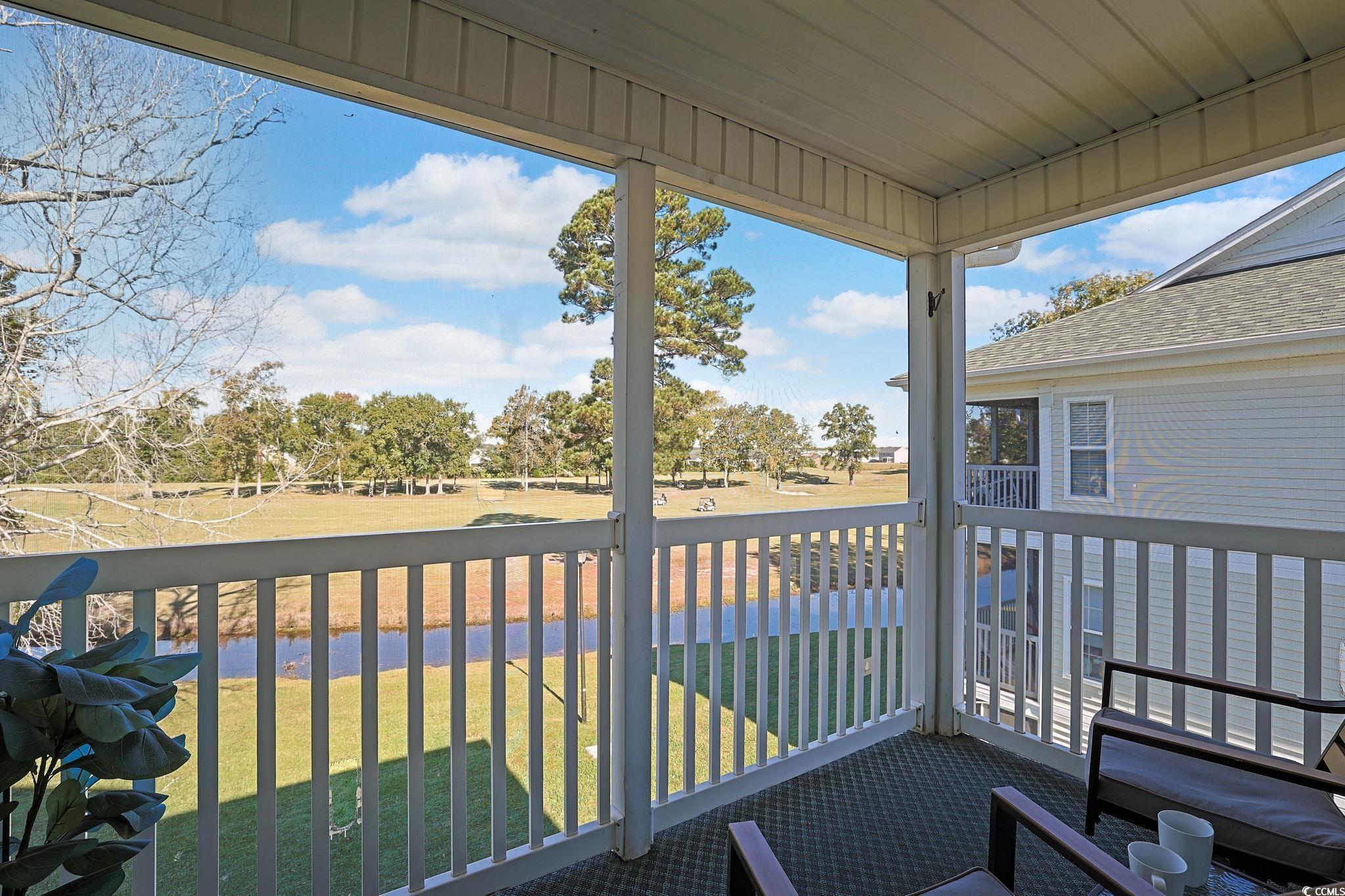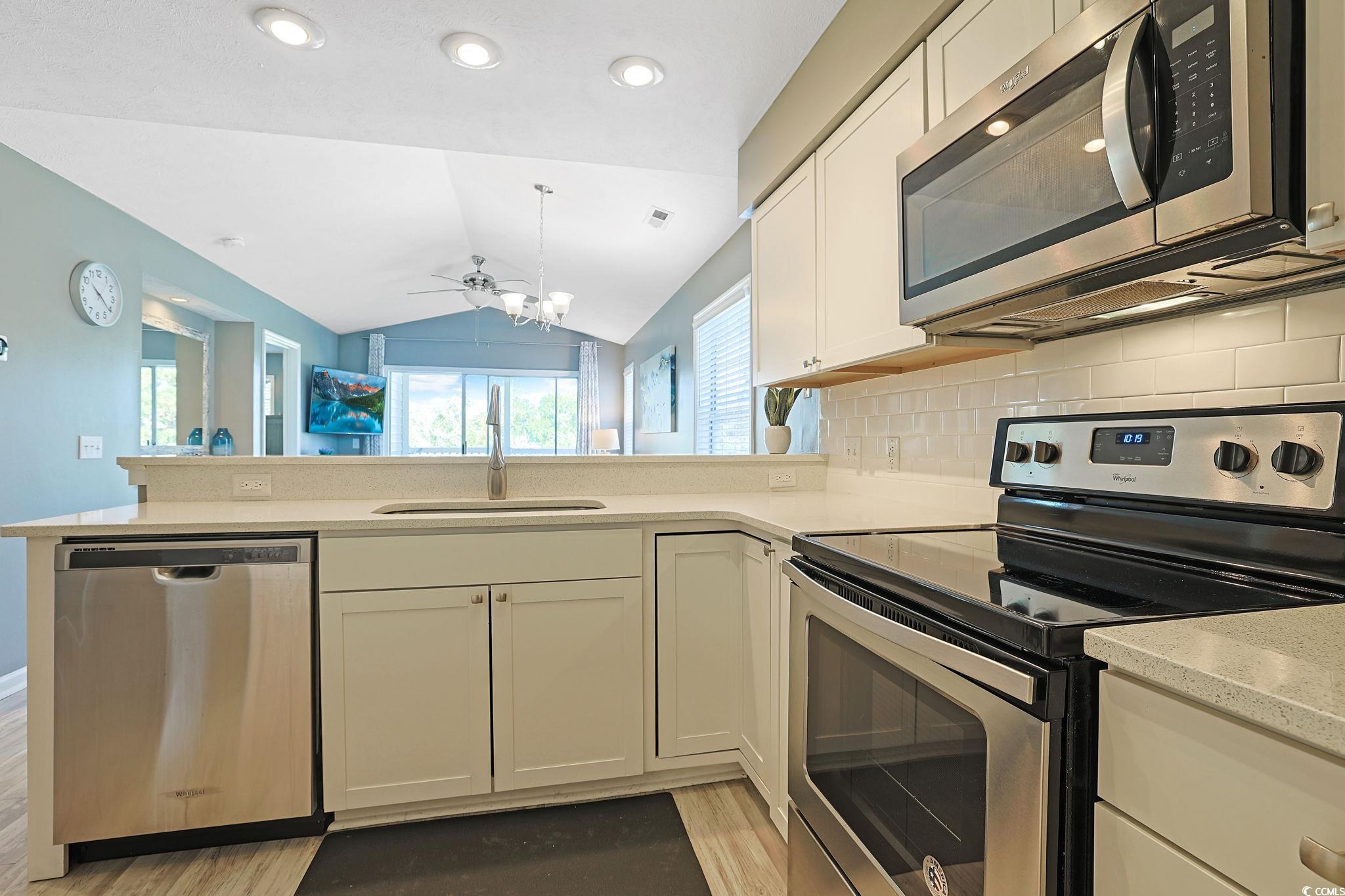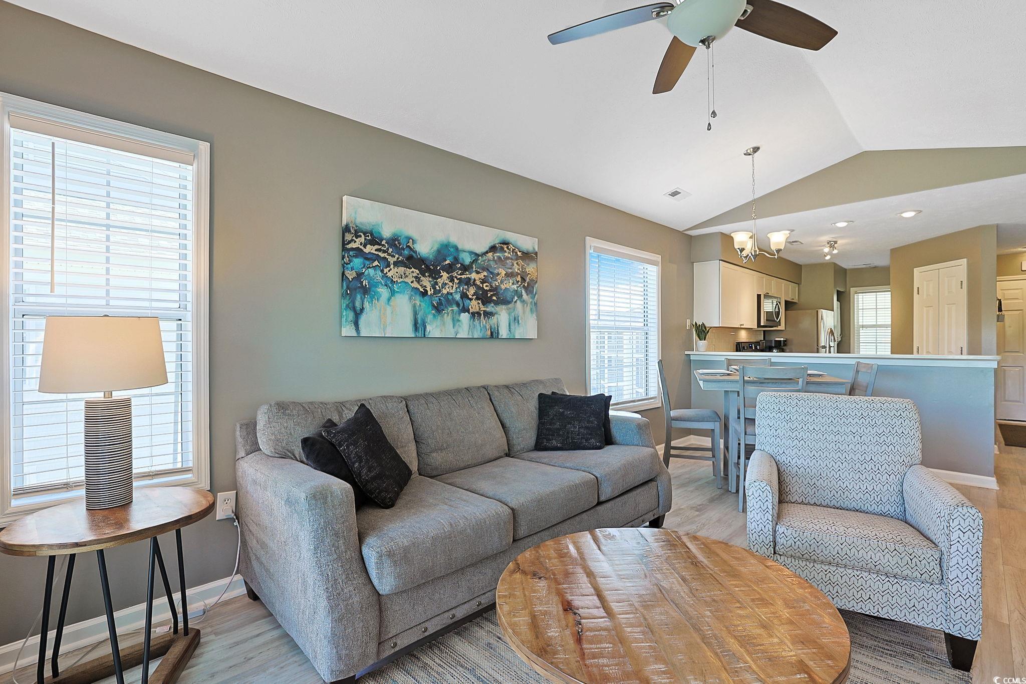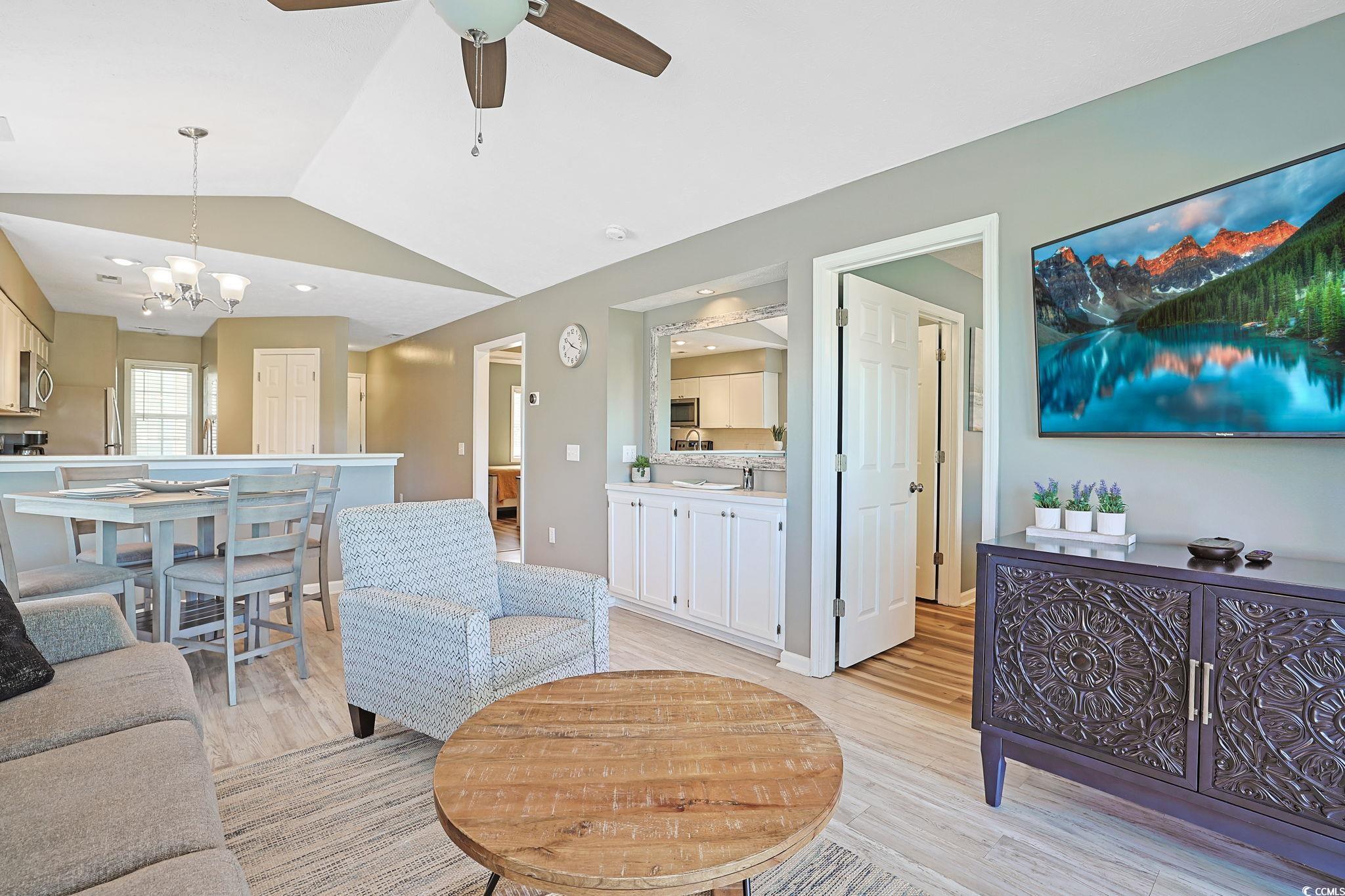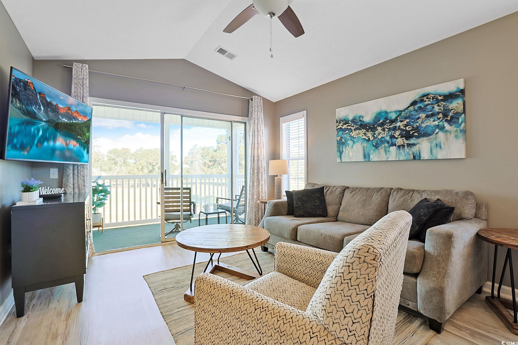 Introducing this well kept end unit 2 bedroom 2 bathroom condo in the River Oaks Condo community. From your balcony you can enjoy tranquil lake & golf views. Inside you will find wood look LVP flooring, stylish furnishings, vaulted ceilings with fans, a classic living/dining room that showcases a sliding glass door that opens up to the relaxing balcony. The family friendly kitchen is equipped with a stainless steel appliance package, breakfast bar, practical pantry, quartz countertops, tile backsplash, laundry nook, along with ample cabinet spaces. The primary bedroom includes a double bi-fold door closet, ceiling fan, private access to the primary bath that features a vanity with a single sink & makeup desk, and a water closet with a timeless step-in shower. This delightful condo is completed with an additional bedroom, full guest bath, and a common area closet. This condo affords you easy access to the beach and golfing along with all of the other activities and happenings inMyrtle Beach including fun eateries, award winning off-Broadway shows, public fishing piers, and intriguing shopping adventures along the Grand Strand. Conveniently located to your everyday needs, including grocery stores, banks, post offices, medical centers, doctors offices, and pharmacies. Check out our state of the art 3-D Virtual Tour.