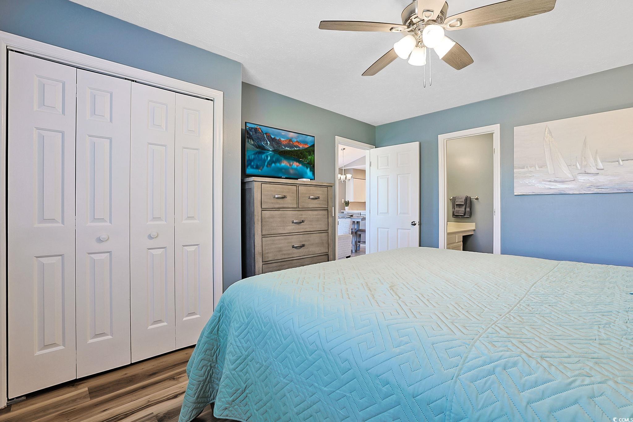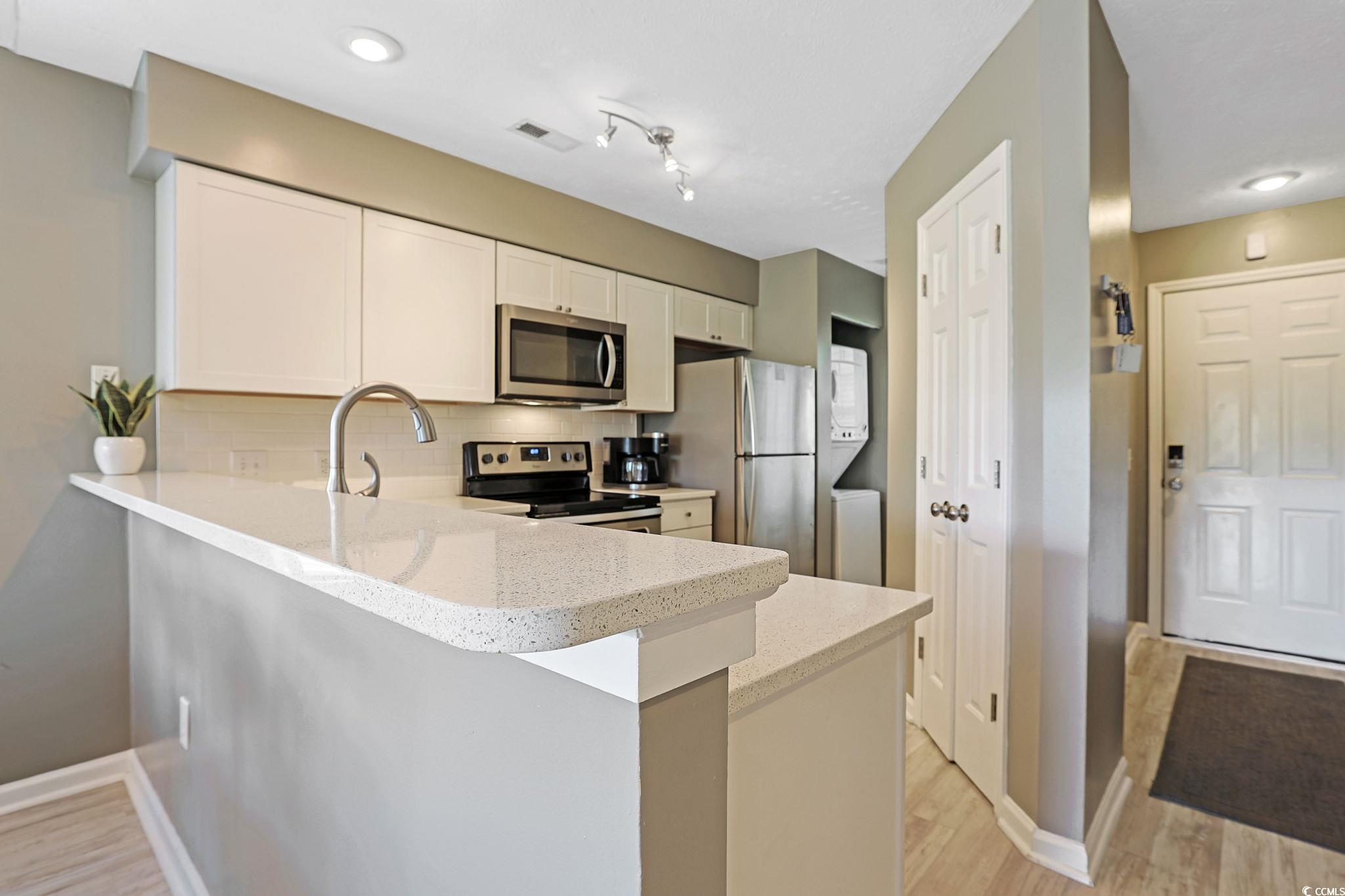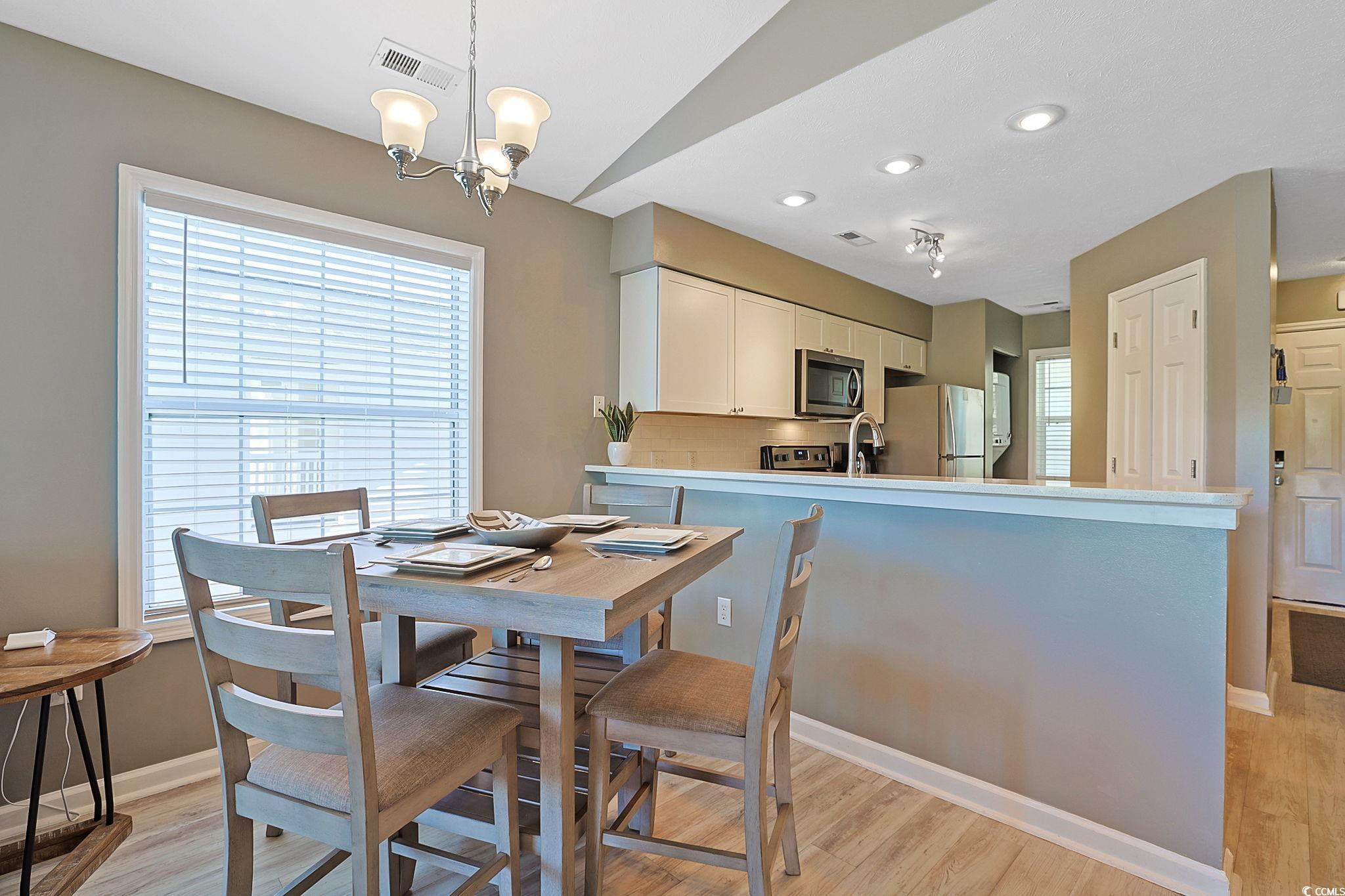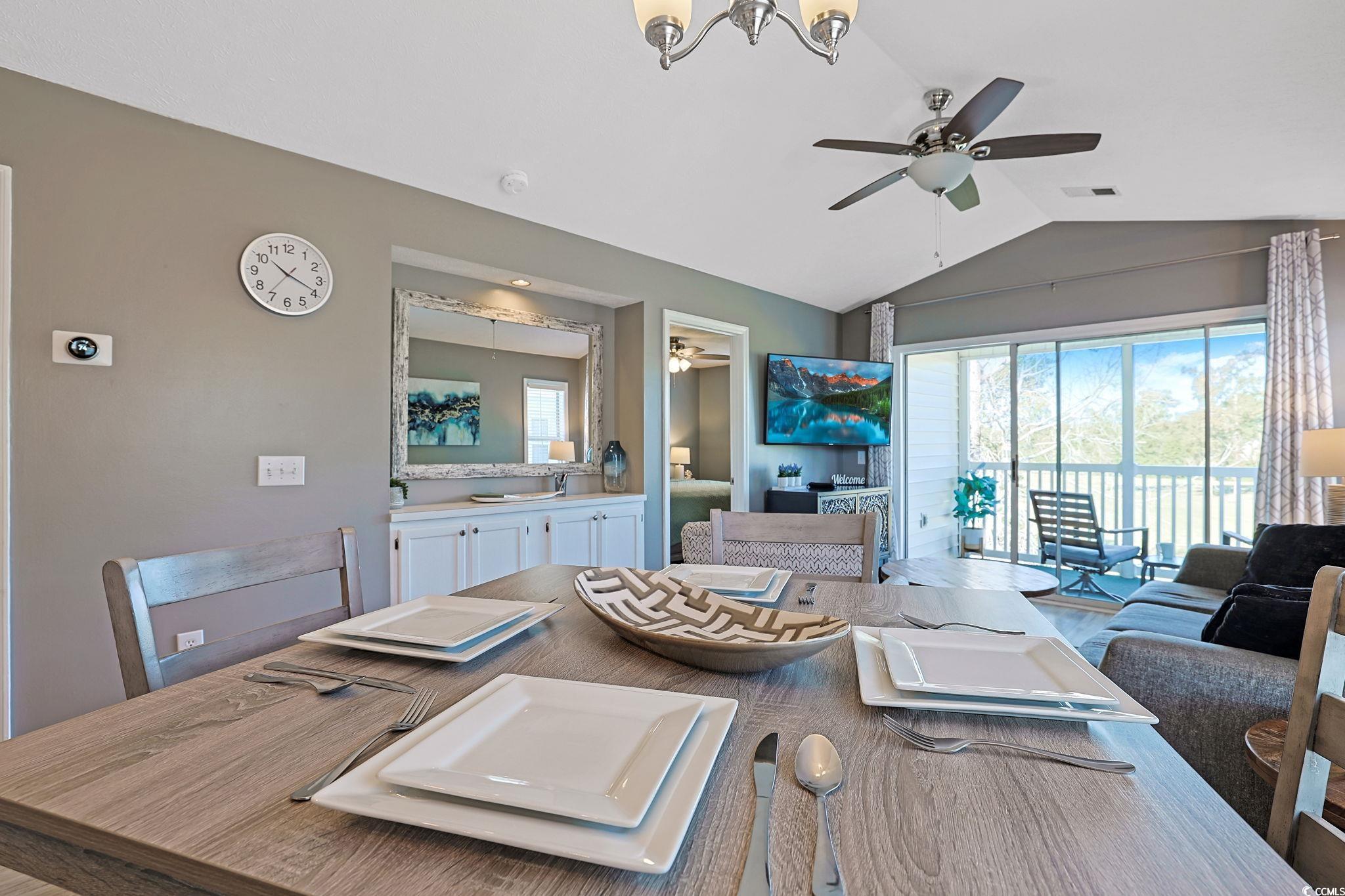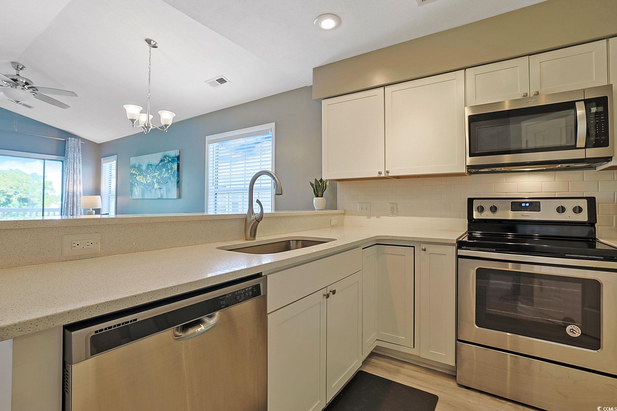 Introducing this well kept end unit 2 bedroom 2 bathroom condo in the River Oaks Condo community. From your balcony you can enjoy tranquil lake & golf views. Inside you will find wood look LVP flooring, stylish furnishings, vaulted ceilings with fans, a classic living/dining room that showcases a sliding glass door that opens up to the relaxing balcony. The family friendly kitchen is equipped with a stainless steel appliance package, breakfast bar, practical pantry, quartz countertops, tile backsplash, laundry nook, along with ample cabinet spaces. The primary bedroom includes a double bi-fold door closet, ceiling fan, private access to the primary bath that features a vanity with a single sink & makeup desk, and a water closet with a timeless step-in shower. This delightful condo is completed with an additional bedroom, full guest bath, and a common area closet. This condo affords you easy access to the beach and golfing along with all of the other activities and happenings inMyrtle Beach including fun eateries, award winning off-Broadway shows, public fishing piers, and intriguing shopping adventures along the Grand Strand. Conveniently located to your everyday needs, including grocery stores, banks, post offices, medical centers, doctors offices, and pharmacies. Check out our state of the art 3-D Virtual Tour.