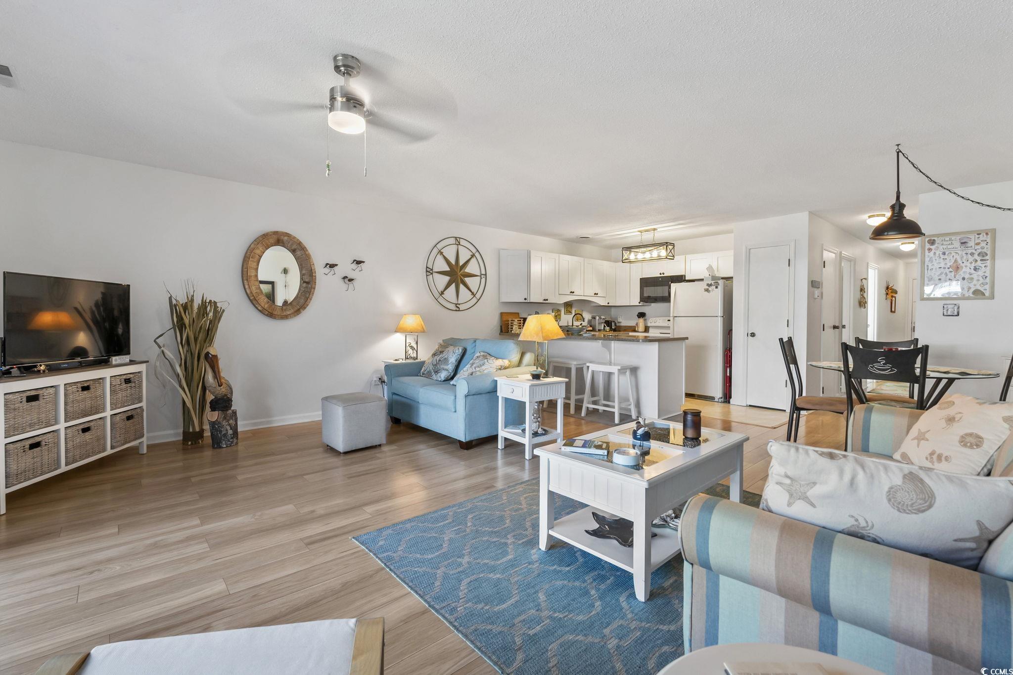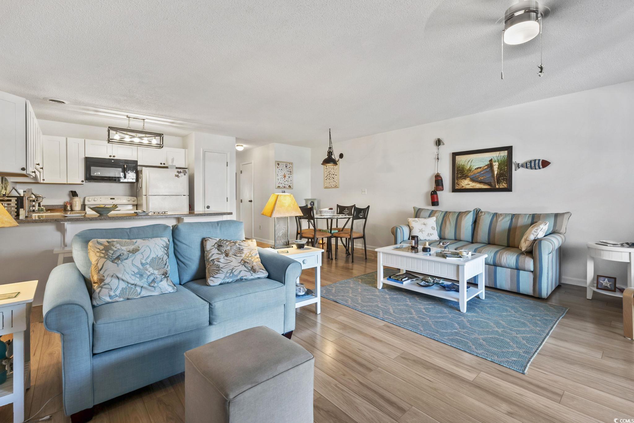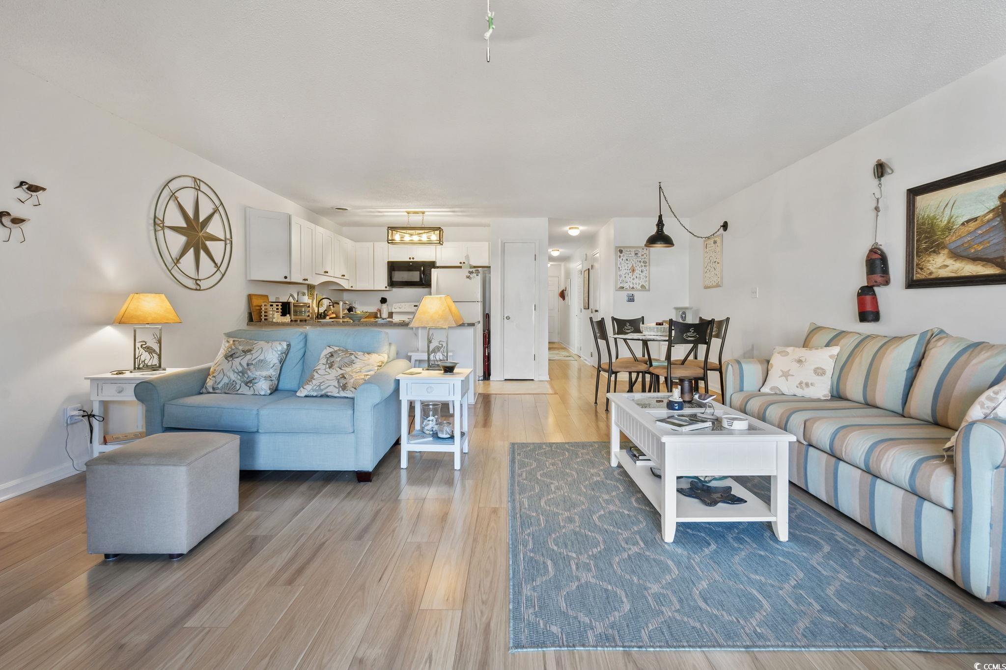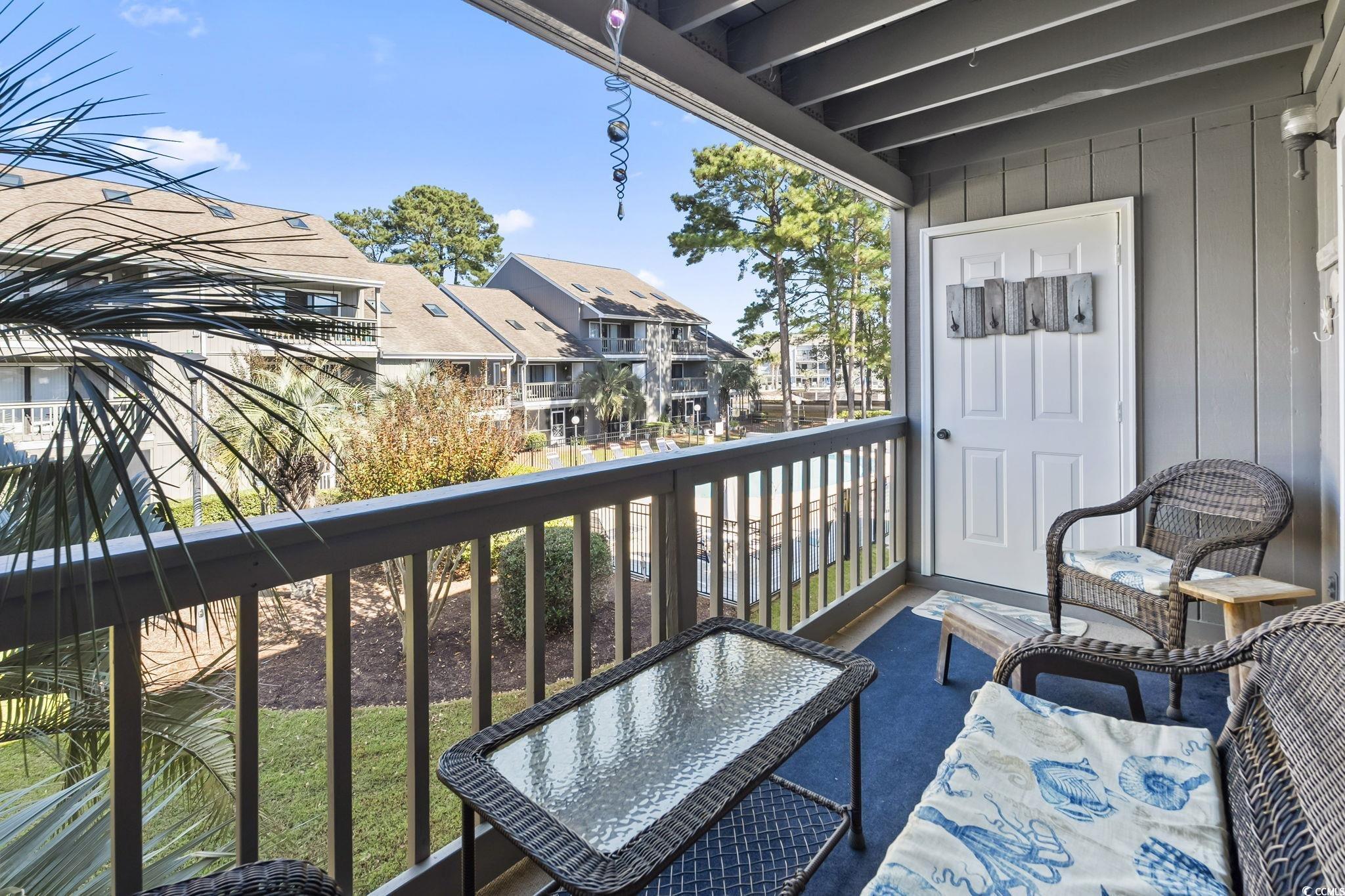 This beautifully updated, furnished, second-floor condo offers an open and inviting layout designed for both comfort and functionality. The spacious living room features durable LVP flooring that flows throughout the home, creating a clean and cohesive look. Adjacent to the living area, the kitchen is highlighted by white shaker-style cabinetry, granite countertops, and a breakfast bar that provides additional seating and serving space - perfect for casual dining or entertaining. The dining area is conveniently positioned near the kitchen, offering the ideal setting for shared meals or gatherings. Just off the living room, a private balcony provides an excellent spot for morning coffee or evening relaxation. The primary bedroom is generously sized and offers direct access to a full bathroom, complete with modern finishes. An additional half bath is located near the entry, ideal for guests or added convenience. A separate utility closet outside provides additional storage space, and the laundry area is easily accessible just off the main living space on the balcony. Thoughtfully designed with a seamless flow from room to room, this condo combines modern updates with low-maintenance living in a prime coastal location. The community is both welcoming and flexible! Golf carts and motorcycles are allowed, and yes, you can golf cart straight to the beach! Short-term rentals such as Airbnb and VRBO are permitted, making this an excellent option for investors or anyone wanting a second home that can generate income when not in use. Owners are also welcome to have pets, adding to the home's appeal and versatility. The HOA covers nearly everything: water, cable, internet, trash, pest control, pool access, and maintenance of all common areas; so you can spend more time relaxing and less time worrying about upkeep. Whether you're looking for a permanent home, a vacation escape, or a rental-ready investment, this property captures the relaxed spirit of coastal living. Condo is being sold furnished. All measurements are approximate and must be verified by the buyer.