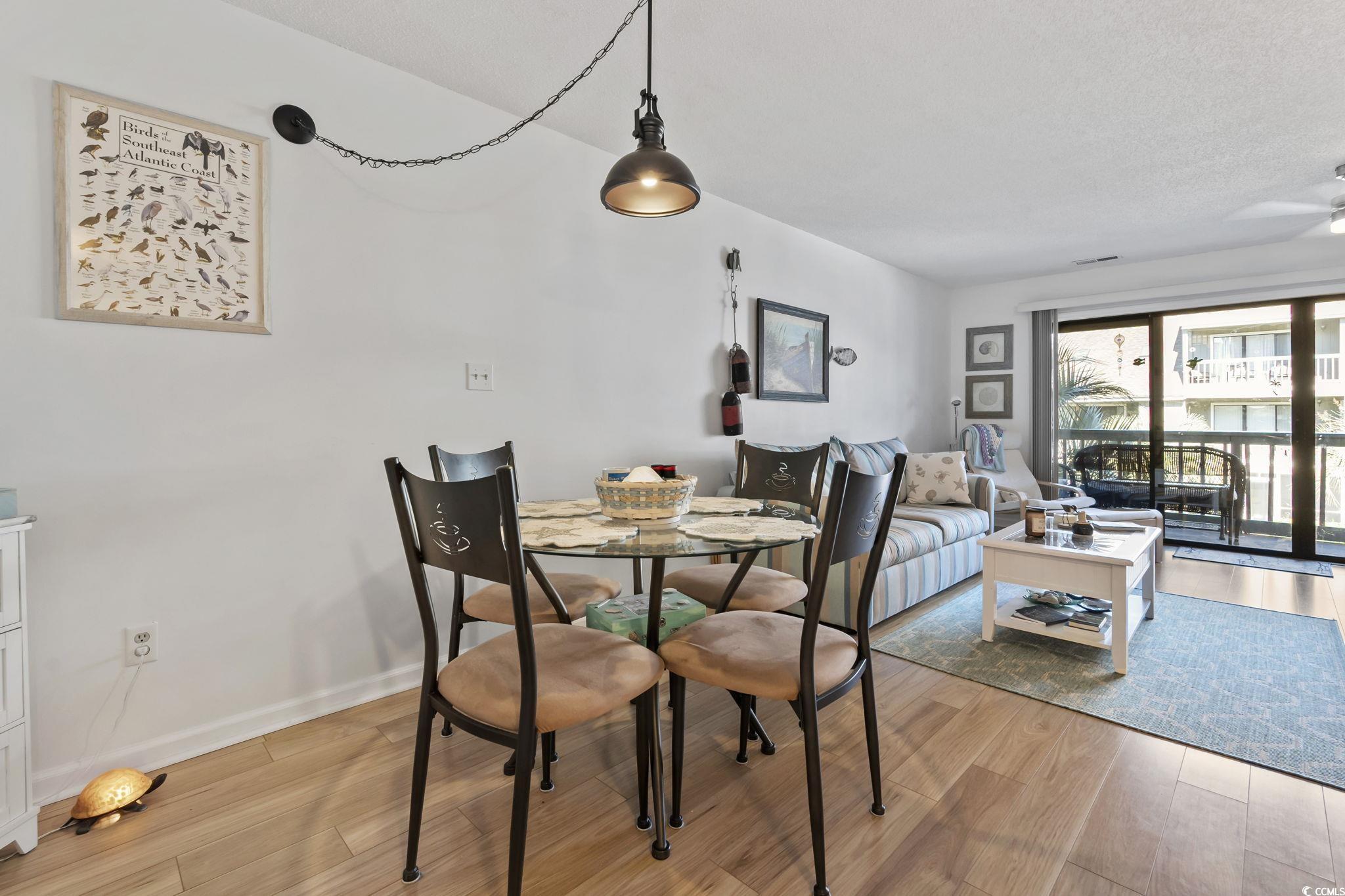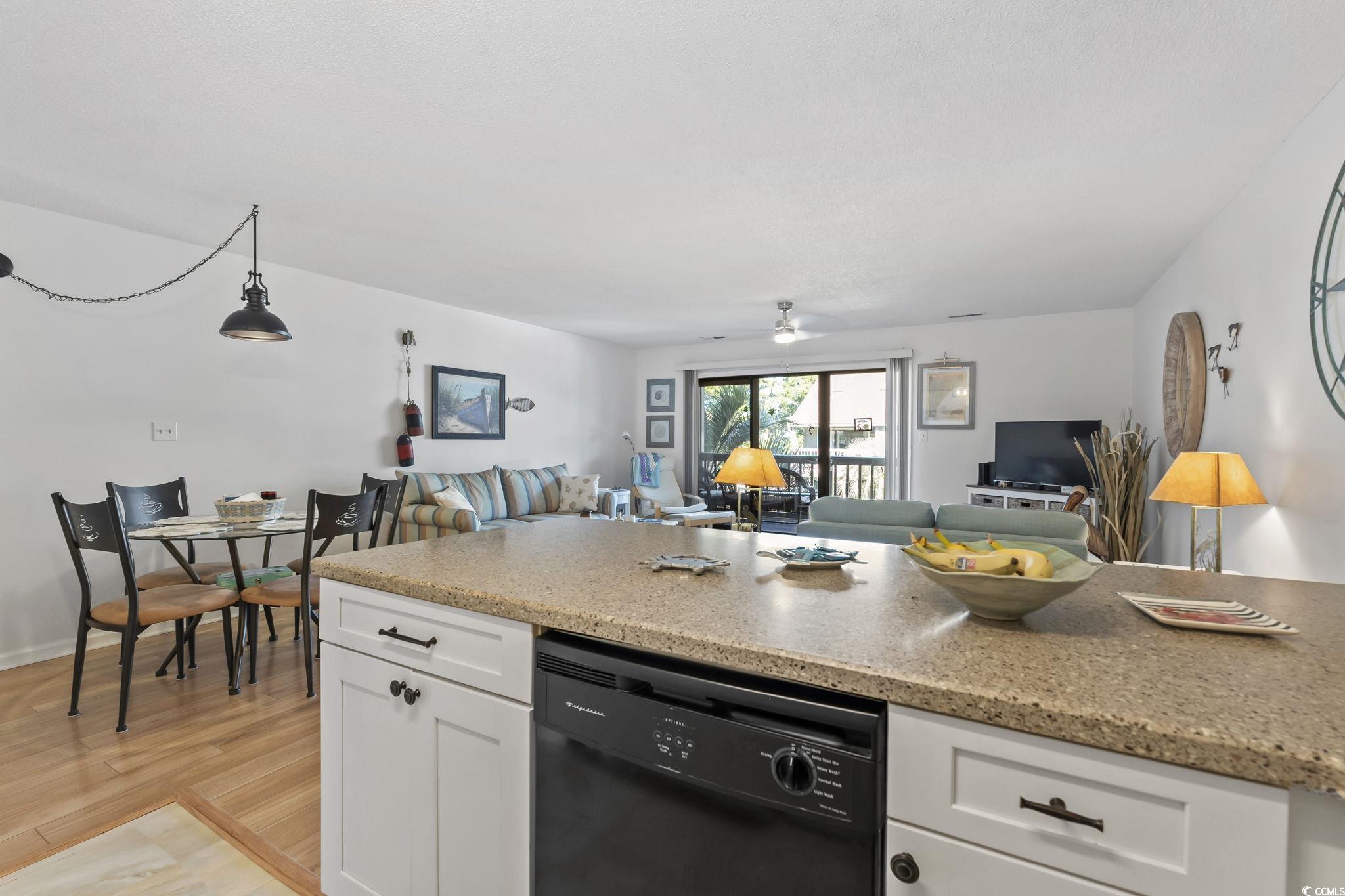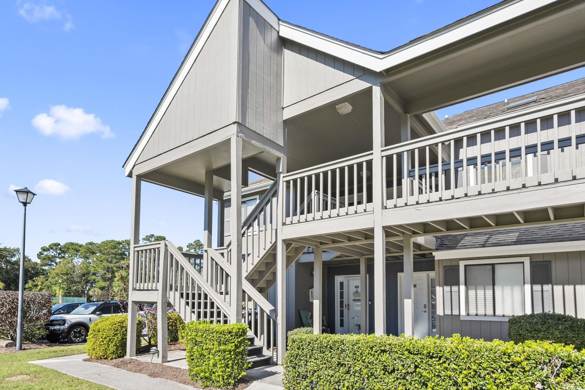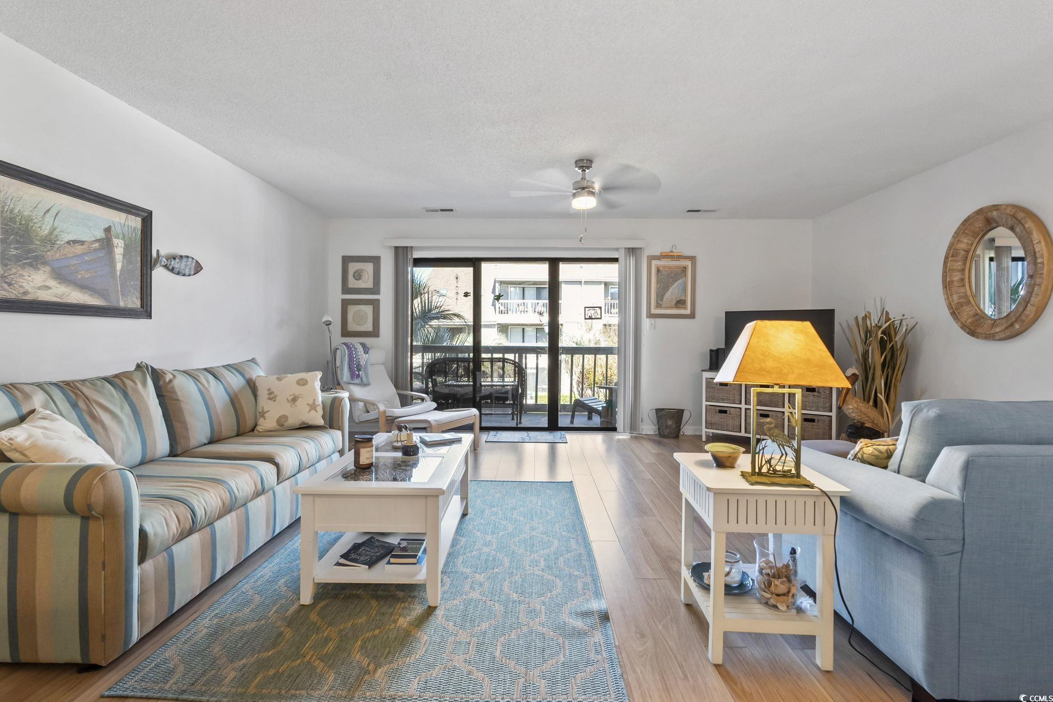 This beautifully updated, furnished, second-floor condo offers an open and inviting layout designed for both comfort and functionality. The spacious living room features durable LVP flooring that flows throughout the home, creating a clean and cohesive look. Adjacent to the living area, the kitchen is highlighted by white shaker-style cabinetry, granite countertops, and a breakfast bar that provides additional seating and serving space - perfect for casual dining or entertaining. The dining area is conveniently positioned near the kitchen, offering the ideal setting for shared meals or gatherings. Just off the living room, a private balcony provides an excellent spot for morning coffee or evening relaxation. The primary bedroom is generously sized and offers direct access to a full bathroom, complete with modern finishes. An additional half bath is located near the entry, ideal for guests or added convenience. A separate utility closet outside provides additional storage space, and the laundry area is easily accessible just off the main living space on the balcony. Thoughtfully designed with a seamless flow from room to room, this condo combines modern updates with low-maintenance living in a prime coastal location. The community is both welcoming and flexible! Golf carts and motorcycles are allowed, and yes, you can golf cart straight to the beach! Short-term rentals such as Airbnb and VRBO are permitted, making this an excellent option for investors or anyone wanting a second home that can generate income when not in use. Owners are also welcome to have pets, adding to the home's appeal and versatility. The HOA covers nearly everything: water, cable, internet, trash, pest control, pool access, and maintenance of all common areas; so you can spend more time relaxing and less time worrying about upkeep. Whether you're looking for a permanent home, a vacation escape, or a rental-ready investment, this property captures the relaxed spirit of coastal living. Condo is being sold furnished. All measurements are approximate and must be verified by the buyer.