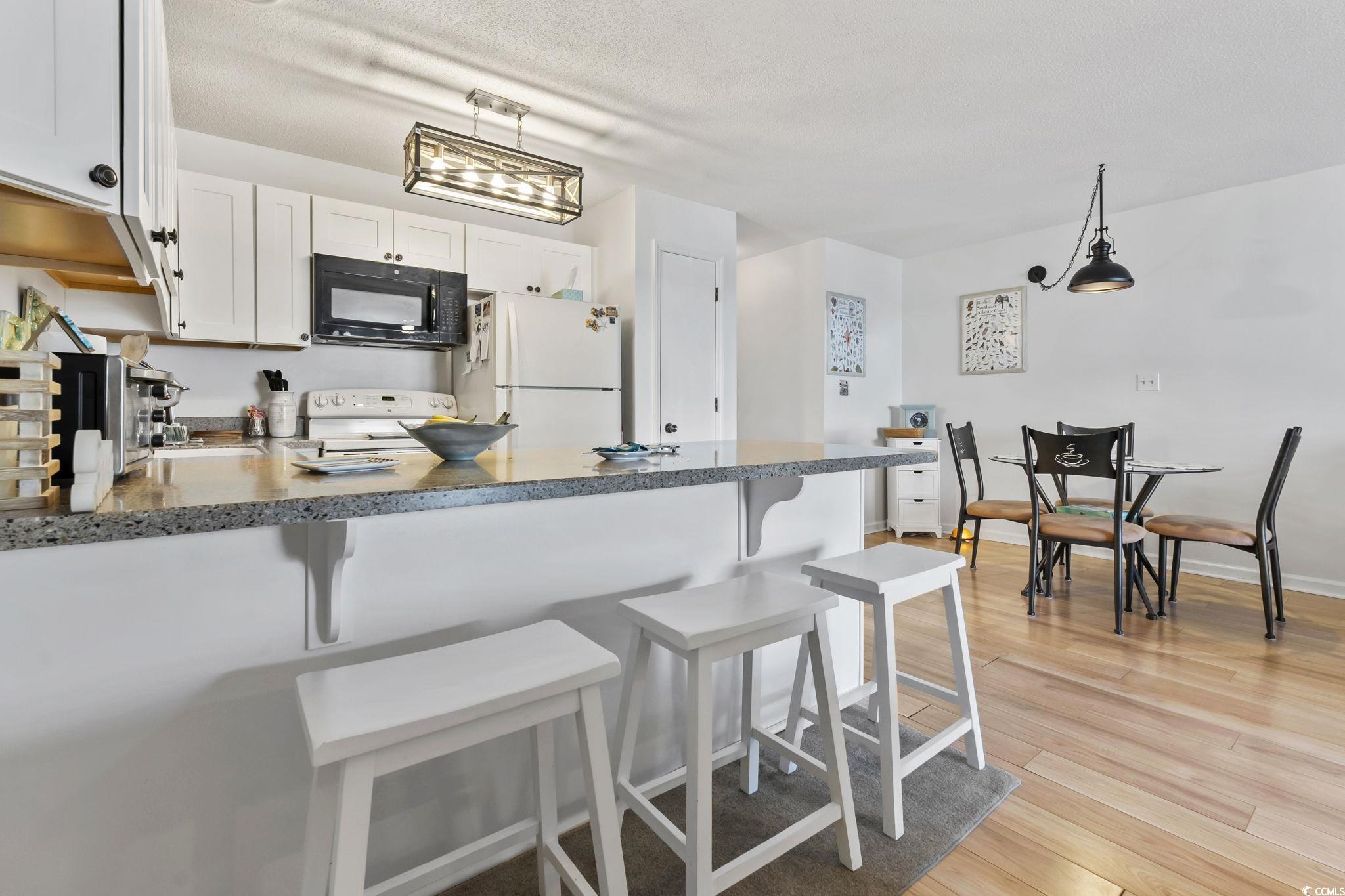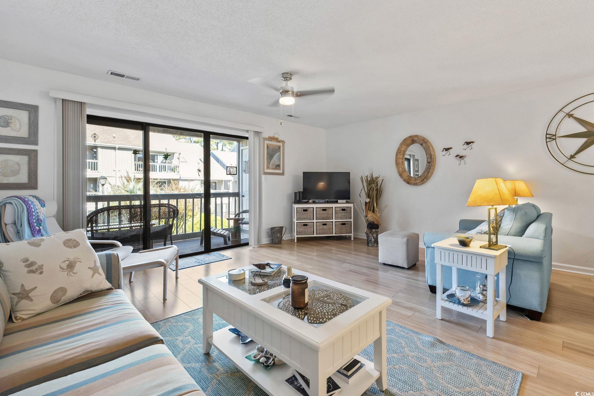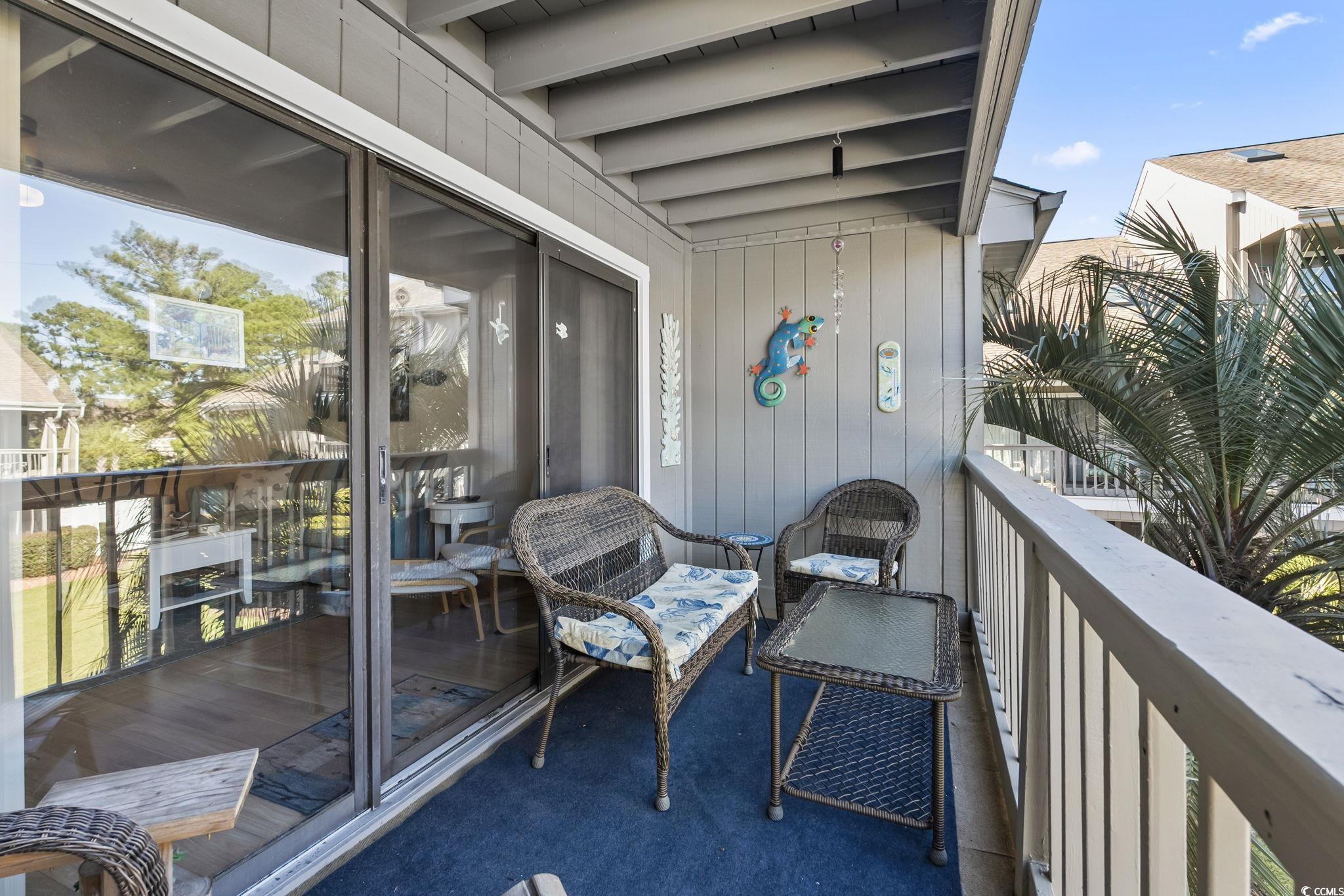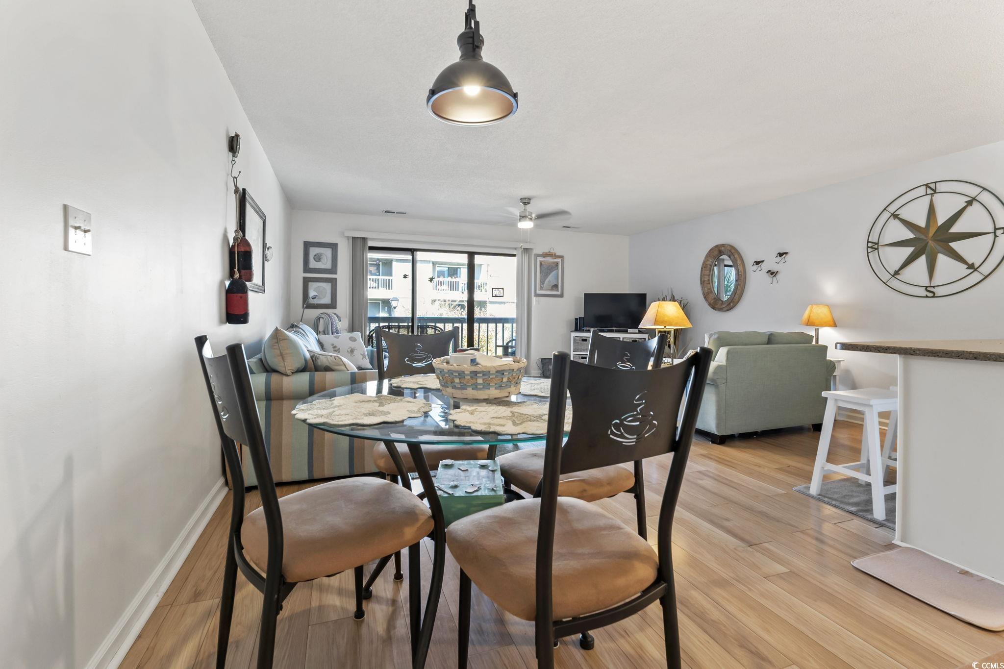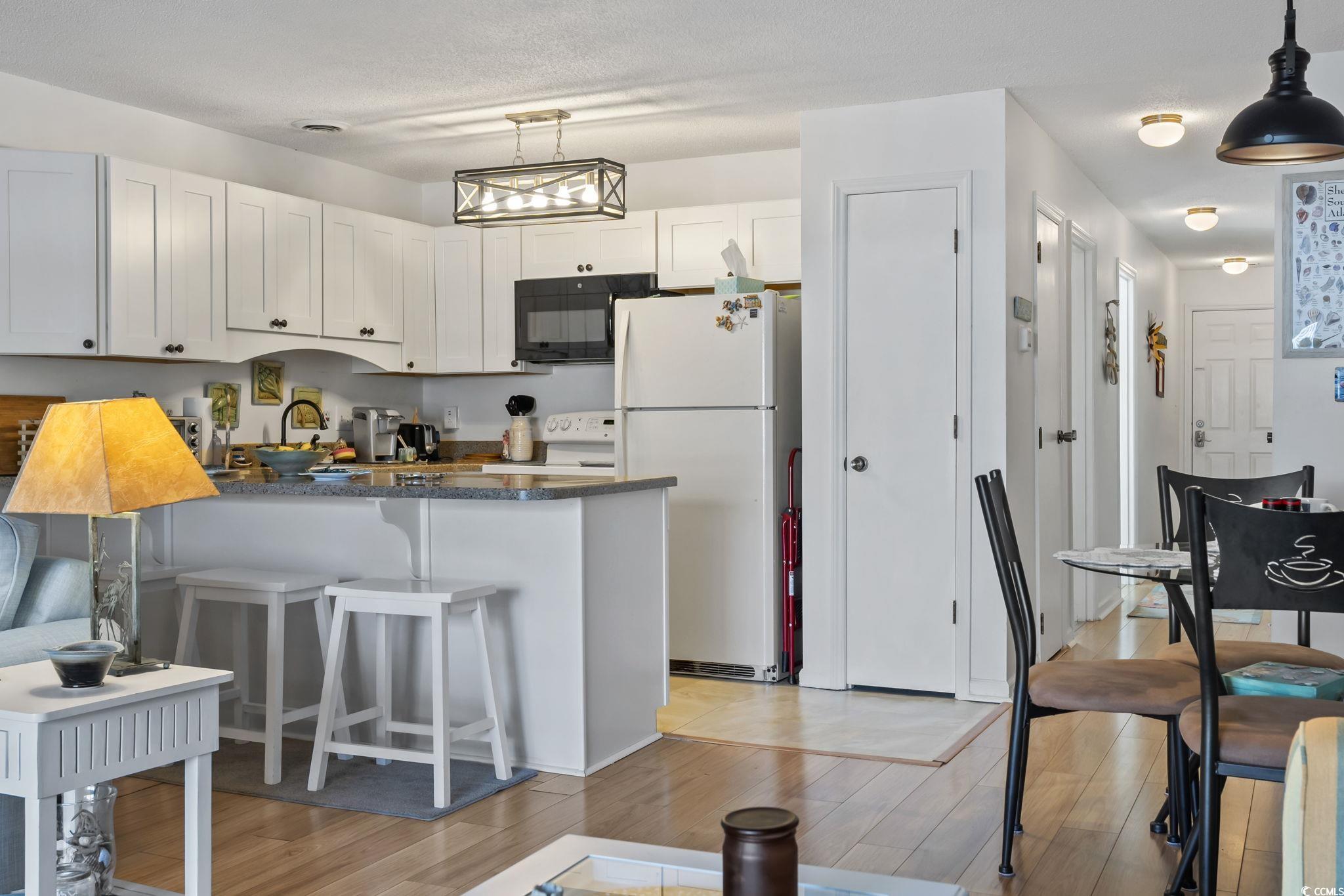 This beautifully updated, furnished, second-floor condo offers an open and inviting layout designed for both comfort and functionality. The spacious living room features durable LVP flooring that flows throughout the home, creating a clean and cohesive look. Adjacent to the living area, the kitchen is highlighted by white shaker-style cabinetry, granite countertops, and a breakfast bar that provides additional seating and serving space - perfect for casual dining or entertaining. The dining area is conveniently positioned near the kitchen, offering the ideal setting for shared meals or gatherings. Just off the living room, a private balcony provides an excellent spot for morning coffee or evening relaxation. The primary bedroom is generously sized and offers direct access to a full bathroom, complete with modern finishes. An additional half bath is located near the entry, ideal for guests or added convenience. A separate utility closet outside provides additional storage space, and the laundry area is easily accessible just off the main living space on the balcony. Thoughtfully designed with a seamless flow from room to room, this condo combines modern updates with low-maintenance living in a prime coastal location. The community is both welcoming and flexible! Golf carts and motorcycles are allowed, and yes, you can golf cart straight to the beach! Short-term rentals such as Airbnb and VRBO are permitted, making this an excellent option for investors or anyone wanting a second home that can generate income when not in use. Owners are also welcome to have pets, adding to the home's appeal and versatility. The HOA covers nearly everything: water, cable, internet, trash, pest control, pool access, and maintenance of all common areas; so you can spend more time relaxing and less time worrying about upkeep. Whether you're looking for a permanent home, a vacation escape, or a rental-ready investment, this property captures the relaxed spirit of coastal living. Condo is being sold furnished. All measurements are approximate and must be verified by the buyer.