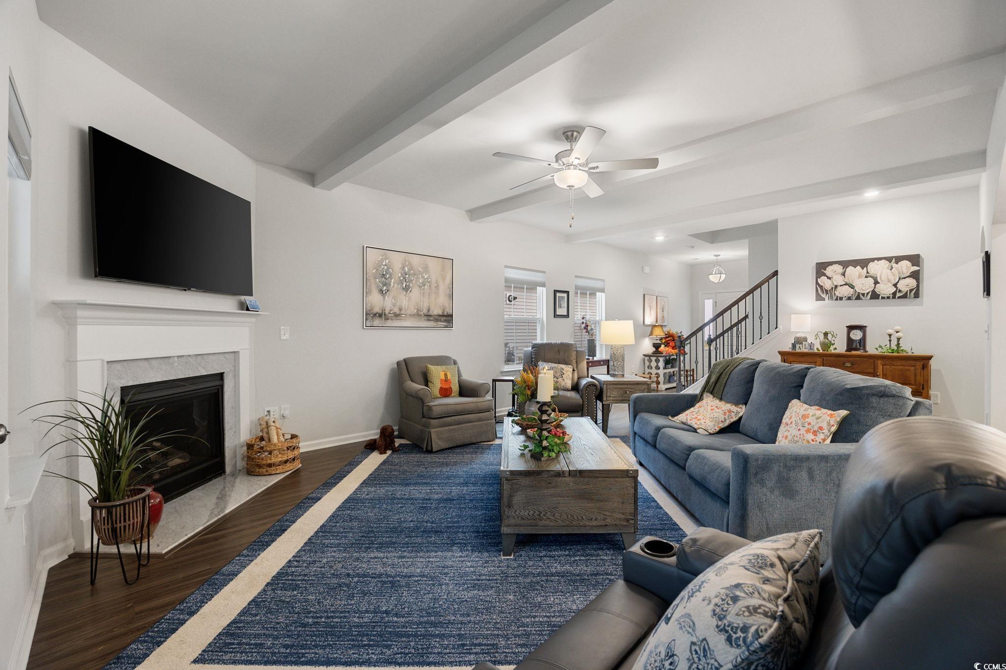 LivingRoom: BeamedCeilings, CeilingFans, Fireplace