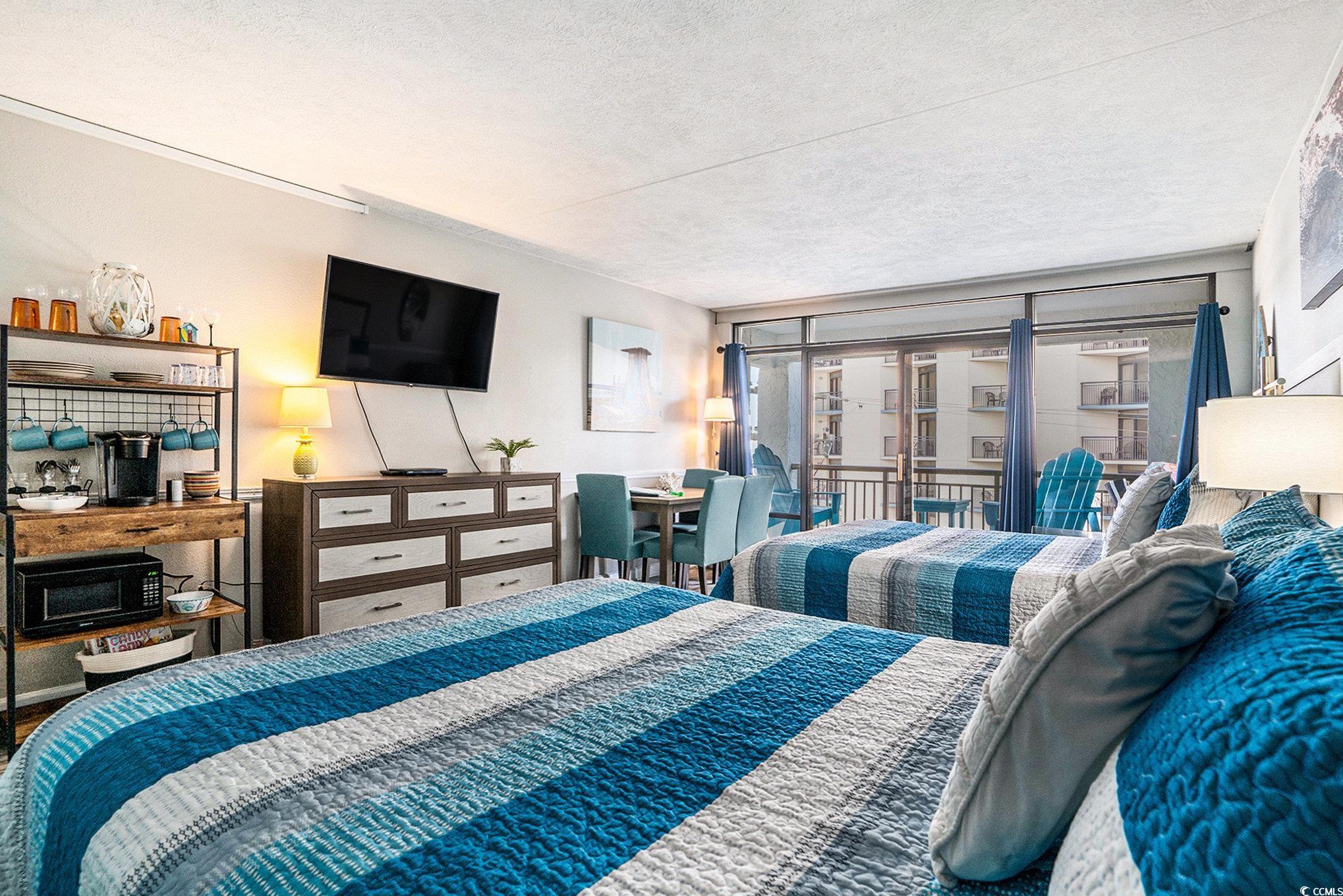 Welcome to this stunning efficiency ocean-view condo located in the renowned Grande Cayman Resort in Myrtle Beach! This condo perfectly combines comfort, style, and convenience for your ideal coastal retreat. As you enter, you'll be greeted by a kitchenette featuring granite countertops, a microwave, and a refrigerator-perfect for those quick meals or snacks. The upgraded LVP flooring throughout the unit adds a modern and appealing touch to the living space. Sleep comfortably in the two queen-sized beds, accommodating your family and friends with ease. The bathroom is elegantly designed with a granite countertop and a stylish shower tub combo with tile shower. Step outside to your private balcony and soak in the breathtaking panoramic views of the Atlantic Ocean, making it the perfect spot for morning coffee or evening relaxation. This condo is being sold fully furnished, offering a turn-key opportunity for new owners to move in and start enjoying the beach lifestyle right away. The Grande Cayman Resort enhances your vacation experience with a variety of amenities. Take a refreshing dip in the oceanfront outdoor pool, unwind in the indoor pool, or float along the lazy river. For endless entertainment, enjoy the water park, sauna, fitness center, and miniature golf, there's something for everyone! Culinary delights are just a stone's throw away, with fantastic dining options like Due South at 72nd, Turtle Bay Cafe, a Tiki Bar, and Starbucks conveniently located within the resort. This condo is not just a great vacation home; it also serves as an excellent investment property. Don't wait, schedule your showing today!