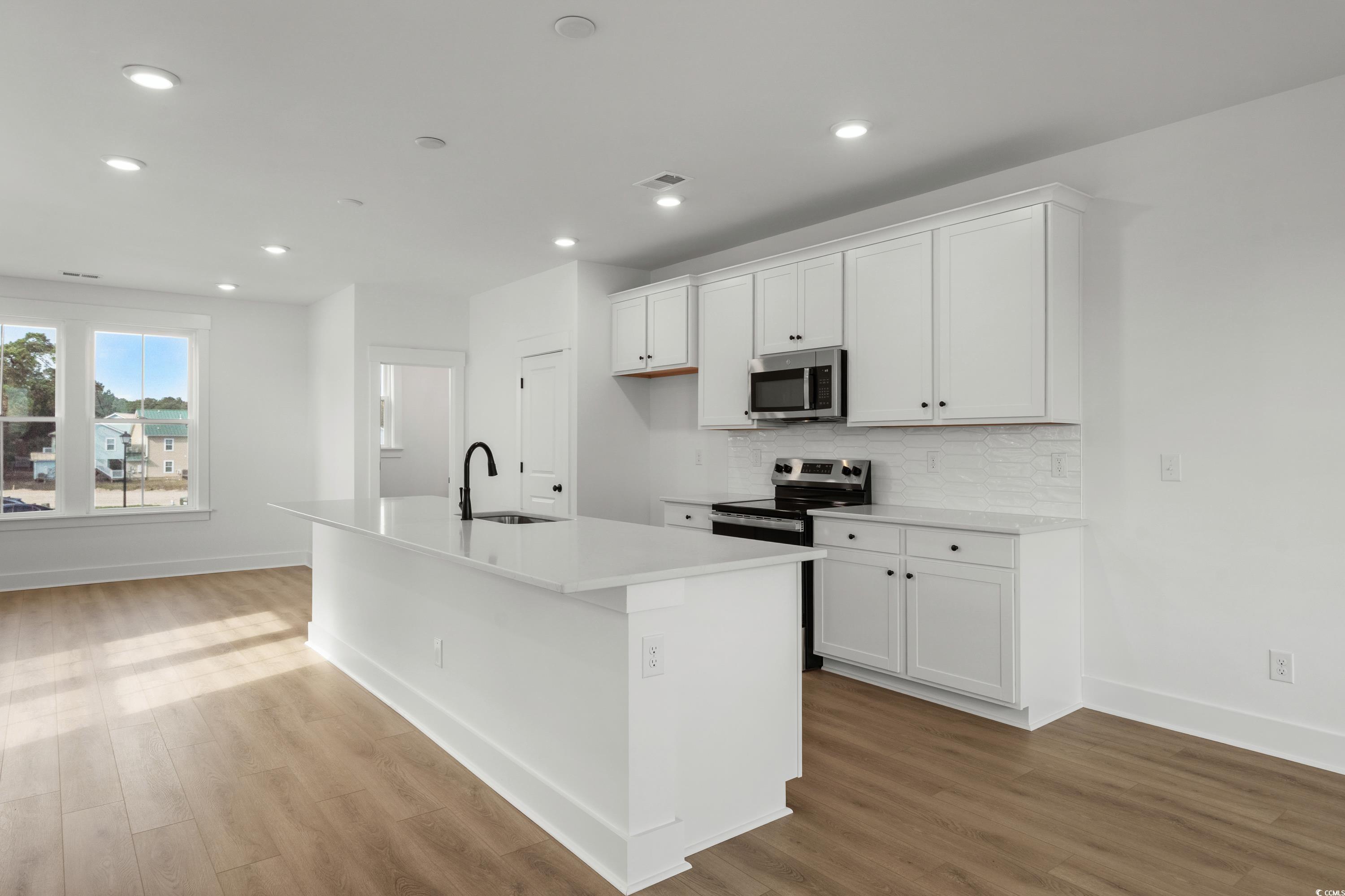 Discover the Brookgreen, a modern three-story 4 bedroom multilevel condo designed for flexible living. The main level features an open-concept kitchen with a large quartz countertop island overlooking the breakfast area, flex space, and family room. Upstairs, the primary suite includes two walk-in closets, dual vanities and an oversized tiled shower, with two additional bedrooms nearby. This home has been thoughtfully curated with black plumbing and hardware throughout. The entry level offers a guest suite for added convenience! LOCATION! LOCATION! The only new low maintenance multilevel condo community in Little River with direct access to marinas, restaurants, and more! Seabreeze Crossing is just steps from the Intracoastal Waterway and only minutes from the beaches of North Myrtle Beach. Featuring 56 beautifully designed homes, Seabreeze Crossing combines coastal charm, low-maintenance living with low condo fee, and an unbeatable locationideal for full-time residents, second-home buyers, or anyone seeking a relaxing beach retreat. *Photos are of actual home