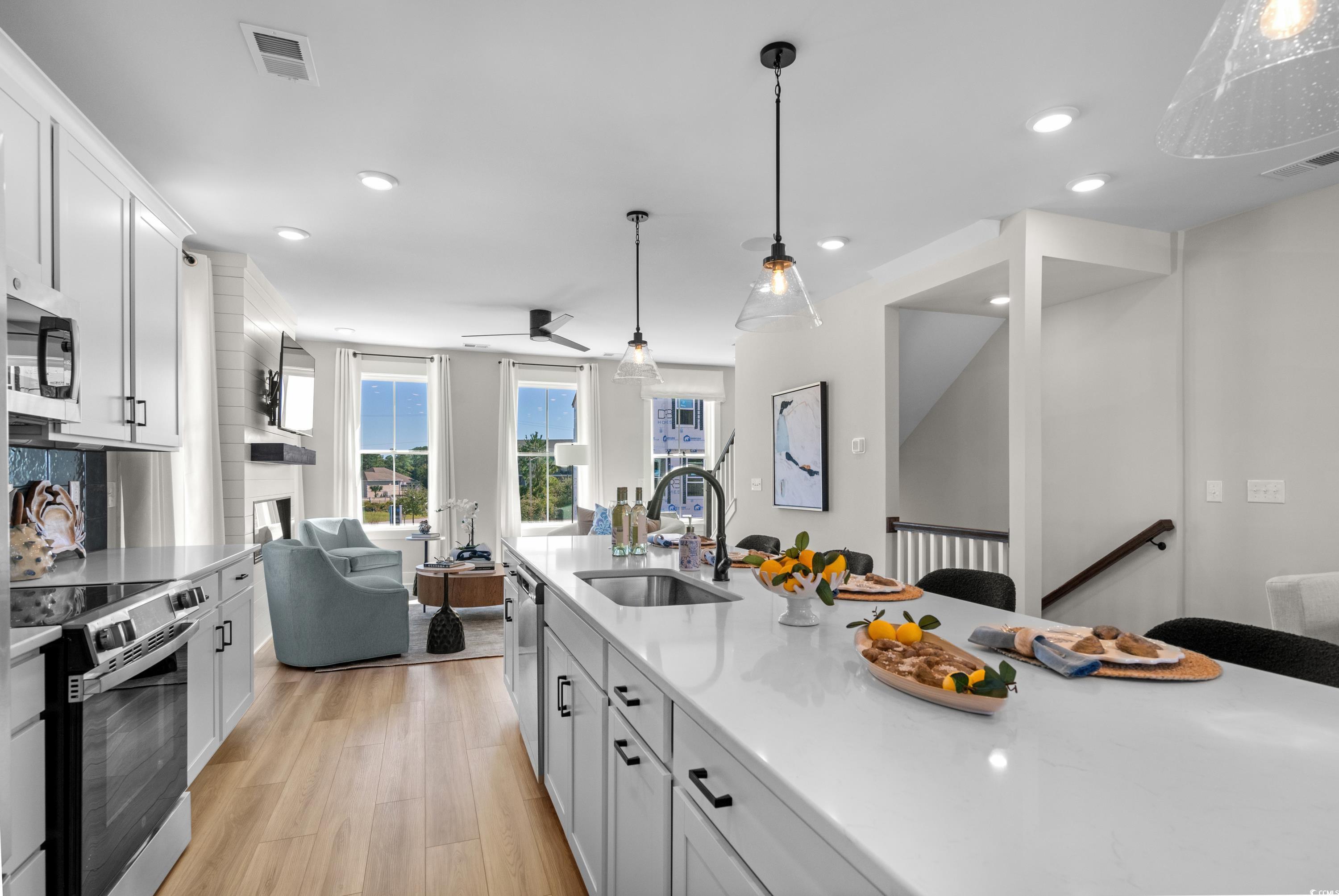 Discover this right end unit Brookgreen model, a modern three-story 4 bedroom multilevel condo designed for flexible living. The main level features an open-concept kitchen with a large quartz countertop island overlooking the breakfast area, flex space, and family room. Added black plumbing fixtures and hardware throughout the home. Upstairs, the primary suite includes two walk-in closets, dual vanities and an oversized tiled shower, with two additional bedrooms nearby. The entry level offers an additional open living space/game room, perfect for entertaining and covered back porch! LOCATION! LOCATION! The only new low maintenance townhome-style condo community in Little River with direct access to marinas, restaurants, and more! Seabreeze Crossing is just steps from the Intracoastal Waterway and only minutes from the beaches of North Myrtle Beach. Featuring 56 beautifully designed homes, Seabreeze Crossing combines coastal charm, low-maintenance living with low condo fee, and an unbeatable locationideal for full-time residents, second-home buyers, or anyone seeking a relaxing beach retreat.