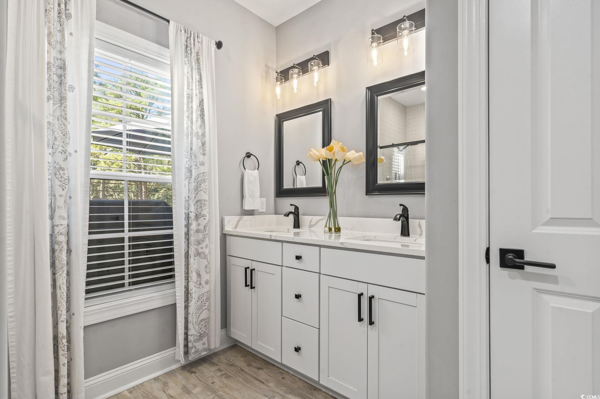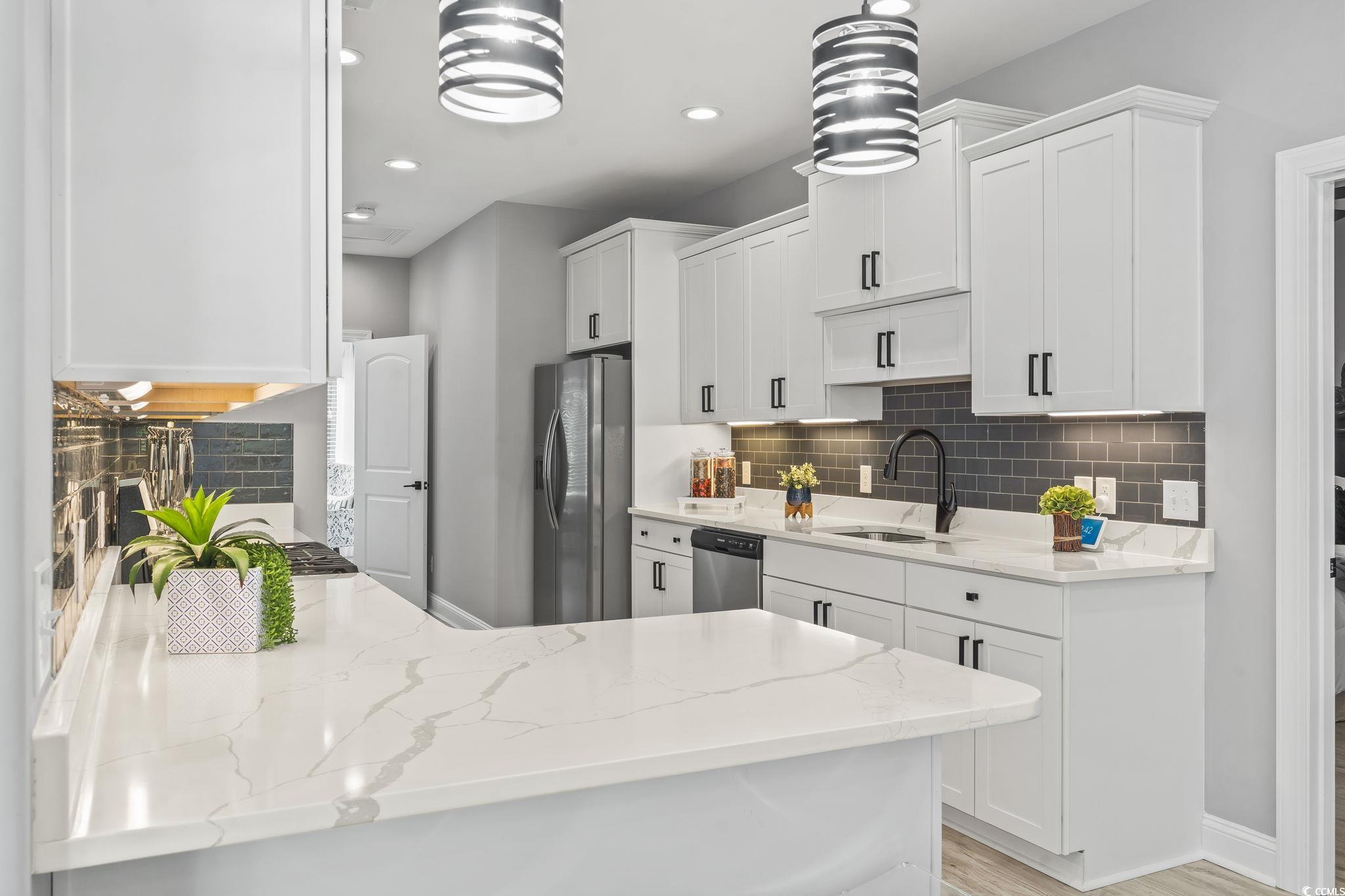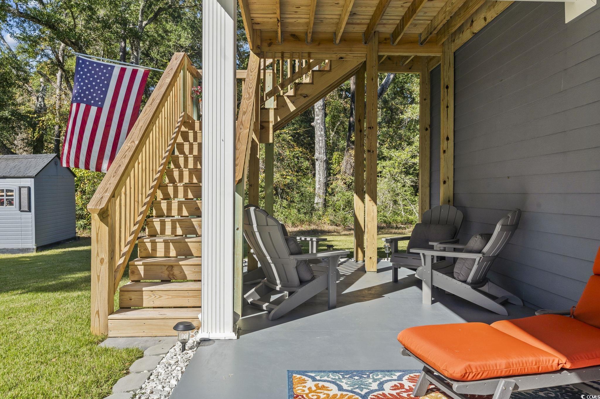 Coastal living at its finest - This Pristine 3 Bedroom, 3 Bath home with a Sunroom, Recreation Room, and Garage in Cherry Grove area of North Myrtle Beach offers ocean and saltwater marsh views! Stunning kitchen with stainless steel appliances, under-cabinet lighting, subway tile backsplash, quartz countertops, and a large walk-in pantry. Open living and dining areas with smooth vaulted ceilings and laminate flooring. Covered balcony (Trex deck) conveniently located off the living area. Bonus feature is the sunroom where you will love sipping coffee while enjoying ocean and marsh views. Sellers added rear steps for safety and convenience along with an upstairs patio. Spacious primary suite has a spa-inspired shower with full height tile surround and pebble stone floor, double sinks (quartz), linen closet, and a walk-in closet. Relax in the Jack and Jill bathroom: oversized soaking tub/shower, with tile surround to ceiling, and double vanity quartz sink. The third Bedroom was transformed into a dream closet/dressing room with a desk/makeup area, but can easily convert back. The downstairs recreation room with tile flooring features a full bath, storage closets and makes a perfect hobby, media room, or workout area. For your convenience, an Elevator shaft and wiring are in place. Garage is ideal for workshop, storage, or golf cart/motorcycle parking. Ample parking for guests including the additional side concrete pad (ideal for boat). Meticulously landscaped lawn with decorative rock detail, additional fill, premium Zoysia grass, irrigation system, accent lighting, and gutters with guards. No HOA and a detached storage building for tools and beach gear. Ideally located just minutes from the ocean, Intracoastal Waterway, and nearby boat ramps, this home offers a peaceful, nature-like setting surrounded by Coastal Beauty.